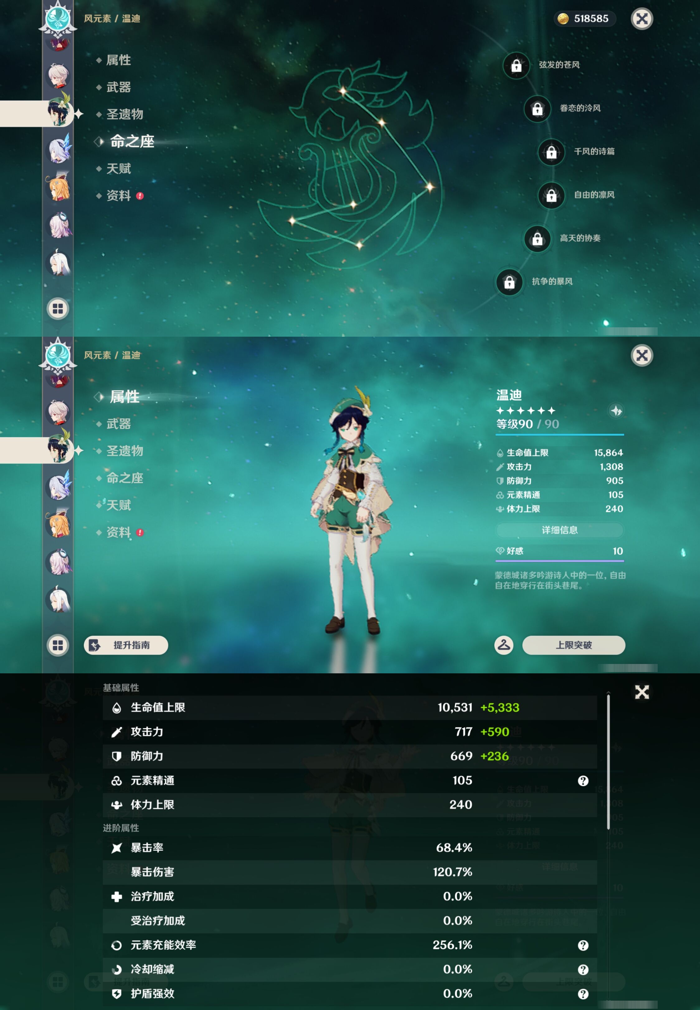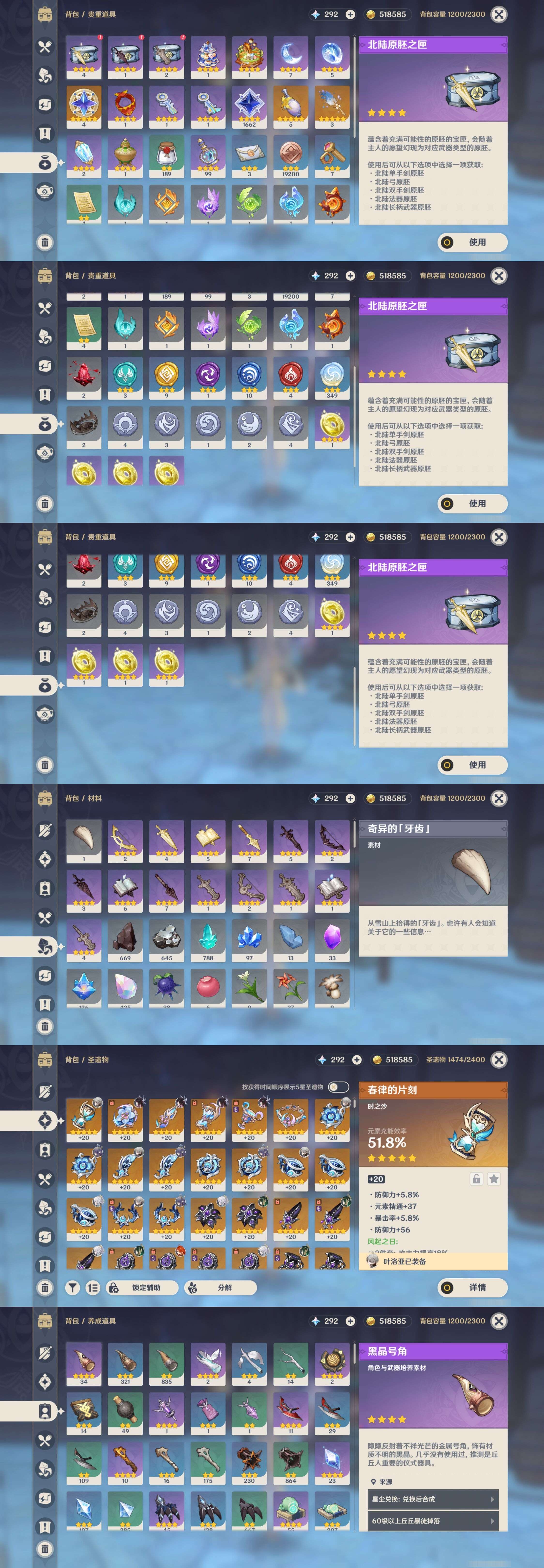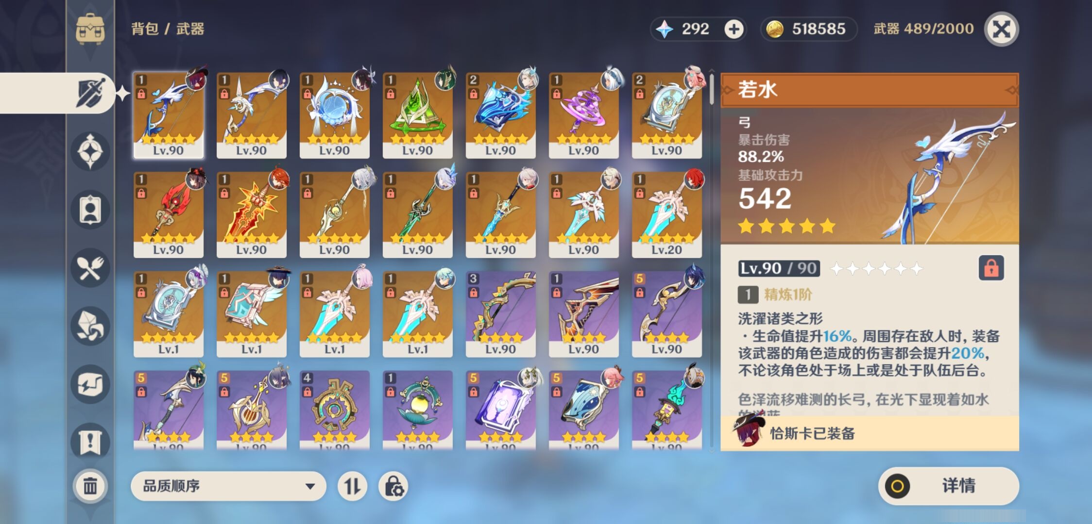 【18个五星武器】,精2万世流涌大典,精2四风原典,精1若水,精1护摩之杖,精1四风原典,精1阿莫斯之弓,精1焚曜千阳,精1天空之卷,精1帷间夜曲,精1朏魄含光,精1天空之傲,精1真语秘匣,精1磐岩结绿,精1天空之傲,精1苍古自由之誓,精1神乐之真意,精1天空之刃,精1天空之傲,7套,