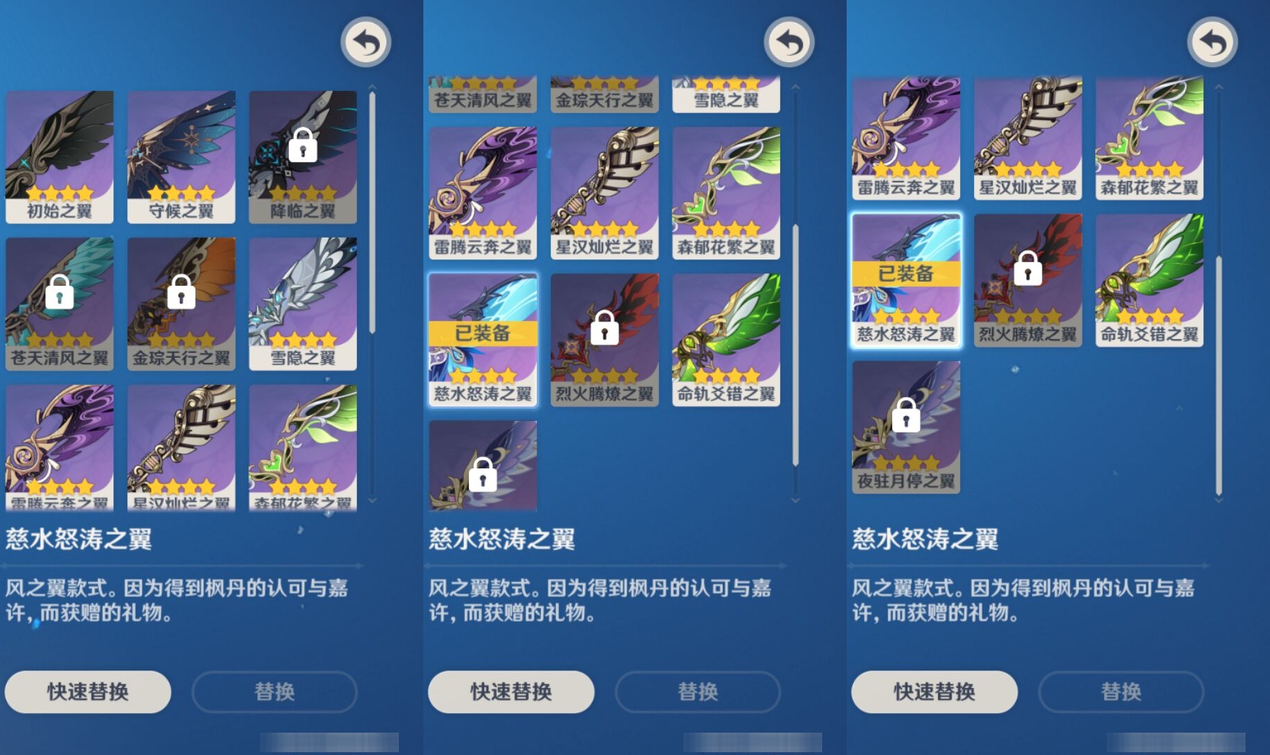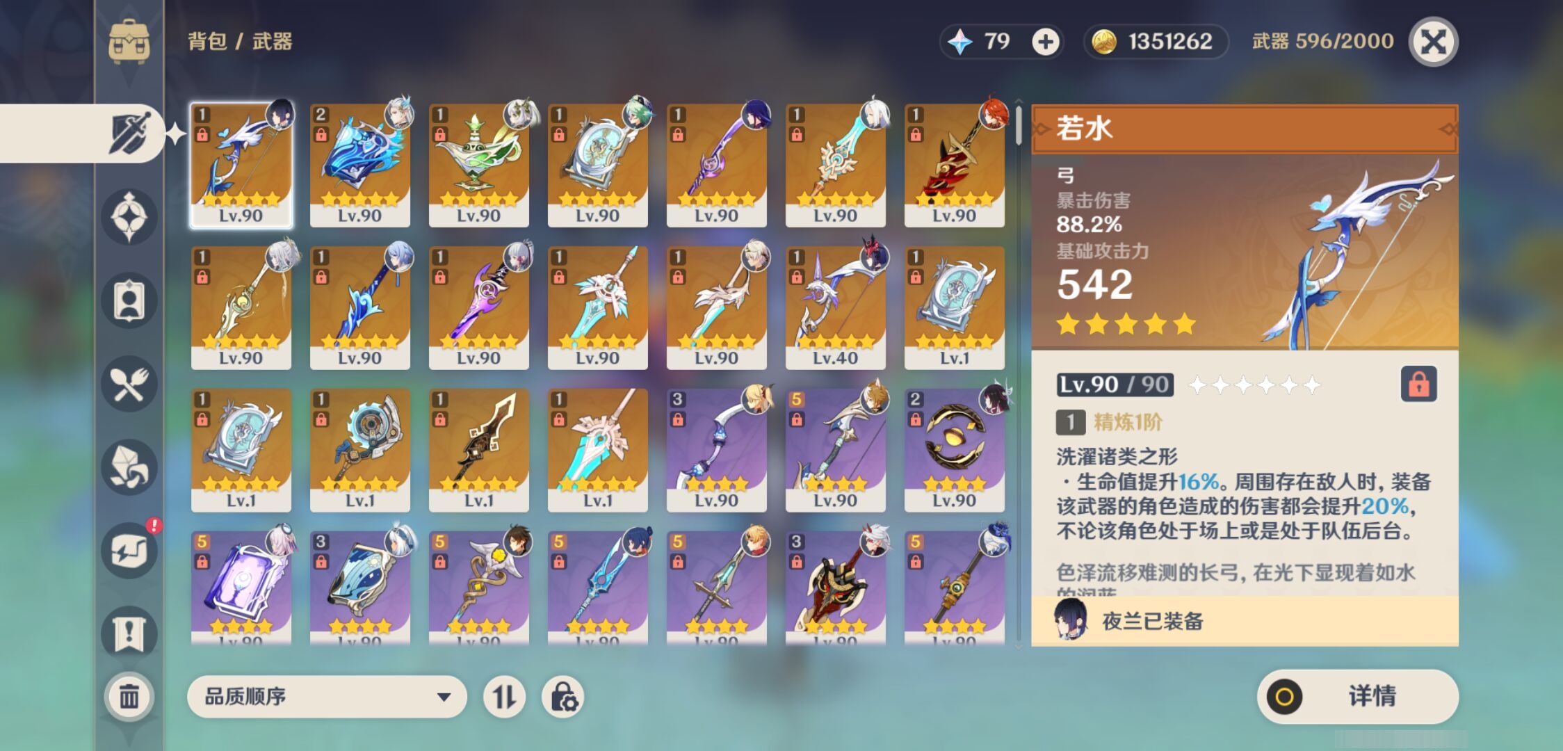 【18个五星武器】,精2万世流涌大典,精1若水,精1朏魄含光,精1四风原典,精1波乱月白经津,精1支离轮光,精1千夜浮梦,精1雾切之回光,精1贯虹之槊,精1四风原典,精1天空之刃,精1天空之傲,精1薙草之稻光,精1风鹰剑,精1阿莫斯之弓,精1天空之脊,精1赤角石溃杵,精1四风原典,8套,