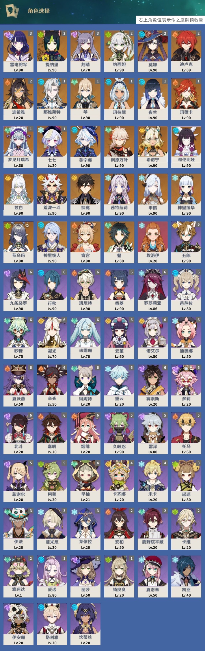 【29个五星角色】,3命雷电将军,3命提纳里,3命刻晴,2命纳西妲,2命莫娜,2命迪卢克,2命迪希雅,1命那维莱特,1命琴,1命玛拉妮,1命夜兰,1命玛薇卡,1命梦见月瑞希,1命七七,0命芙宁娜,0命枫原万叶,0命希诺宁,0命哥伦比娅,0命兹白,0命荒泷一斗,0命钟离,0命茜特菈莉,0命申鹤,0命神里绫华,0命菈乌玛,0命神里绫人,0命宵宫,0命魈,0命埃洛伊,
