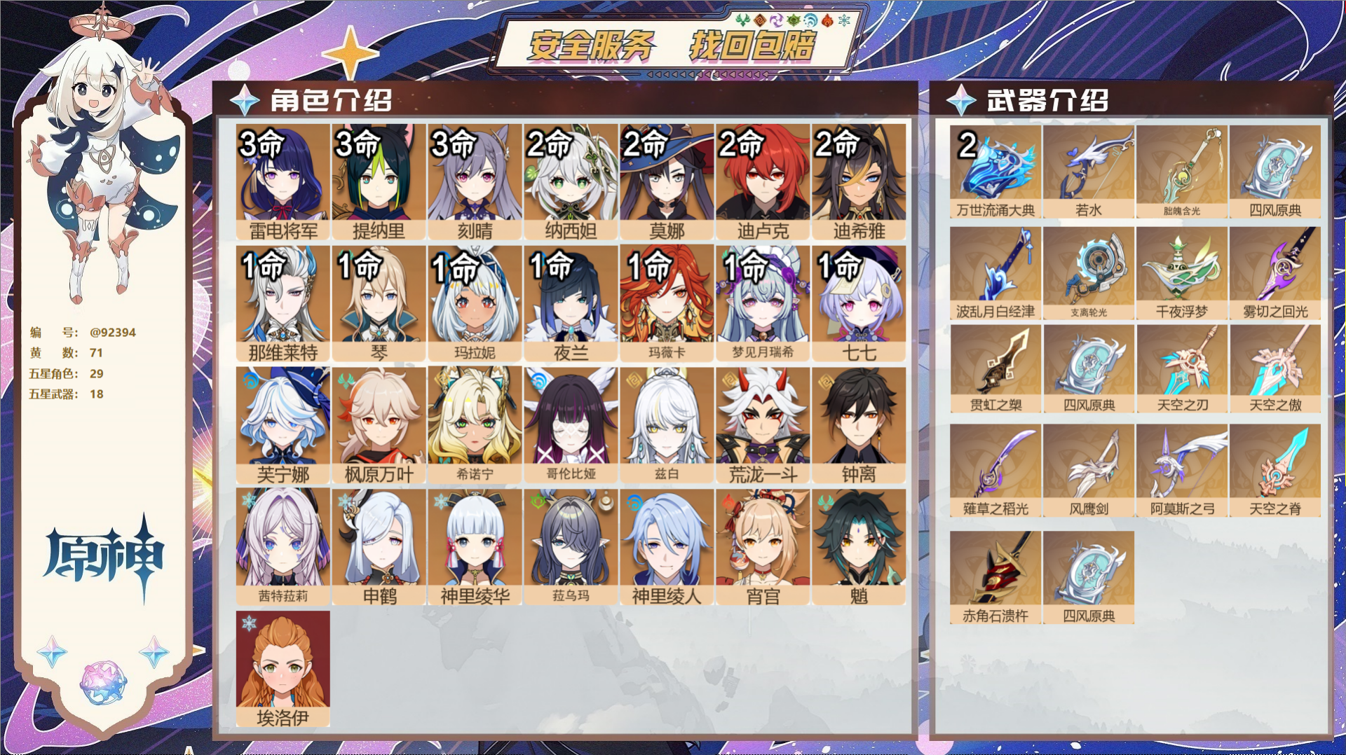 PX_2545549-,未绑定邮箱,,冒险等级60级,女主,71黄,29个五星角色,18个五星武器,纠缠之源0--原石79--圣遗物1989--【时装】,纱中幽兰,倩影游侠,极夜真梦,炽绘奇旅,帆影游风,聆雨听竹,雨化竹身,叶隐芳名,