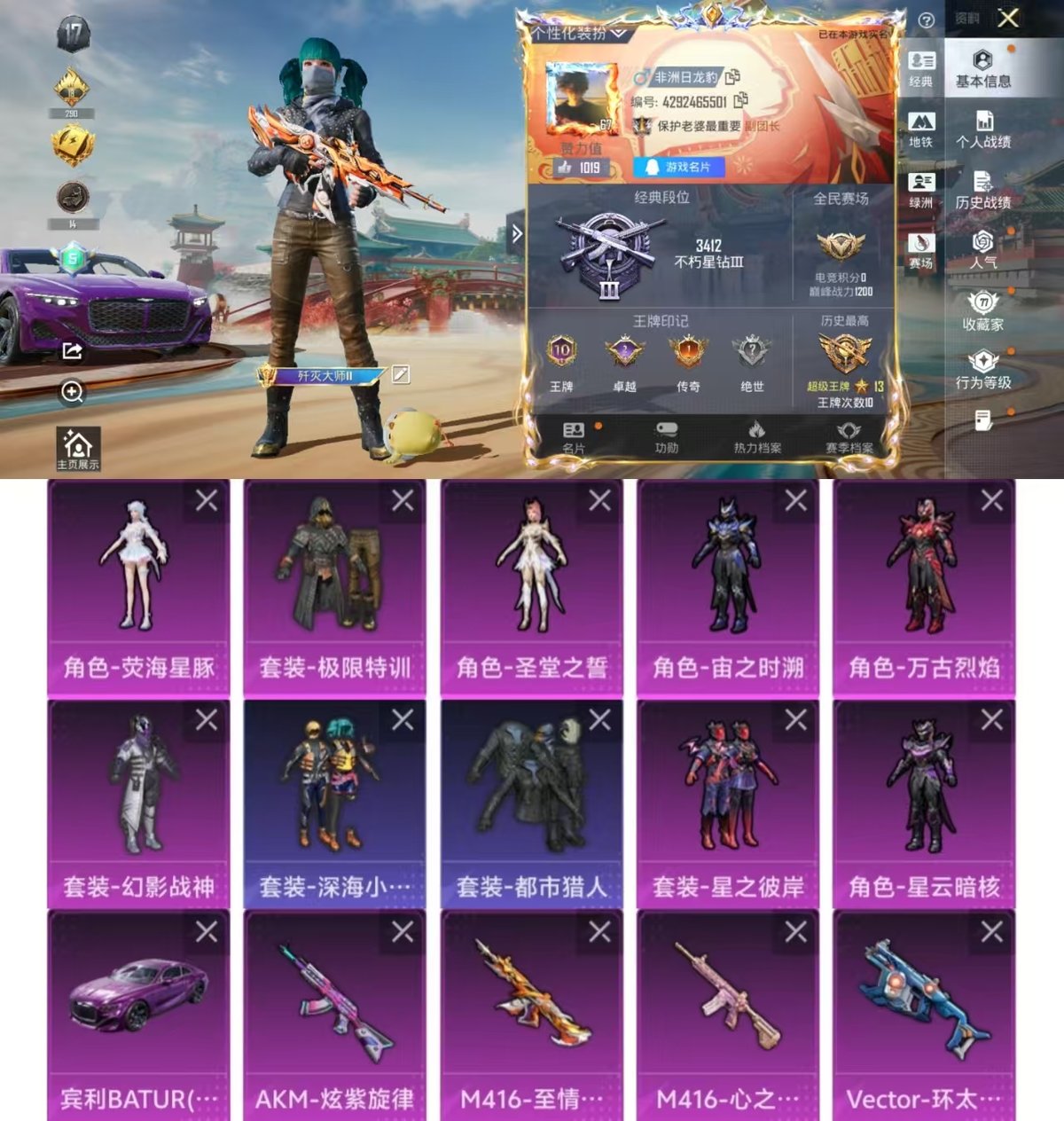 PX_2550501-实名:,可修改,时装数:,938,载具数:,1,枪械数:,347,战备数:,209,热门装扮:,极限特训,幻影战神,呆萌铁蟹,深海小丑鱼,梦魇先生,万圣娃娃,迅捷狂鲨,鹰眼刺客,爱崽白熊,都市猎人,PEL轰鸣竞梦者,星之彼岸,大橘为重,奇迹天团,万古烈焰,宙之时溯,星云暗核,圣堂之誓,荧海星豚,载具:,宾利BATUR(极速紫),稀有枪皮:,AKM炫紫旋律,M416心之恋语,Vector环太平洋,M416至情至圣,AMR炫光之旅,MK14闲梦青缨,AKM绿萝繁花,SCAR-L-锦绣绵绵,Kar98K-巳巳如意,DP-28-豹影疾电