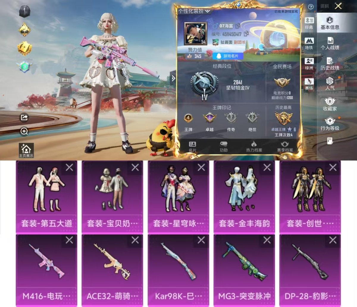 PX_2550540-实名:,可修改,时装数:,445,枪械数:,196,战备数:,120,热门装扮:,宝贝奶油派,第五大道,创世·救赎,金丰海韵,星穹咏叹调,稀有枪皮:,M416电玩时刻,MG3-突变脉冲,Kar98K-巳巳如意,DP-28-豹影疾电,ACE32-萌骑漫游