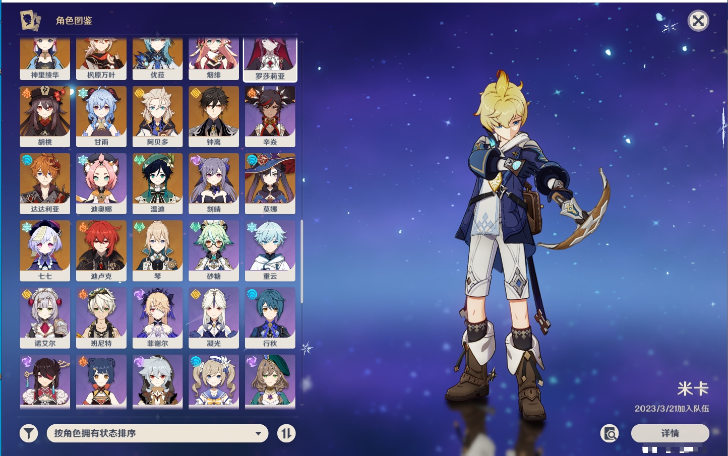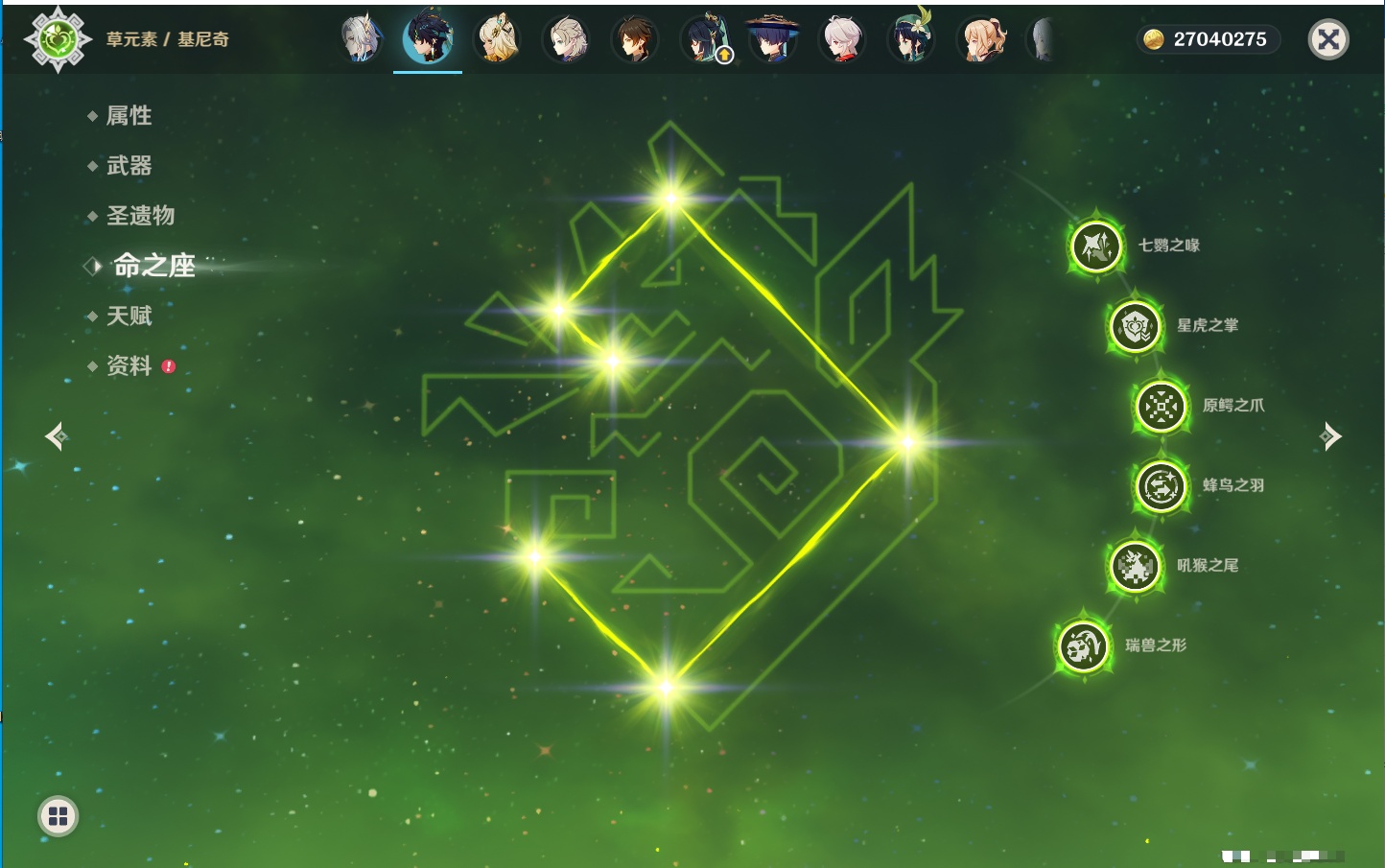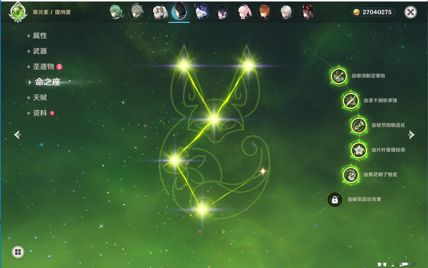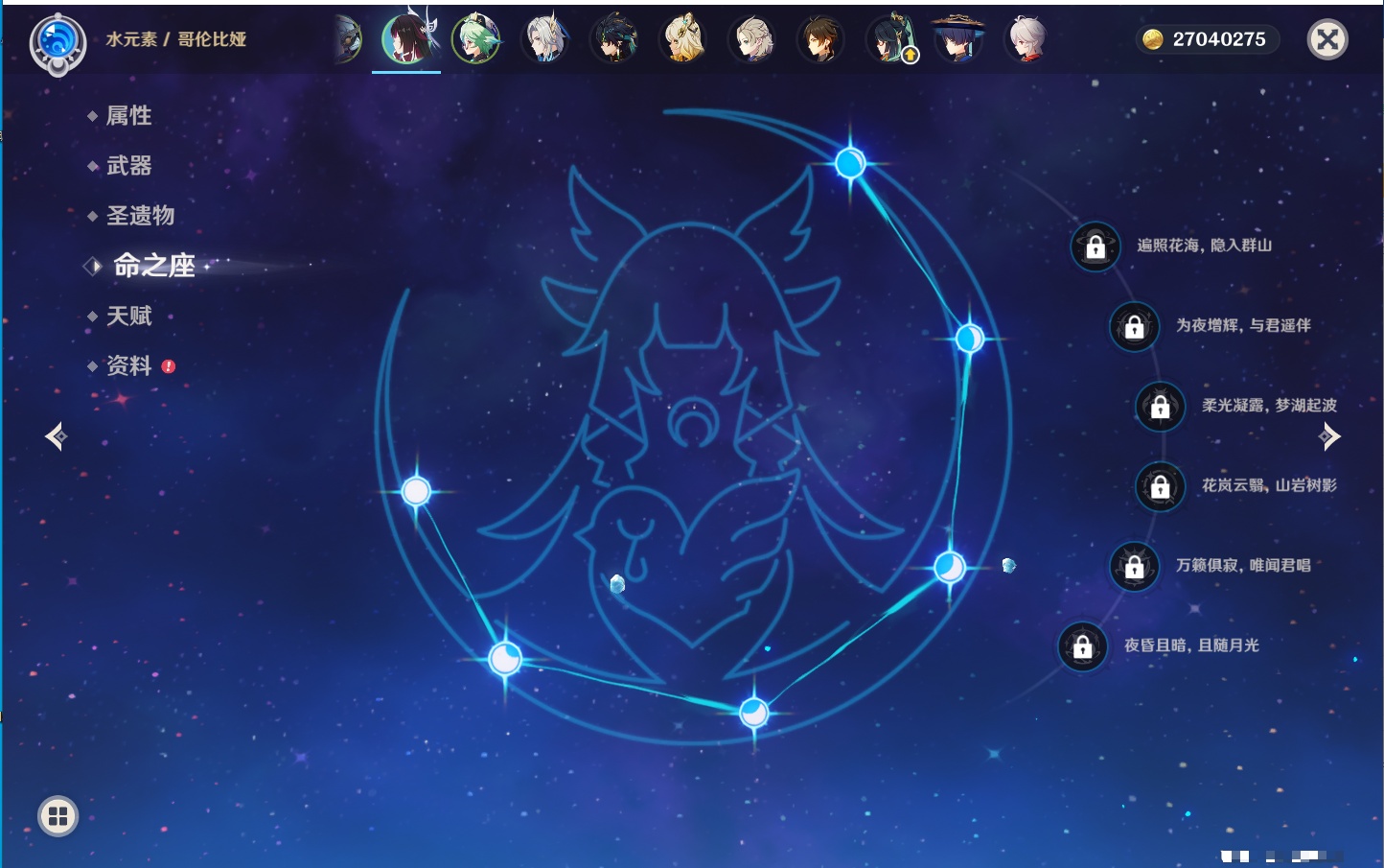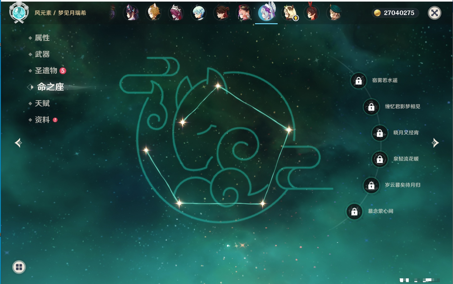 【37个五星角色】,满命那维莱特,满命赛诺,满命夜兰,满命神里绫华,满命刻晴,满命七七,满命琴,满命莫娜,满命基尼奇,5命提纳里,4命迪卢克,3命雷电将军,2命克洛琳德,2命达达利亚,1命纳西妲,1命钟离,1命胡桃,1命温迪,1命菲林斯,0命阿蕾奇诺,0命闲云,0命芙宁娜,0命白术,0命艾尔海森,0命流浪者,0命八重神子,0命申鹤,0命优菈,0命枫原万叶,0命甘雨,0命阿贝多,0命珊瑚宫心海,0命伊涅芙,0命哥伦比娅,0命希诺宁,0命丝柯克,0命梦见月瑞希,