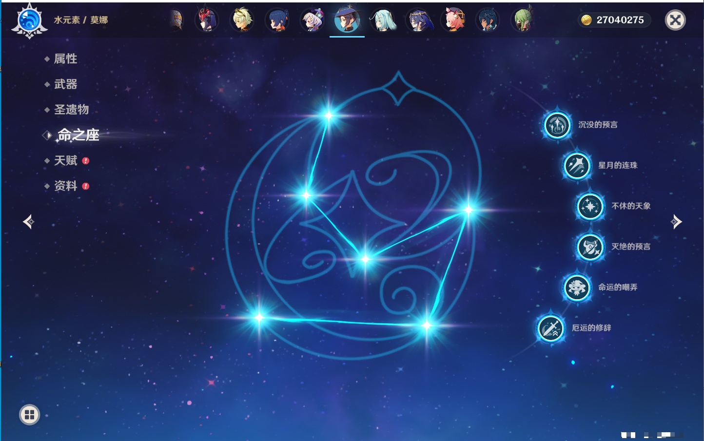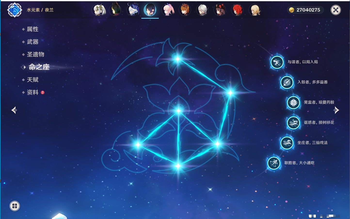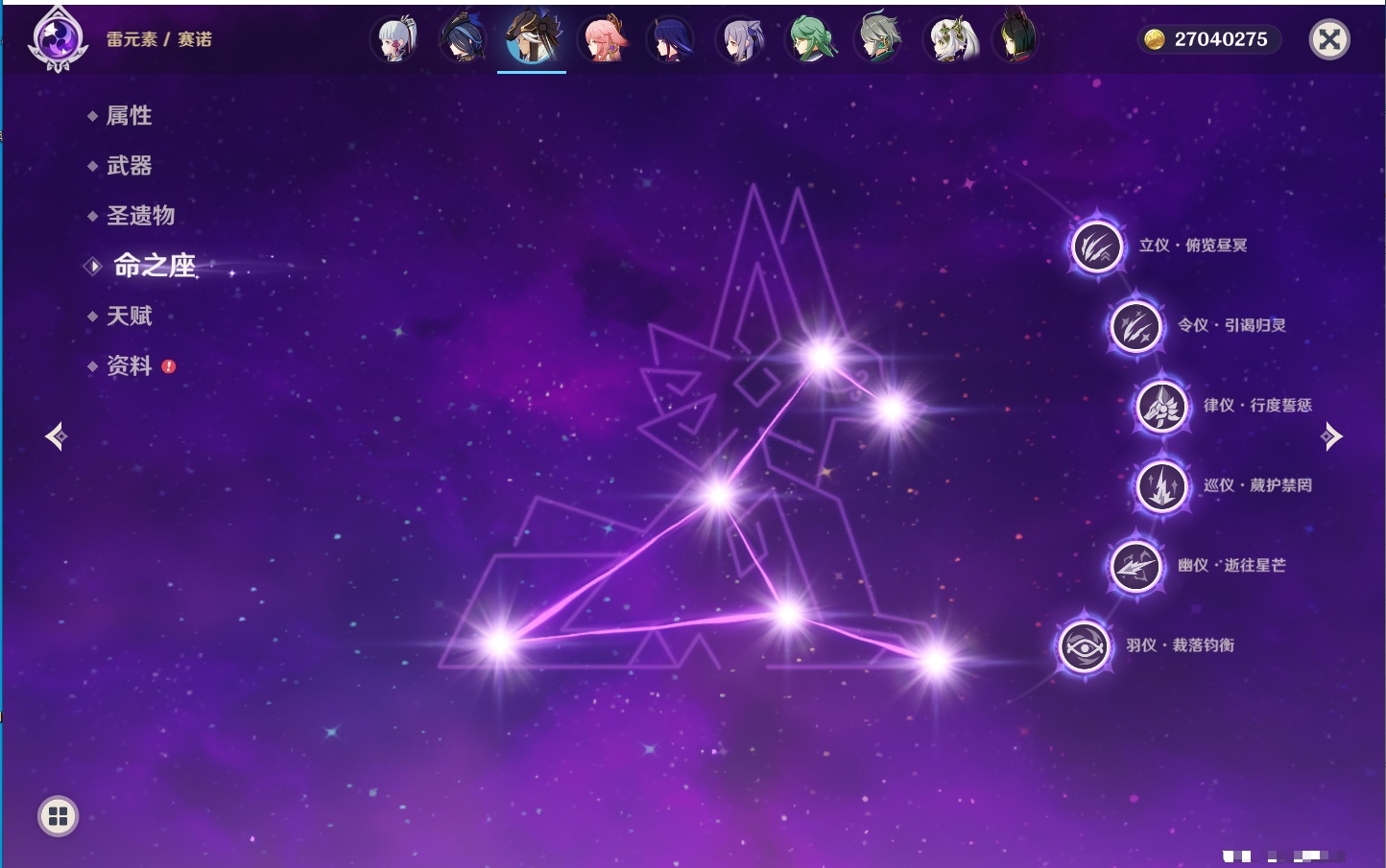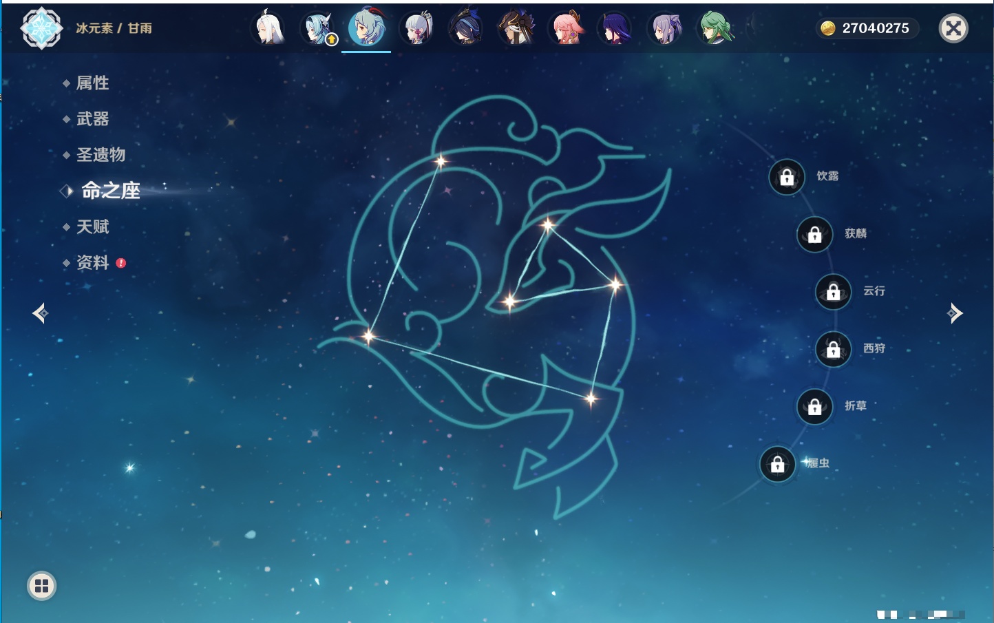 【37个五星角色】,满命那维莱特,满命赛诺,满命夜兰,满命神里绫华,满命刻晴,满命七七,满命琴,满命莫娜,满命基尼奇,5命提纳里,4命迪卢克,3命雷电将军,2命克洛琳德,2命达达利亚,1命纳西妲,1命钟离,1命胡桃,1命温迪,1命菲林斯,0命阿蕾奇诺,0命闲云,0命芙宁娜,0命白术,0命艾尔海森,0命流浪者,0命八重神子,0命申鹤,0命优菈,0命枫原万叶,0命甘雨,0命阿贝多,0命珊瑚宫心海,0命伊涅芙,0命哥伦比娅,0命希诺宁,0命丝柯克,0命梦见月瑞希,