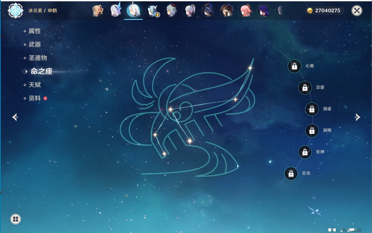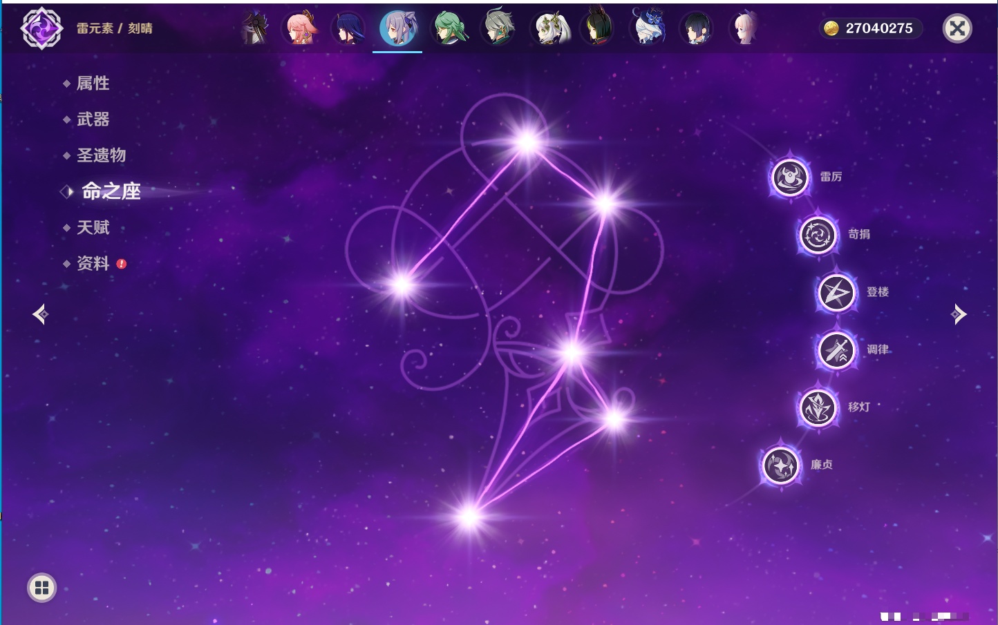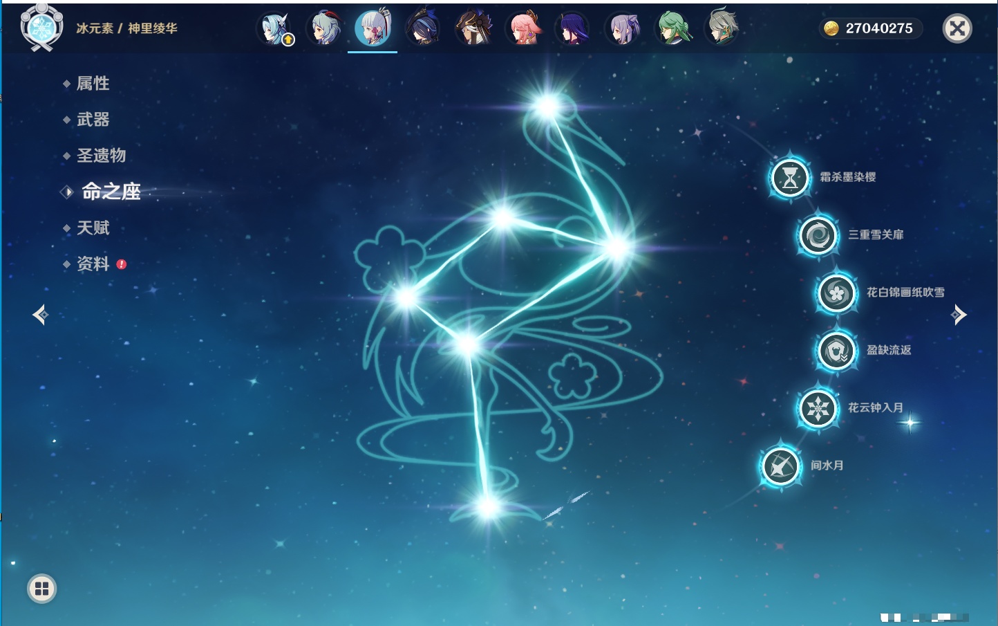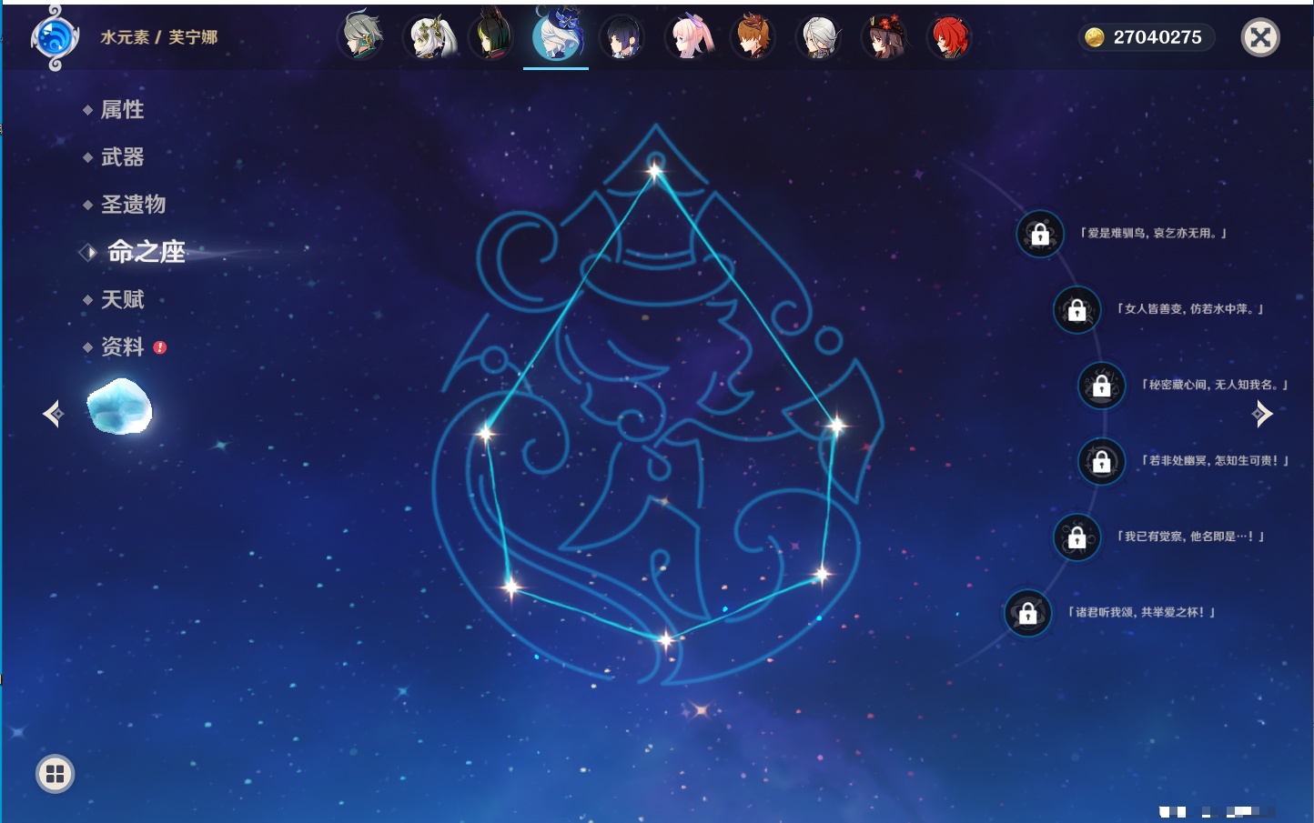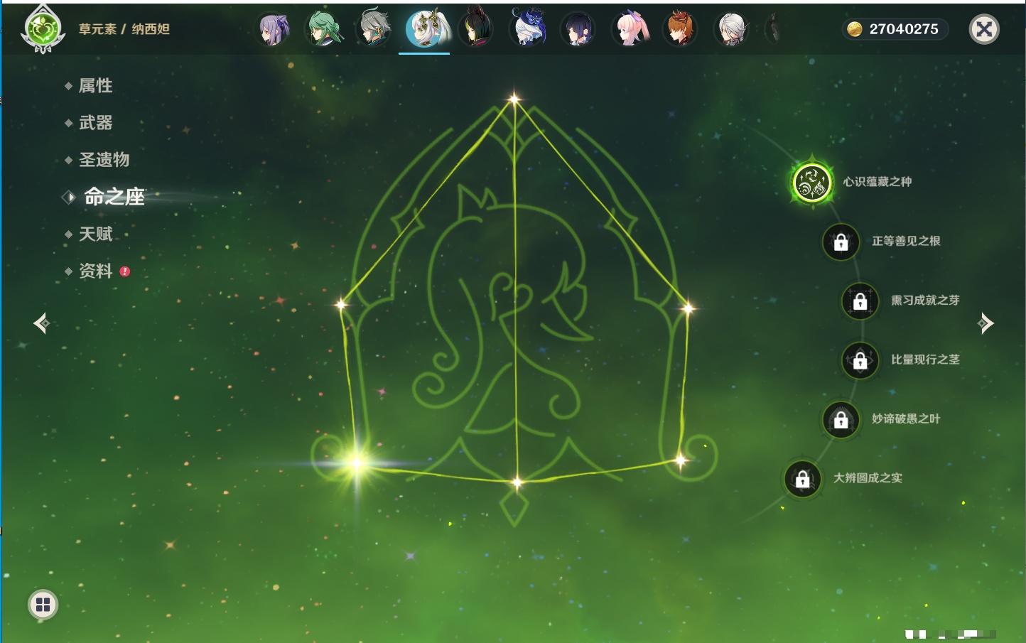【37个五星角色】,满命那维莱特,满命赛诺,满命夜兰,满命神里绫华,满命刻晴,满命七七,满命琴,满命莫娜,满命基尼奇,5命提纳里,4命迪卢克,3命雷电将军,2命克洛琳德,2命达达利亚,1命纳西妲,1命钟离,1命胡桃,1命温迪,1命菲林斯,0命阿蕾奇诺,0命闲云,0命芙宁娜,0命白术,0命艾尔海森,0命流浪者,0命八重神子,0命申鹤,0命优菈,0命枫原万叶,0命甘雨,0命阿贝多,0命珊瑚宫心海,0命伊涅芙,0命哥伦比娅,0命希诺宁,0命丝柯克,0命梦见月瑞希,