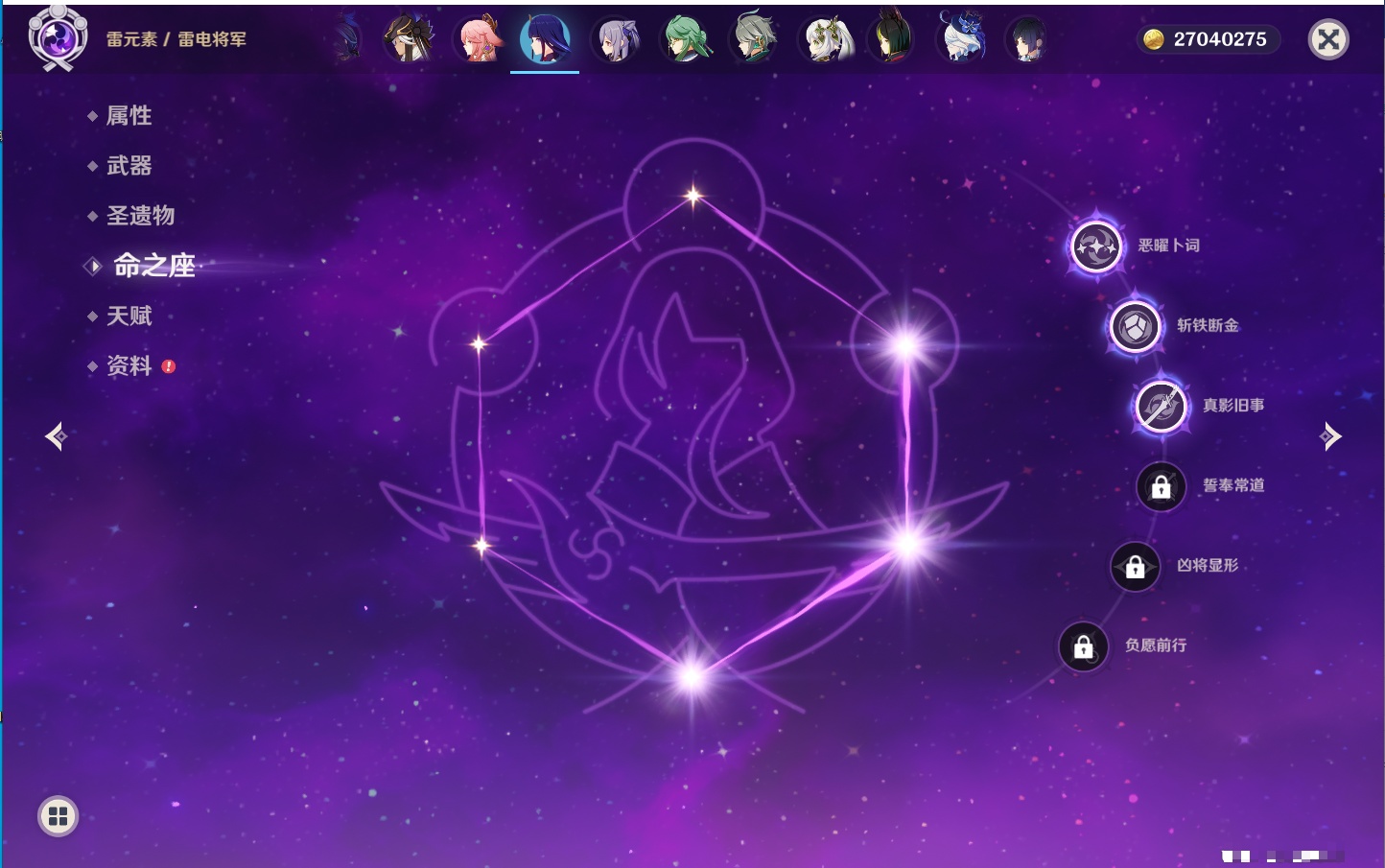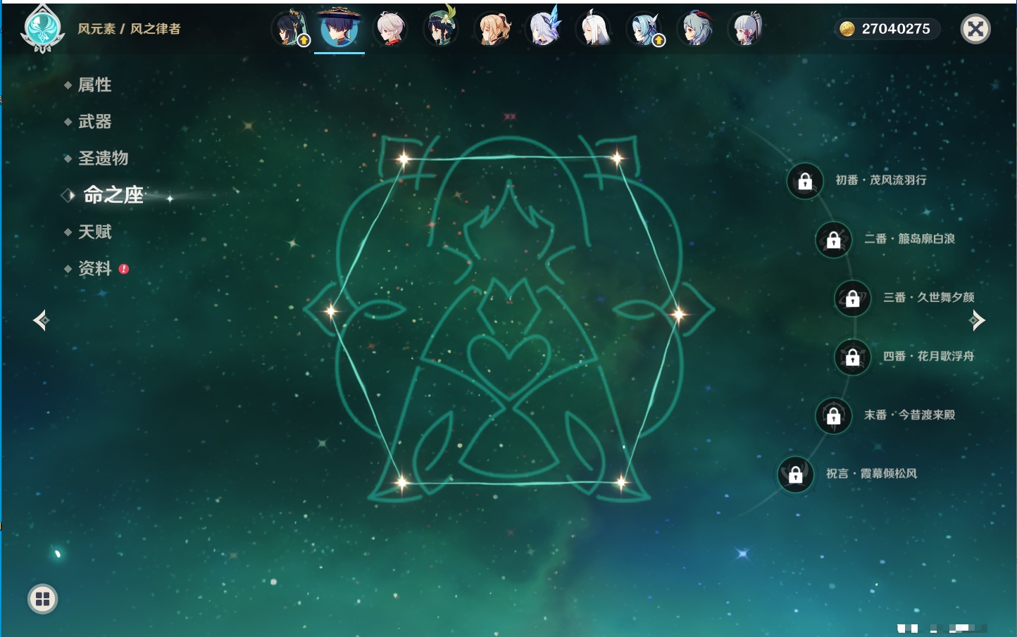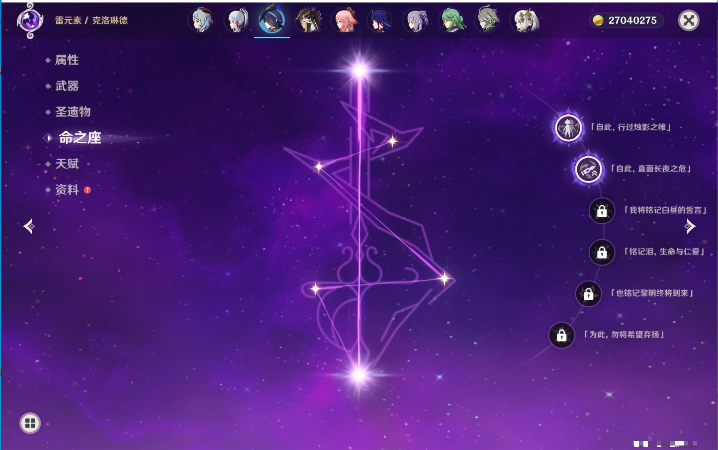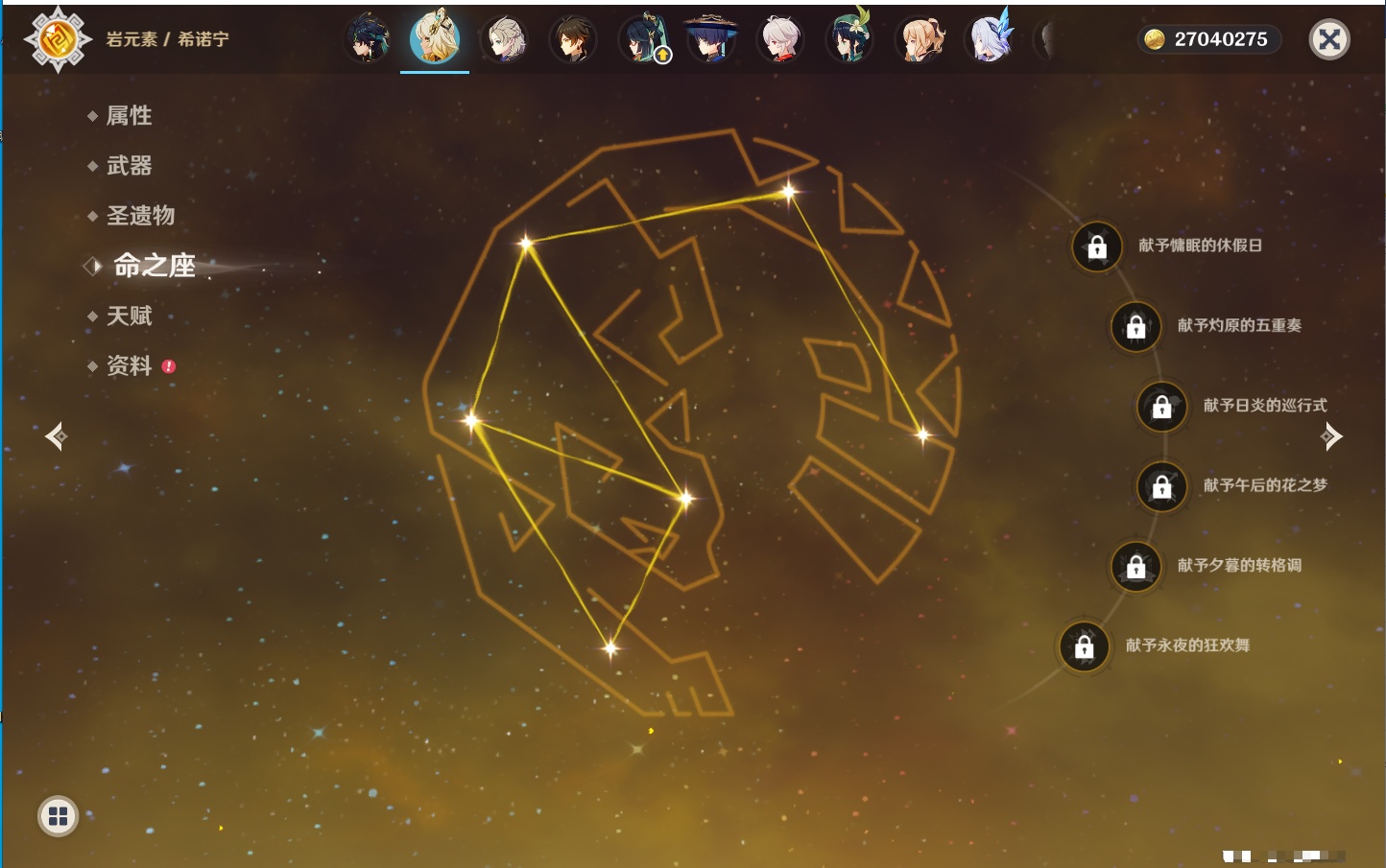 【37个五星角色】,满命那维莱特,满命赛诺,满命夜兰,满命神里绫华,满命刻晴,满命七七,满命琴,满命莫娜,满命基尼奇,5命提纳里,4命迪卢克,3命雷电将军,2命克洛琳德,2命达达利亚,1命纳西妲,1命钟离,1命胡桃,1命温迪,1命菲林斯,0命阿蕾奇诺,0命闲云,0命芙宁娜,0命白术,0命艾尔海森,0命流浪者,0命八重神子,0命申鹤,0命优菈,0命枫原万叶,0命甘雨,0命阿贝多,0命珊瑚宫心海,0命伊涅芙,0命哥伦比娅,0命希诺宁,0命丝柯克,0命梦见月瑞希,