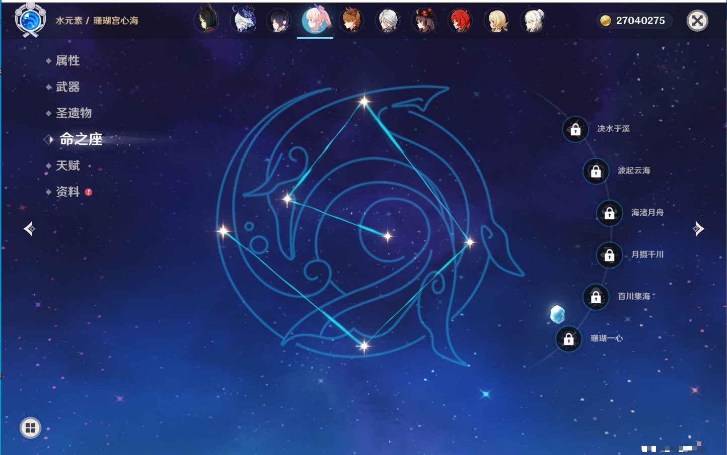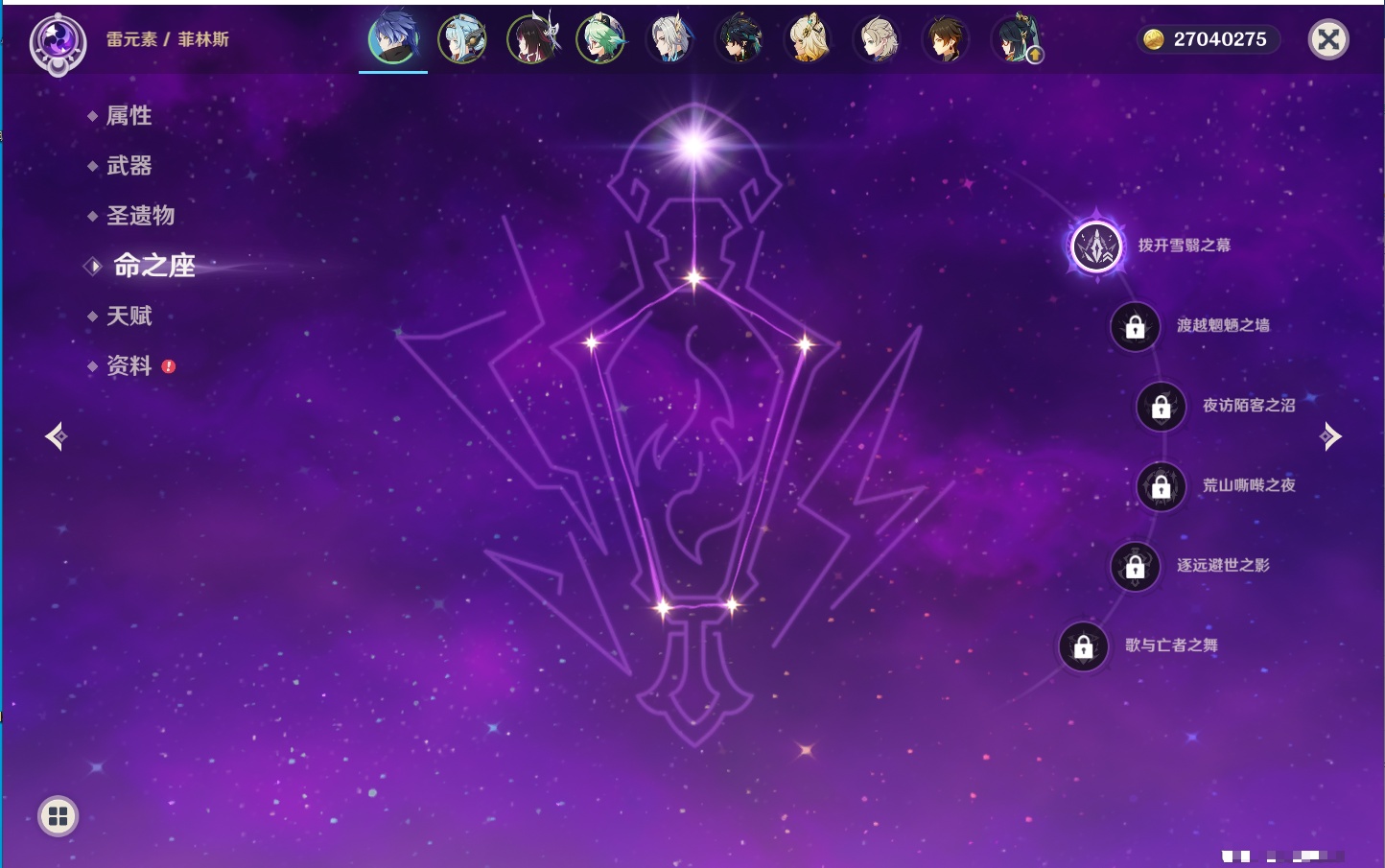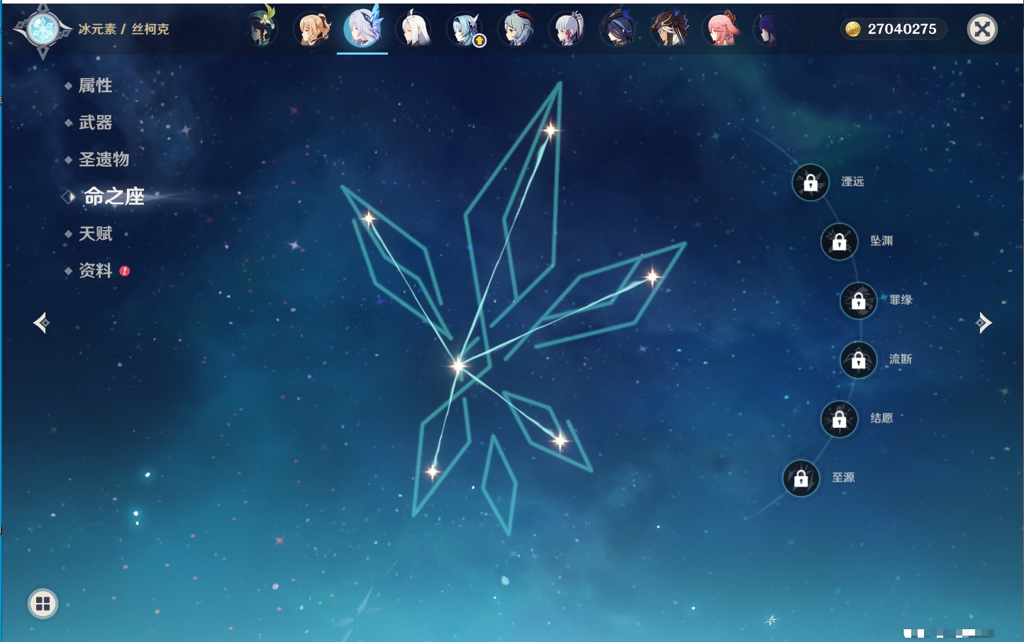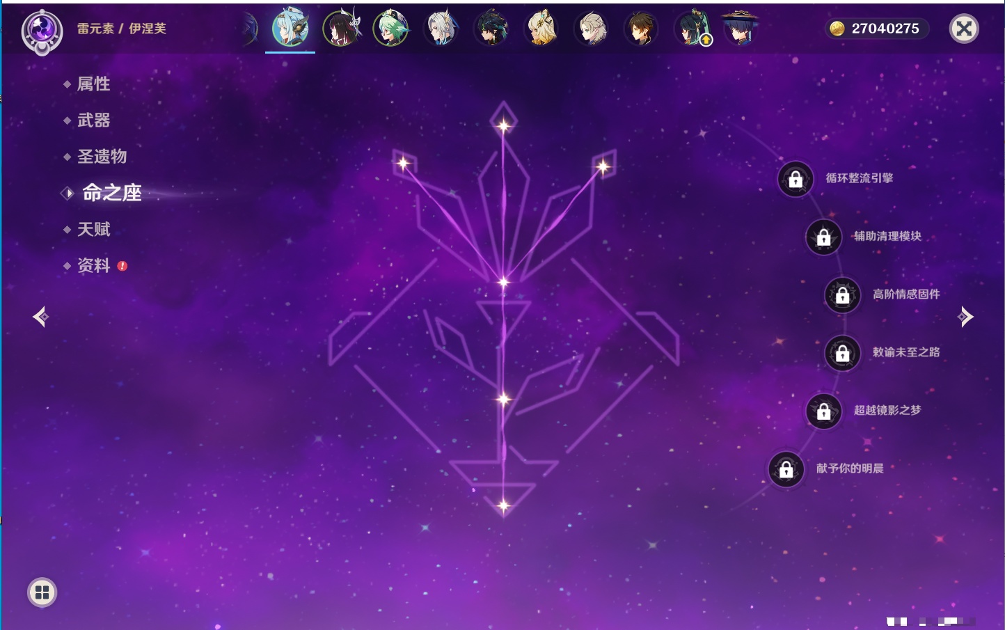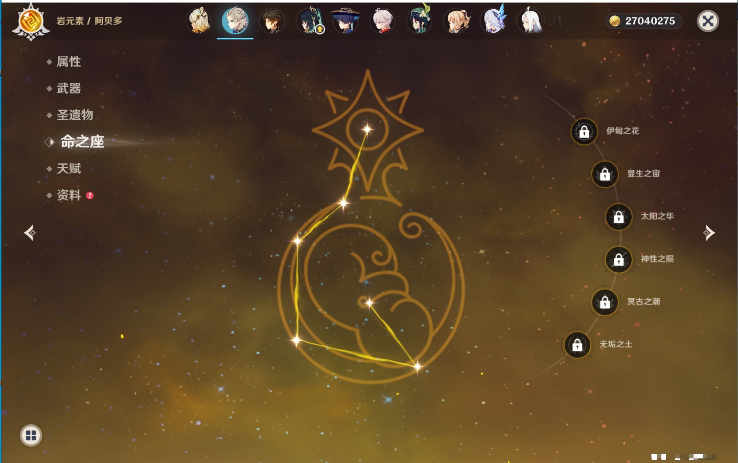 【37个五星角色】,满命那维莱特,满命赛诺,满命夜兰,满命神里绫华,满命刻晴,满命七七,满命琴,满命莫娜,满命基尼奇,5命提纳里,4命迪卢克,3命雷电将军,2命克洛琳德,2命达达利亚,1命纳西妲,1命钟离,1命胡桃,1命温迪,1命菲林斯,0命阿蕾奇诺,0命闲云,0命芙宁娜,0命白术,0命艾尔海森,0命流浪者,0命八重神子,0命申鹤,0命优菈,0命枫原万叶,0命甘雨,0命阿贝多,0命珊瑚宫心海,0命伊涅芙,0命哥伦比娅,0命希诺宁,0命丝柯克,0命梦见月瑞希,