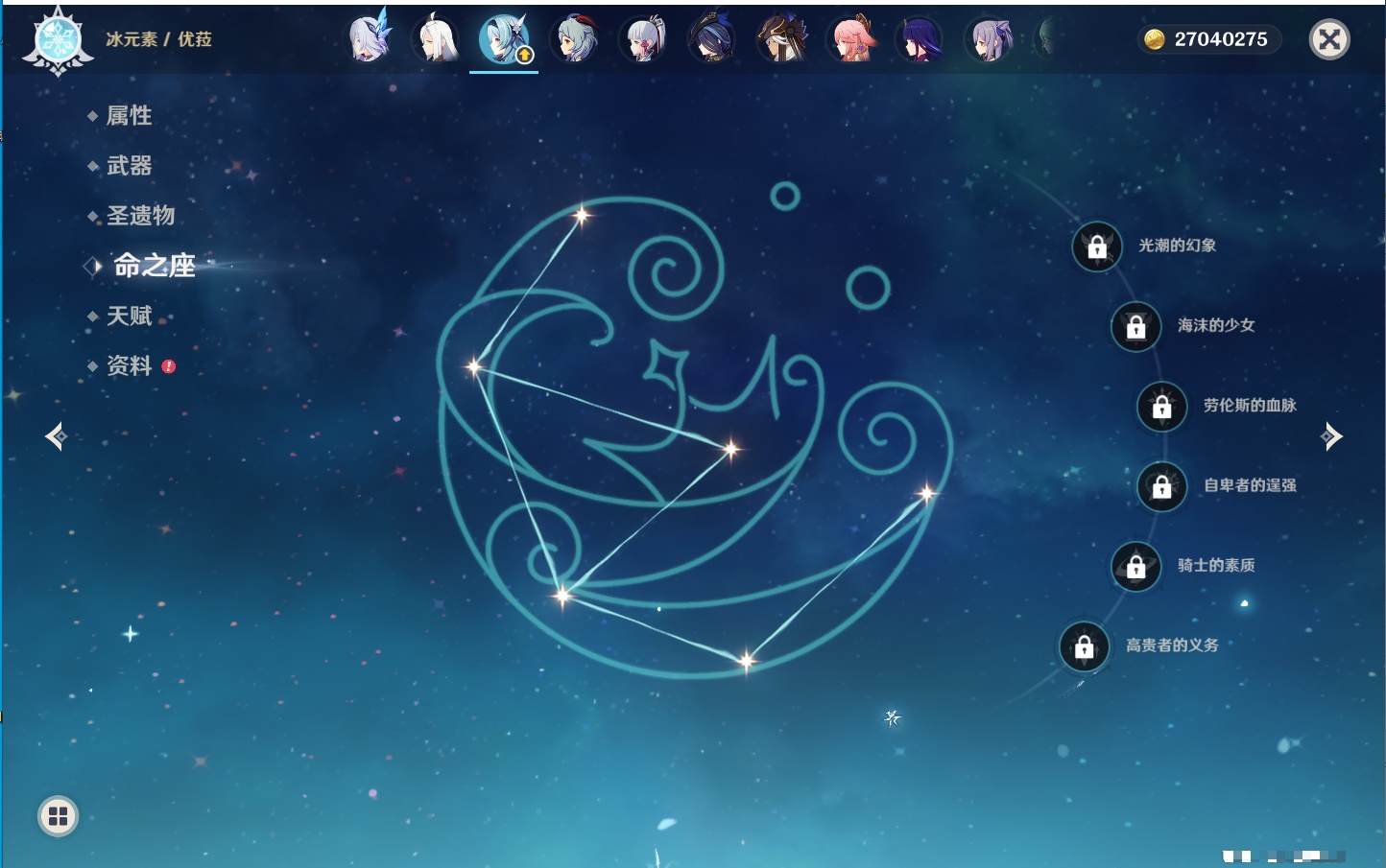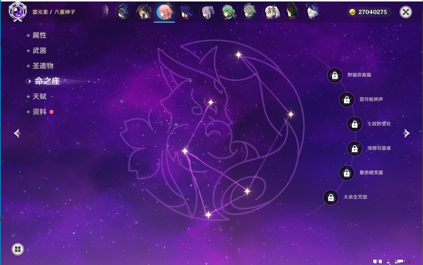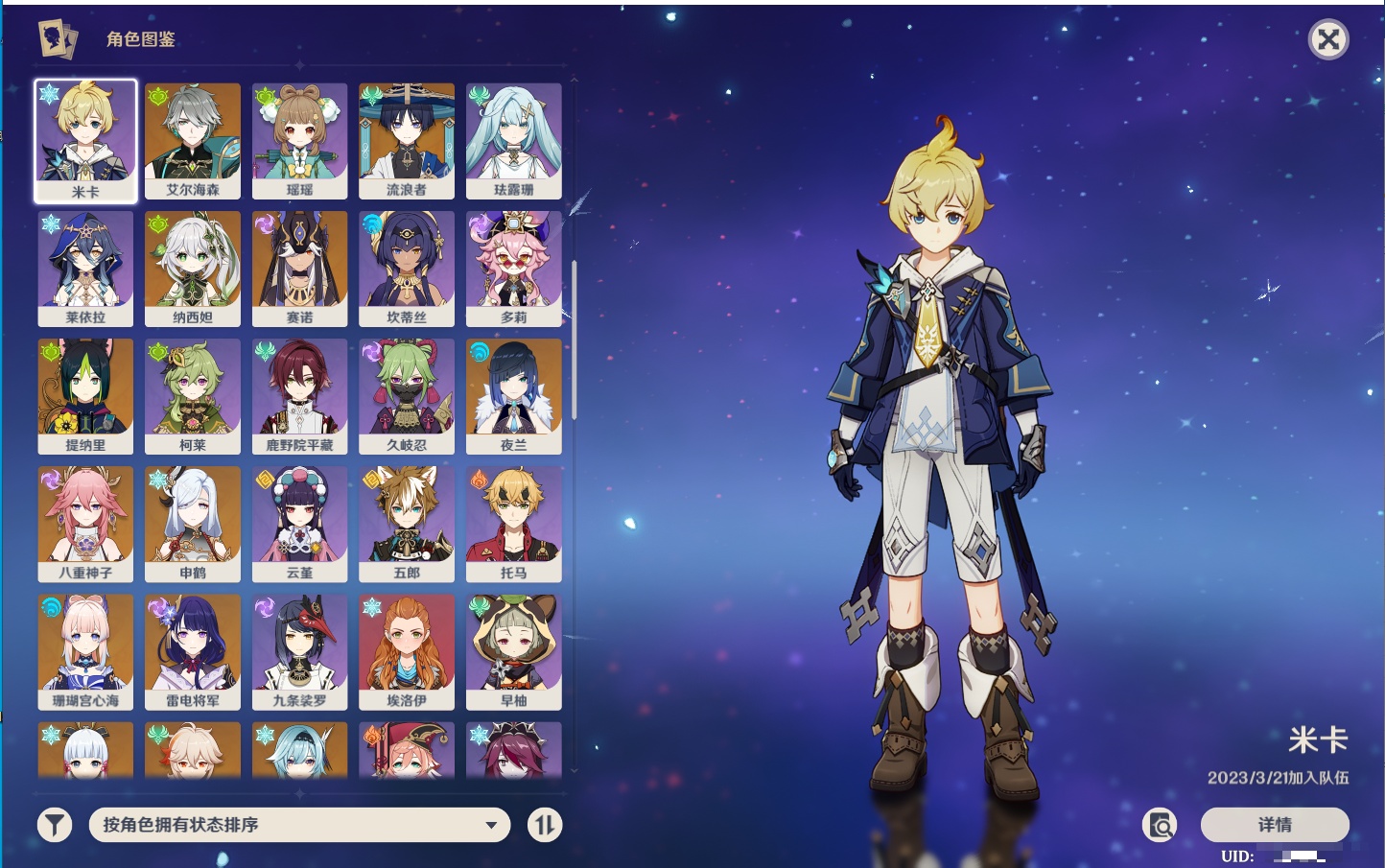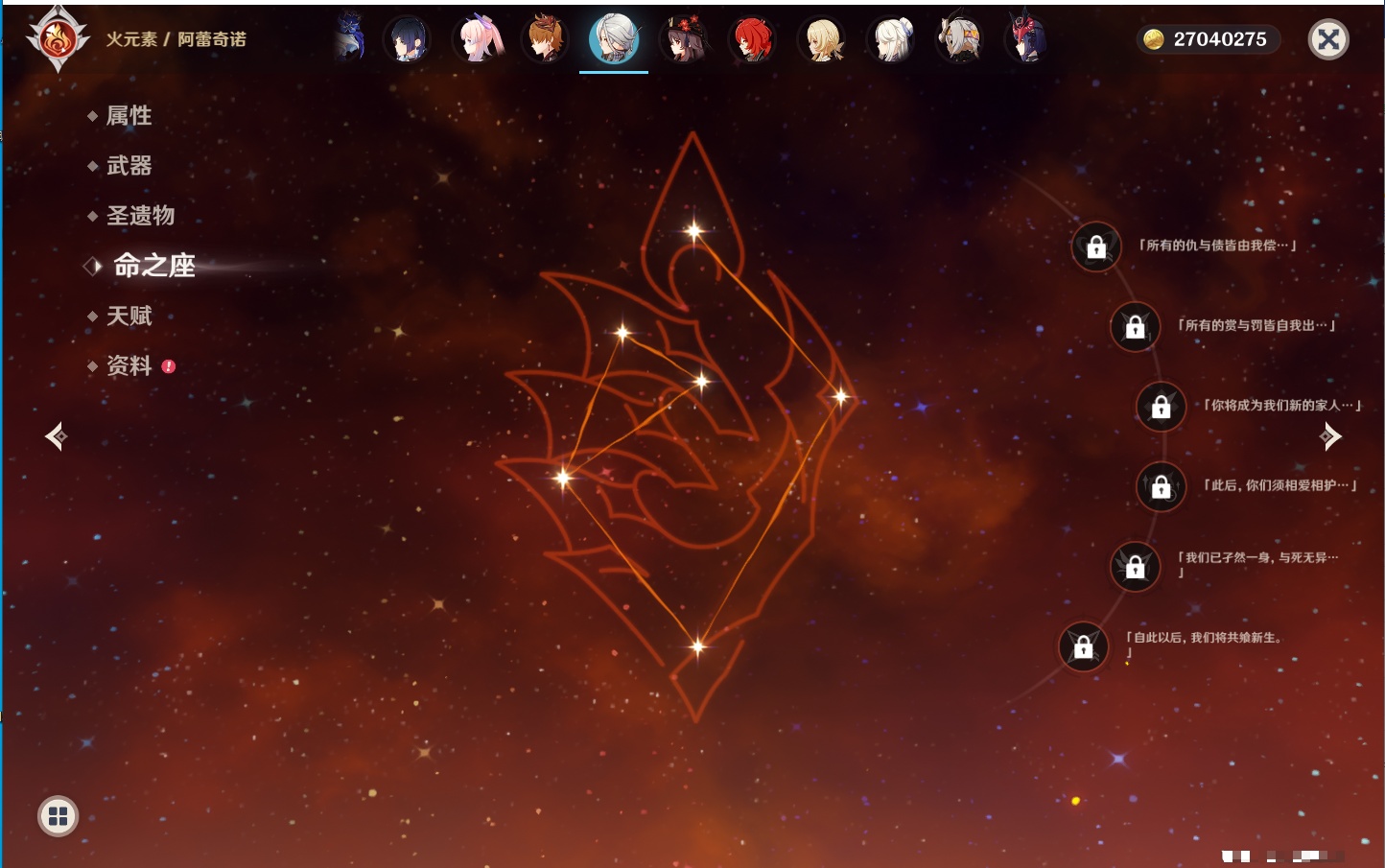 【37个五星角色】,满命那维莱特,满命赛诺,满命夜兰,满命神里绫华,满命刻晴,满命七七,满命琴,满命莫娜,满命基尼奇,5命提纳里,4命迪卢克,3命雷电将军,2命克洛琳德,2命达达利亚,1命纳西妲,1命钟离,1命胡桃,1命温迪,1命菲林斯,0命阿蕾奇诺,0命闲云,0命芙宁娜,0命白术,0命艾尔海森,0命流浪者,0命八重神子,0命申鹤,0命优菈,0命枫原万叶,0命甘雨,0命阿贝多,0命珊瑚宫心海,0命伊涅芙,0命哥伦比娅,0命希诺宁,0命丝柯克,0命梦见月瑞希,