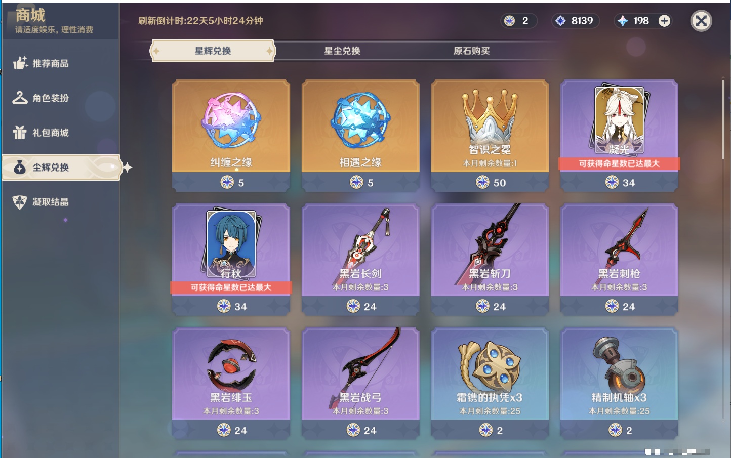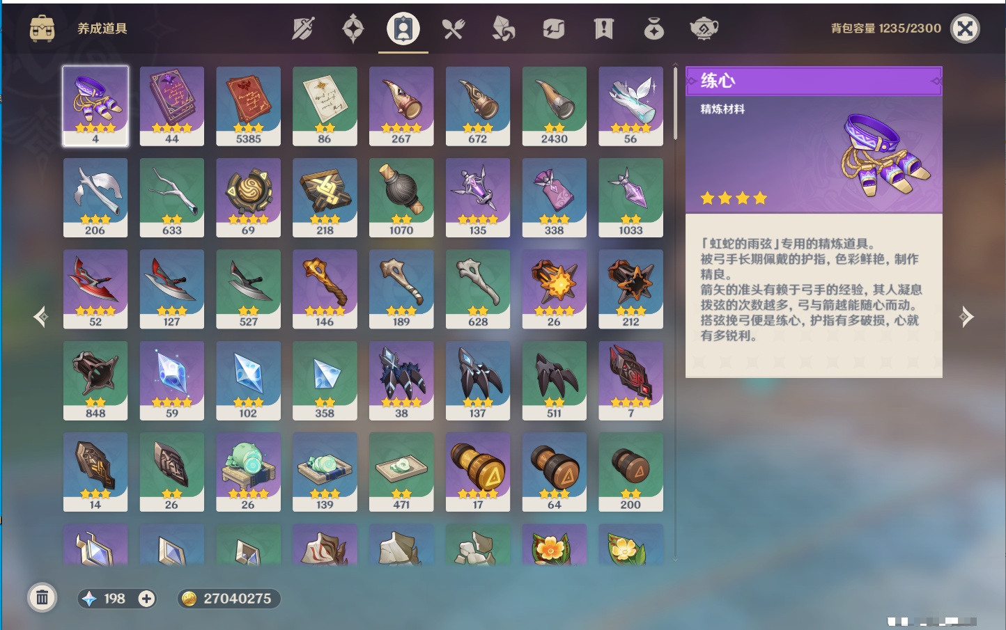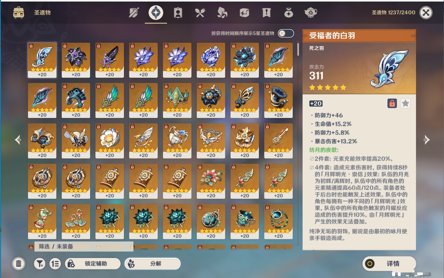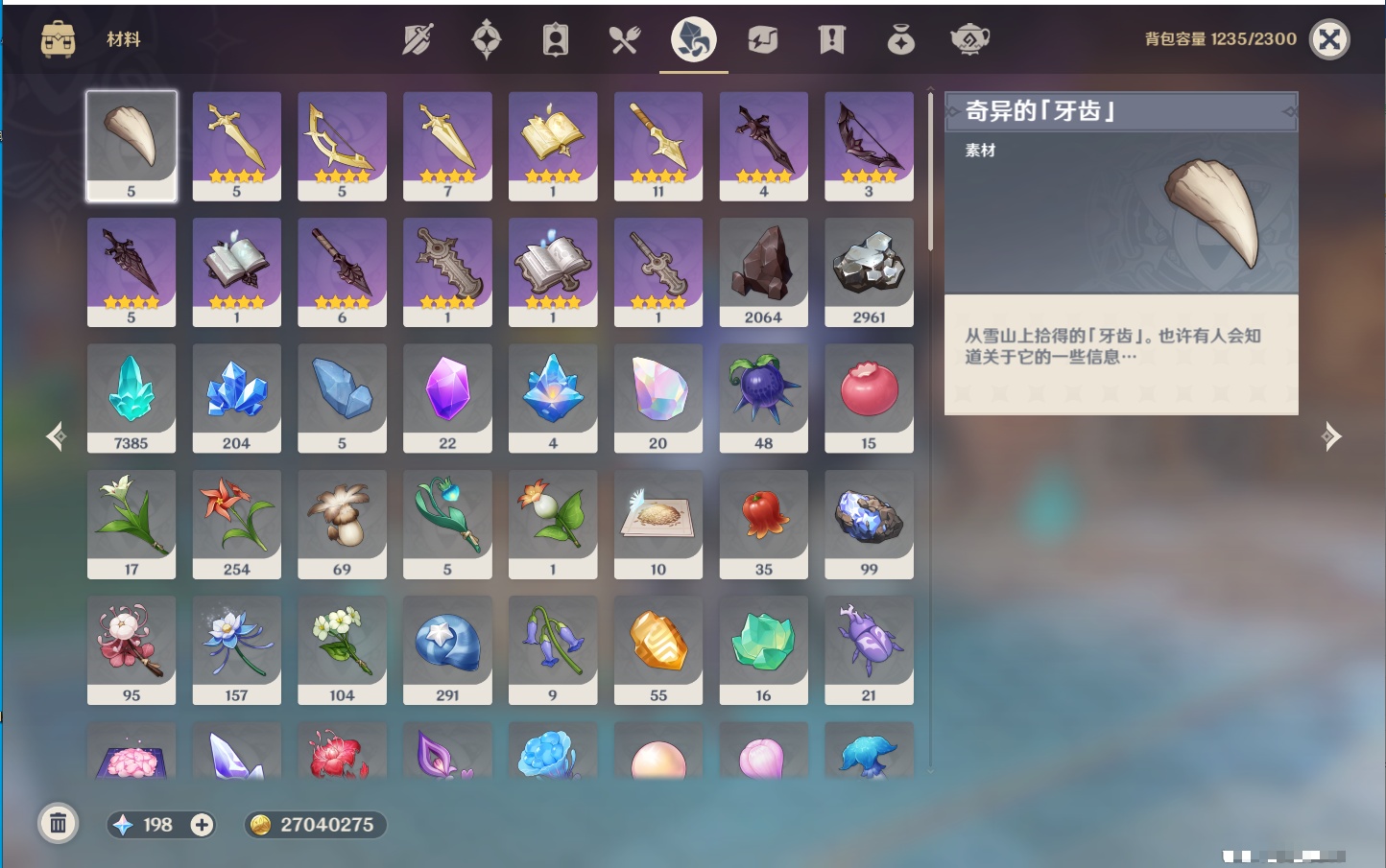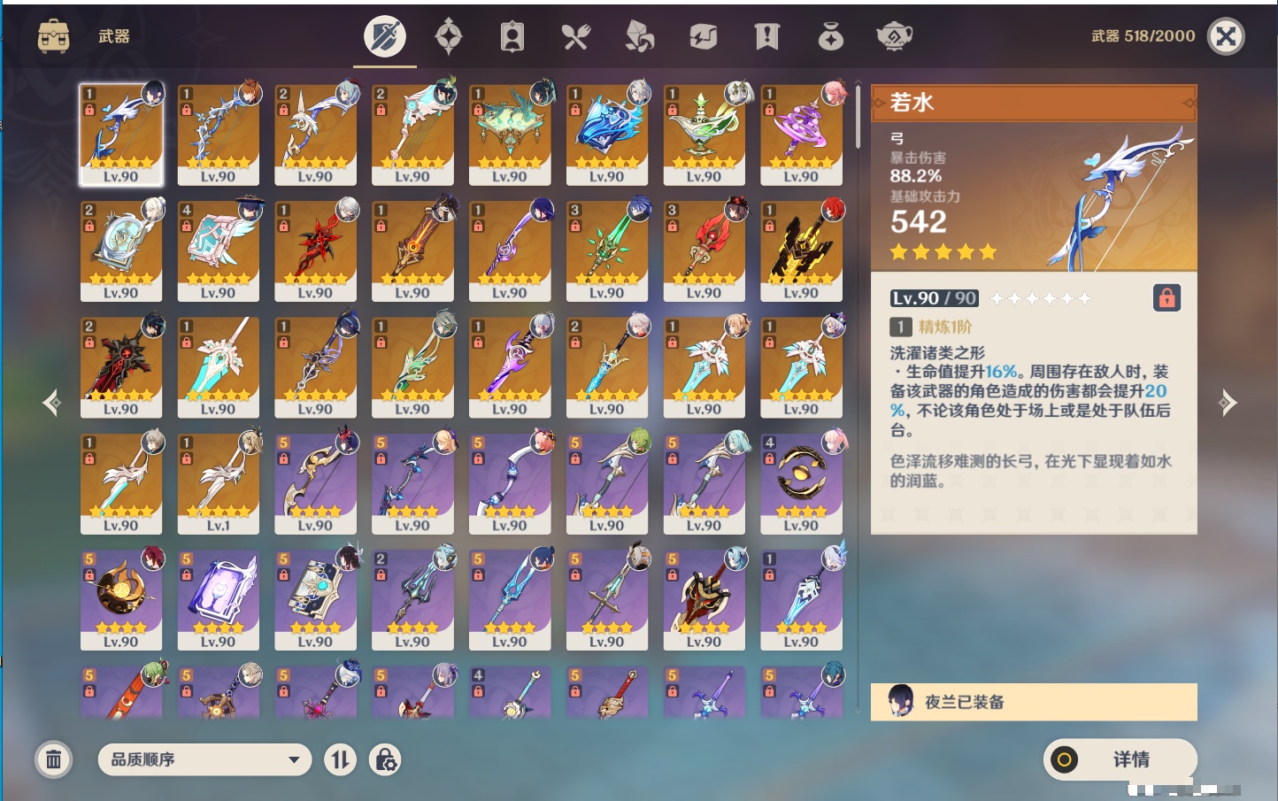 【26个五星武器】,精4天空之卷,精3和璞鸢,精3护摩之杖,精2阿莫斯之弓,精2天空之翼,精2四风原典,精2狼的末路,精2苍古自由之誓,精1若水,精1冬极白星,精1鹤鸣余音,精1万世流涌大典,精1千夜浮梦,精1神乐之真意,精1赤月之形,精1赤沙之杖,精1薙草之稻光,精1无工之剑,精1天空之傲,精1赦罪,精1裁叶萃光,精1雾切之回光,精1天空之刃,精1风鹰剑,