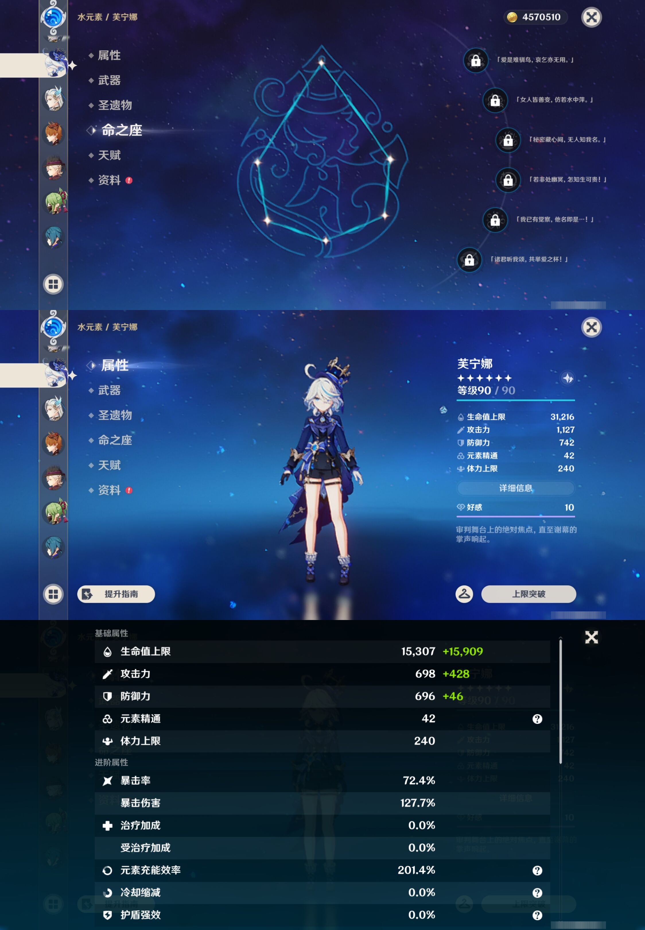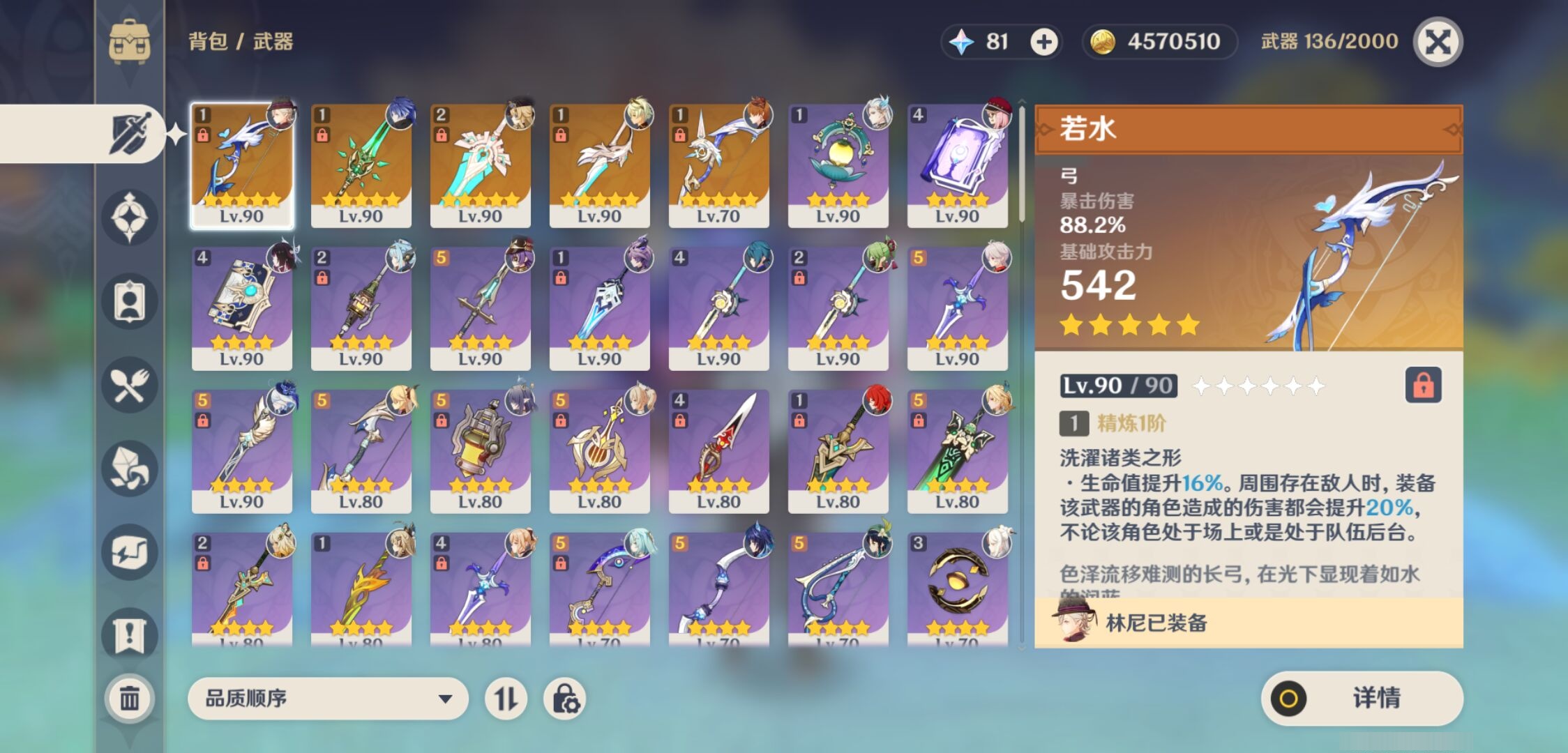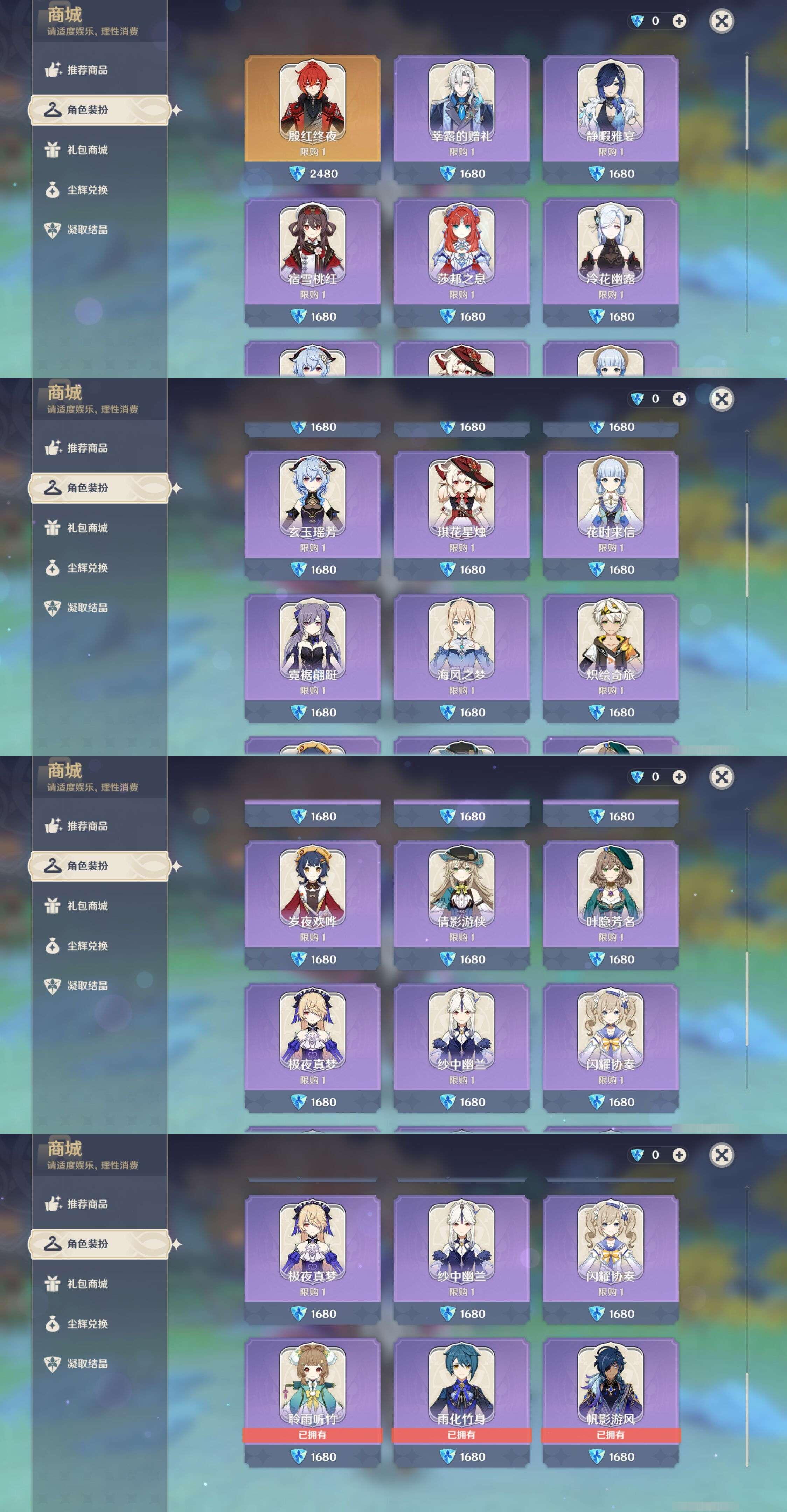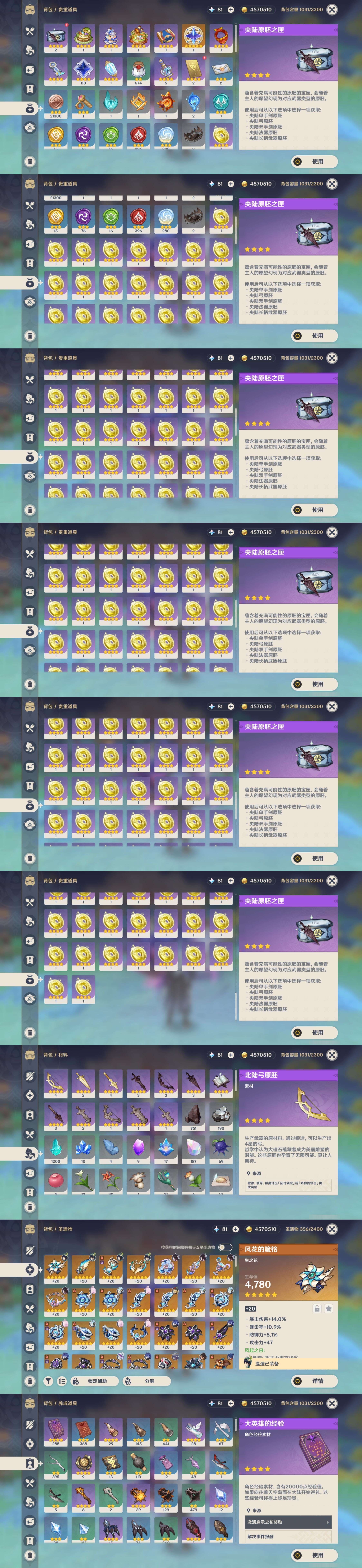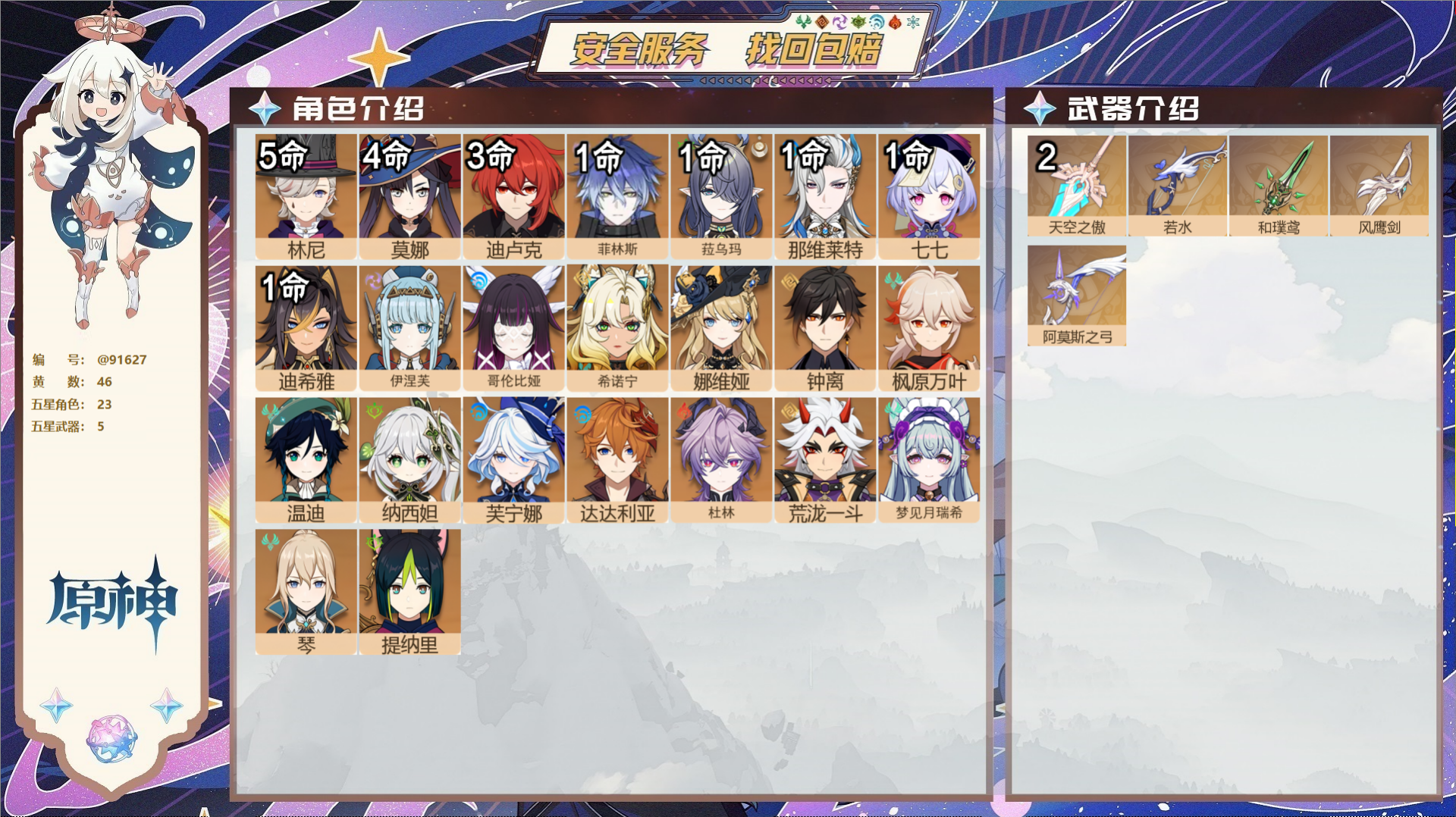 PX_2518097-,邮箱不出售,,冒险等级59级,女主,46黄,23个五星角色,5个五星武器,纠缠之源0--原石81--圣遗物356--【时装】,玲雨听竹,帆影游风,雨化竹身,