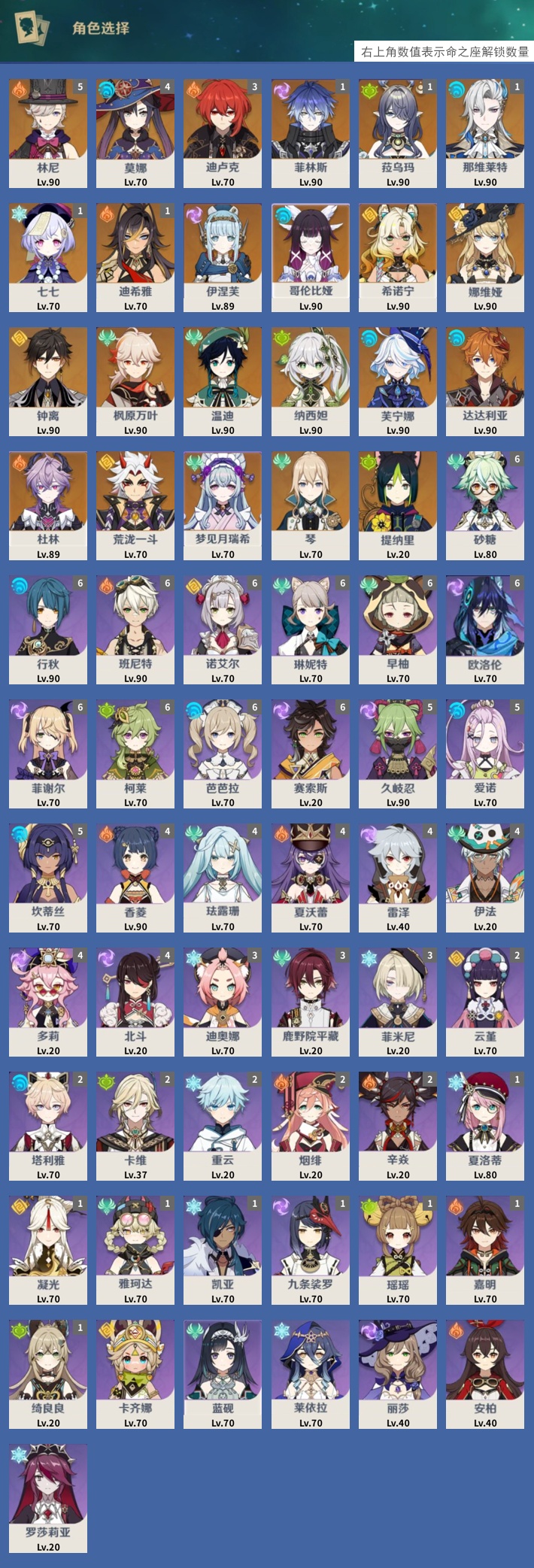 【23个五星角色】,5命林尼,4命莫娜,3命迪卢克,1命菲林斯,1命菈乌玛,1命那维莱特,1命七七,1命迪希雅,0命伊涅芙,0命哥伦比娅,0命希诺宁,0命娜维娅,0命钟离,0命枫原万叶,0命温迪,0命纳西妲,0命芙宁娜,0命达达利亚,0命杜林,0命荒泷一斗,0命梦见月瑞希,0命琴,0命提纳里,