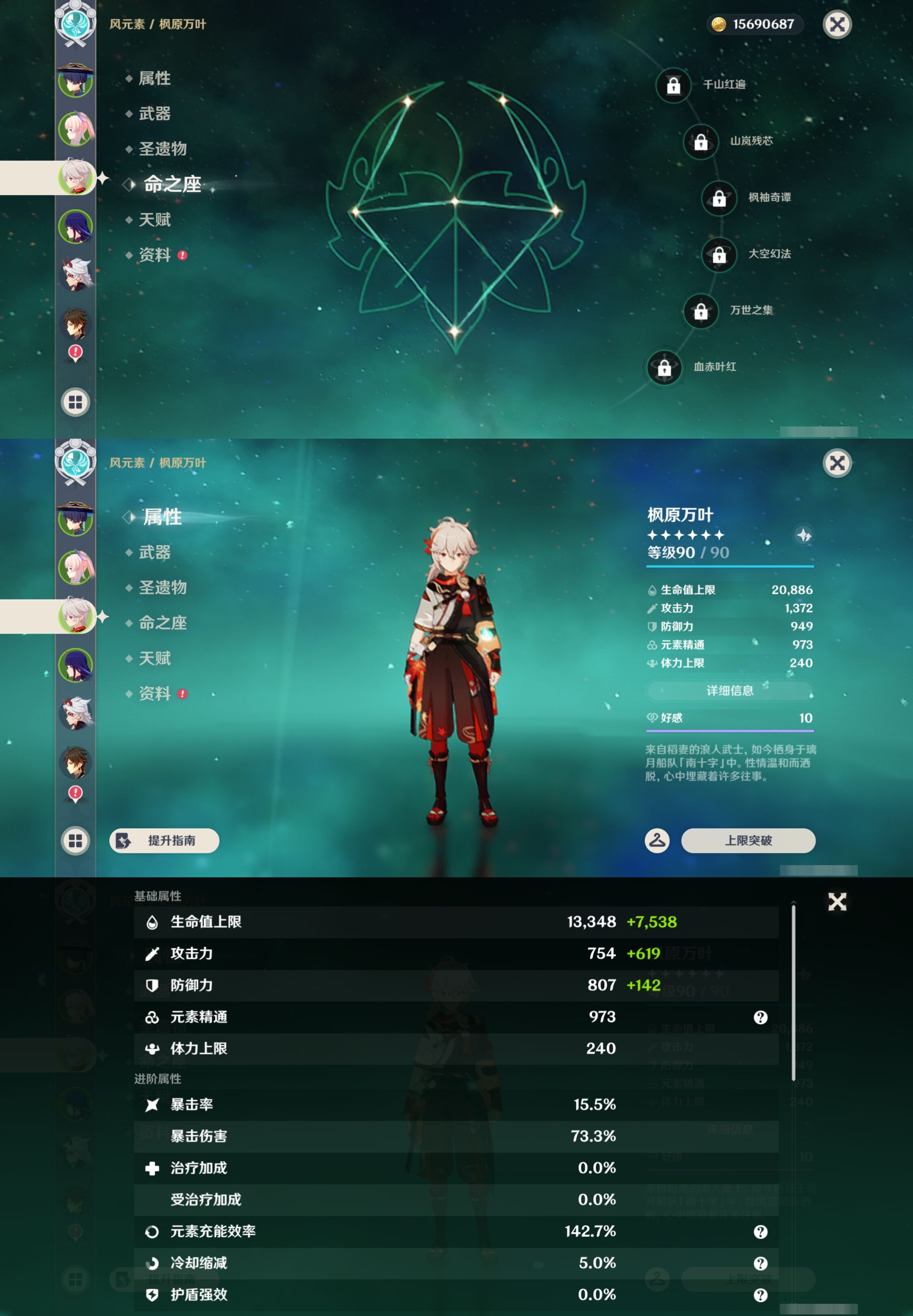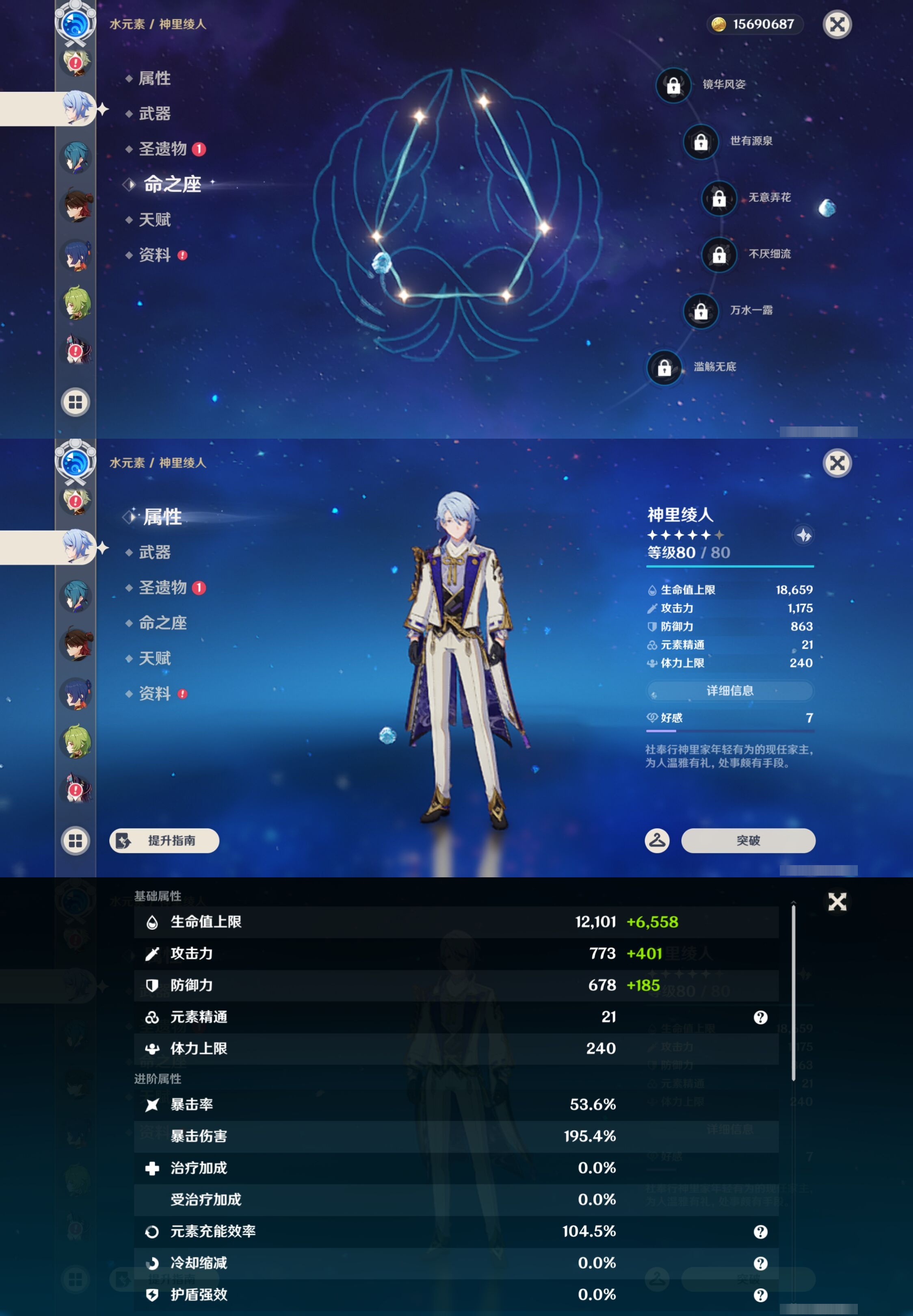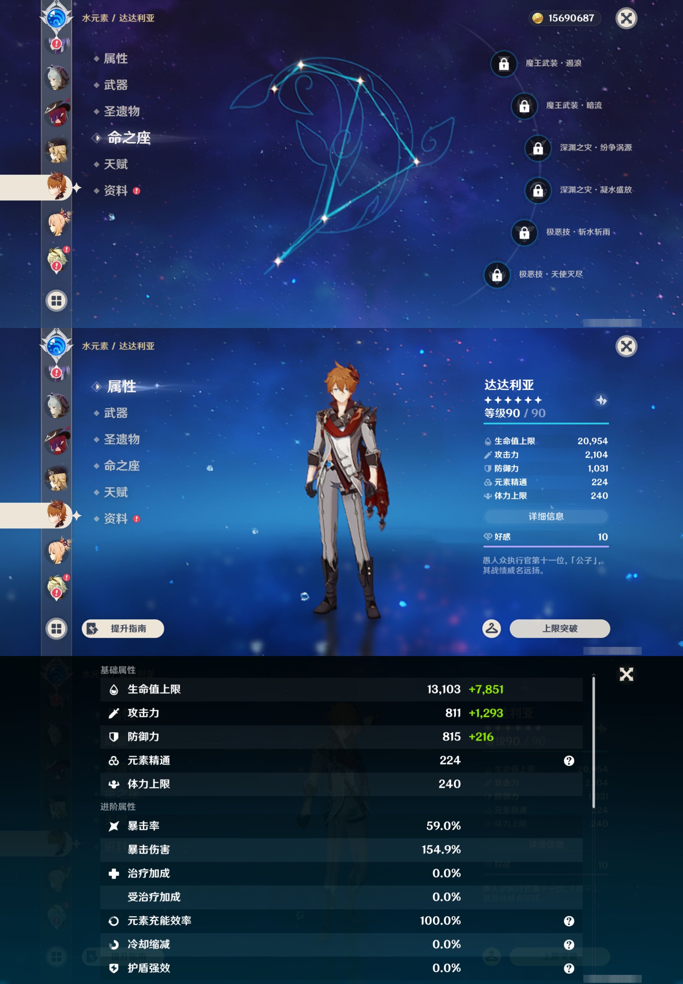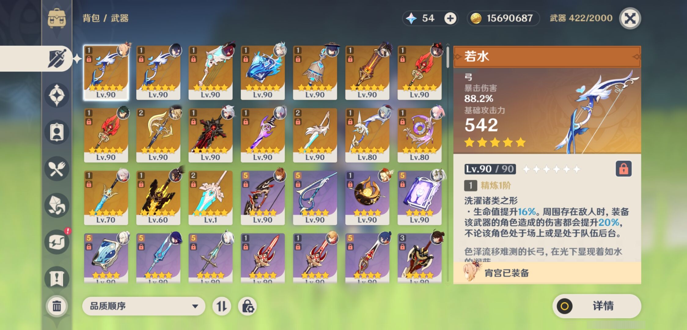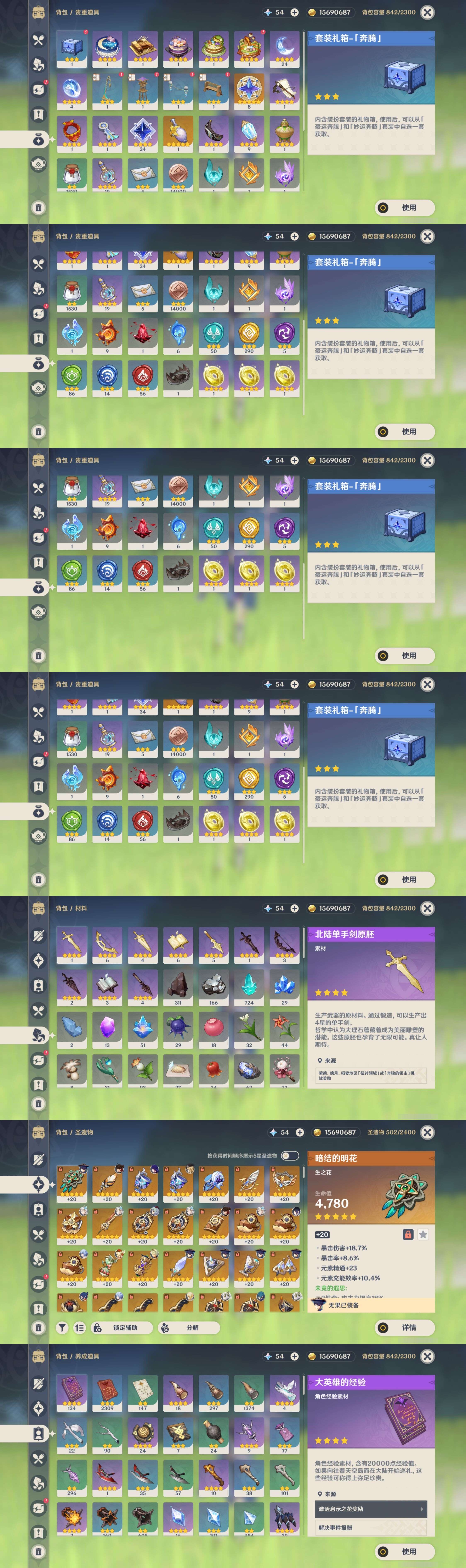 【17个五星武器】,精2裁断,精2天空之傲,精2风鹰剑,精1若水,精1护摩之杖,精1苍古自由之誓,精1无工之剑,精1若水,精1天空之翼,精1狼的末路,精1万世流涌大典,精1雾切之回光,精1图莱杜拉的回忆,精1赤沙之杖,精1阿莫斯之弓,精1护摩之杖,精1不灭月华,四星角色:5命班尼特,6套,