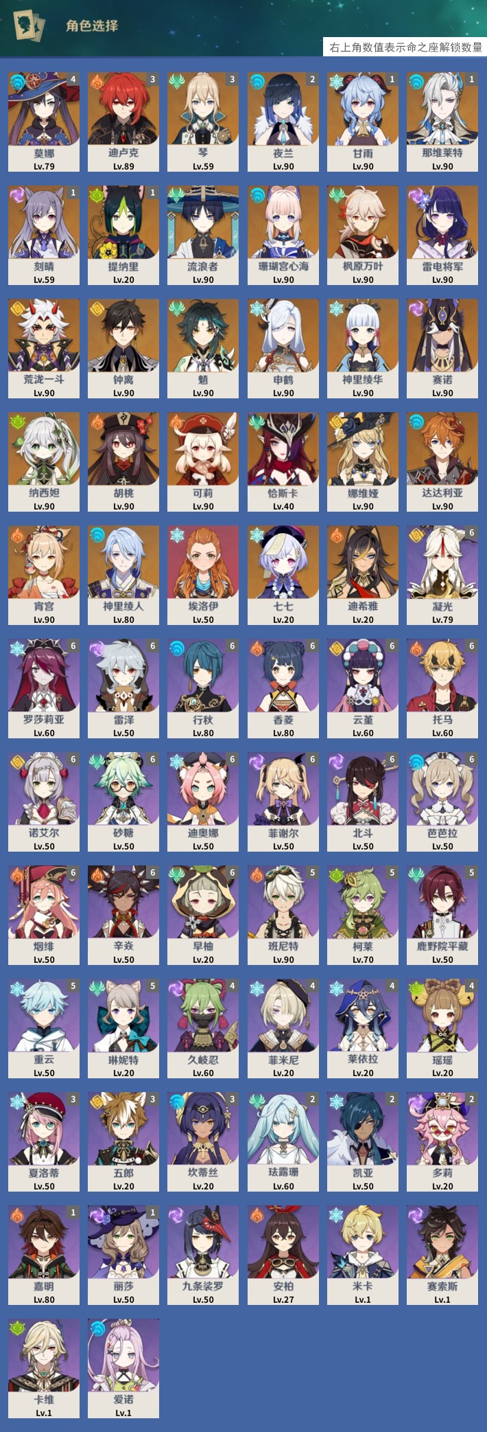 【29个五星角色】,4命莫娜,3命迪卢克,3命琴,2命夜兰,1命甘雨,1命那维莱特,1命刻晴,1命提纳里,0命流浪者,0命珊瑚宫心海,0命枫原万叶,0命雷电将军,0命荒泷一斗,0命钟离,0命魈,0命申鹤,0命神里绫华,0命赛诺,0命纳西妲,0命胡桃,0命可莉,0命恰斯卡,0命娜维娅,0命达达利亚,0命宵宫,0命神里绫人,0命埃洛伊,0命七七,0命迪希雅,