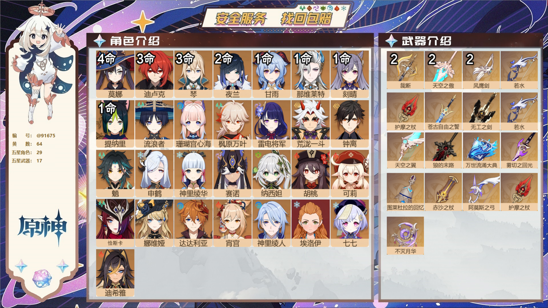 PX_2519790-,邮箱不出售,送TAP,冒险等级60级,女主,64黄,29个五星角色,17个五星武器,纠缠之源0--原石54--圣遗物502--【时装】,纱中幽兰,闪耀协奏,帆影游风,雨化竹身,叶隐芳名,极夜真梦,