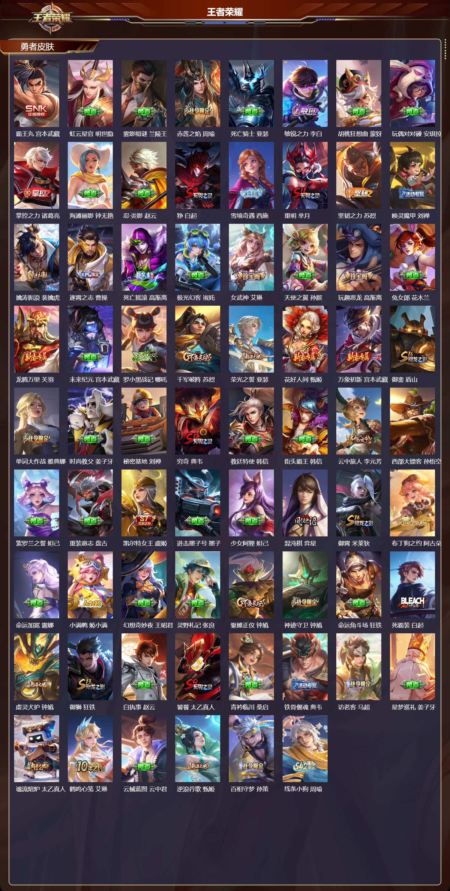 【129,勇者皮肤】时空谍影,海诺,圆桌骑士,盾山,烛龙,曹操,爱心护理,阿轲,缤纷绘卷,张良,纽约教父,刘备,拳王,达摩,大发明家,达摩,龙舞盛年,沈梦溪,丁香结,小乔,功夫炙烤,廉颇,沉稳之力,孙尚香,海盐诗旅,桑启,朔风刀,夏侯惇,醍醐杖,老夫子,朔望之晖,女娲,归虚梦演,孙膑,汉昭烈帝,刘备,白色死神,白起,黄金武士,典韦,御旌,牛魔,阴阳师,狄仁杰,径山谋武,孙权,致命风华,阿轲,次元突破,哪吒,科学大爆炸,项羽,戏梦巡演,空空儿,功夫老勺,老夫子,西部大镖客,牛魔,鲨炮海盗猫,沈梦溪,海滩派对,项羽,万华元夜,狄仁杰,无尽征程,廉颇,克喵,鬼谷子,踏浪烽翎,莱西奥,演武夺筹,程咬金,红桃皇后,芈月,奇妙博物学,庄周,猎兽之王,吕布,野性能量,吕布,守护之力,大乔,无双福将,程咬金,瓷语鉴心,露娜,百相守梦,影,原初探秘者,鬼谷子,潮玩探月行,猪八戒,西部大镖客,猪八戒,疑决卦,明世隐,化身博士,扁鹊,潮玩骑士王,亚瑟,阿尔法小队,后羿,五福同心,张飞,金色潮汐,朵莉亚,次元傲视,杨戬,星际陆战队,程咬金,幻乐之宴,鬼谷子,霸王丸,宫本武藏,虹云星官,明世隐,雾影缉谜,兰陵王,赤莲之焰,周瑜,死亡骑士,亚瑟,敏锐之力,李白,胡桃狂想曲,蒙犽,玩偶对对碰,安琪拉,掌控之力,诸葛亮,海滩丽影,钟无艳,忍·炎影,赵云,狰,白起,雪境奇遇,西施,重明,芈月,坚韧之力,苏烈,唤灵魔甲,刘禅,擒涛扼浪,裴擒虎,逐霄之志,曹操,死亡摇滚,高渐离,极光幻客,蚩奼,女武神,艾琳,天使之翼,孙膑,玩趣恶龙,高渐离,兔女郎,花木兰,龙腾万里,关羽,未来纪元,宫本武藏,罗小黑战记,哪吒,千军破阵,苏烈,荣光之誓,亚瑟,花好人间,甄姬,万象初新,宫本武藏,御銮,盾山,单词大作战,雅典娜,时尚教父,姜子牙,秘密基地,刘禅,穷奇,典韦,教廷特使,韩信,街头霸王,韩信,云中旅人,李元芳,西部大镖客,孙悟空,紫罗兰之誓,妲己,重装意志,盘古,凯尔特女王,虞姬,进击墨子号,墨子,少女阿狸,妲己,混沌棋,弈星,御霄,米莱狄,布丁狗之约,阿古朵,命运加冕,露娜,小满鸭,姬小满,幻想奇妙夜,王昭君,灵野札记,张良,驱傩正仪,钟馗,神迹守卫,钟馗,命运角斗场,狂铁,死霸装,白起,虚灵犬护,钟馗,御狮,狂铁,白执事,赵云,饕餮,太乙真人,青衿临川,桑启,铁骨偃魂,典韦,访茗客,马超,星梦巡礼,姜子牙,谧流熔炉,太乙真人,鹤鸣心笺,艾琳,云械蓝图,云中君,逆浪荇歌,甄姬,百相守梦,孙策,线条小狗,周瑜,爆裂喵拳,达摩,玫蓝誓约,戈娅,景韶洛都,明世隐,
