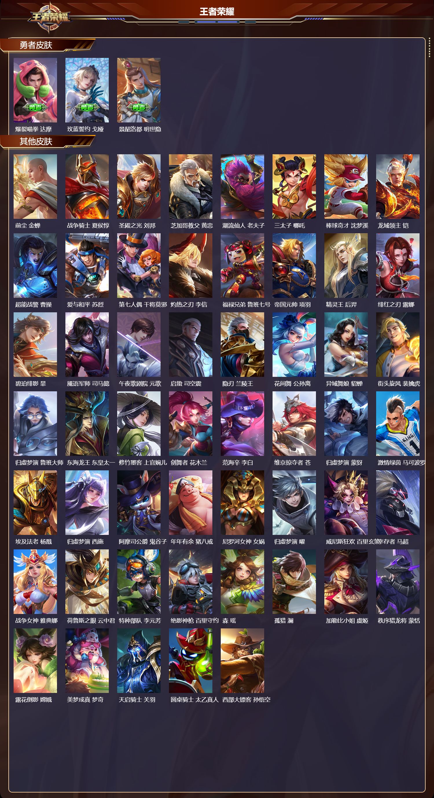 【53,其他皮肤】前尘,金蝉,战争骑士,夏侯惇,圣殿之光,刘邦,芝加哥教父,黄忠,潮流仙人,老夫子,三太子,哪吒,棒球奇才,沈梦溪,龙域领主,铠,超能战警,曹操,爱与和平,苏烈,第七人偶,干将莫邪,灼热之刃,李信,福禄兄弟,鲁班七号,帝国元帅,项羽,精灵王,后羿,绯红之刃,露娜,碧珀绯影,暃,魇语军师,司马懿,午夜歌剧院,元歌,启蛰,司空震,隐刃,兰陵王,花间舞,公孙离,异域舞娘,貂蝉,街头旋风,裴擒虎,归虚梦演,鲁班大师,东海龙王,东皇太一,修竹墨客,上官婉儿,剑舞者,花木兰,范海辛,李白,维京掠夺者,苍,归虚梦演,蒙犽,激情绿茵,马可波罗,埃及法老,杨戬,归虚梦演,西施,阿摩司公爵,鬼谷子,年年有余,猪八戒,尼罗河女神,女娲,归虚梦演,曜,威尼斯狂欢,百里玄策,幸存者,马超,战争女神,雅典娜,荷鲁斯之眼,云中君,特种部队,李元芳,绝影神枪,百里守约,森,瑶,孤猎,澜,加勒比小姐,虞姬,秩序猎龙将,蒙恬,露花倒影,嫦娥,美梦成真,梦奇,天启骑士,关羽,圆桌骑士,太乙真人,西部大镖客,孙悟空,