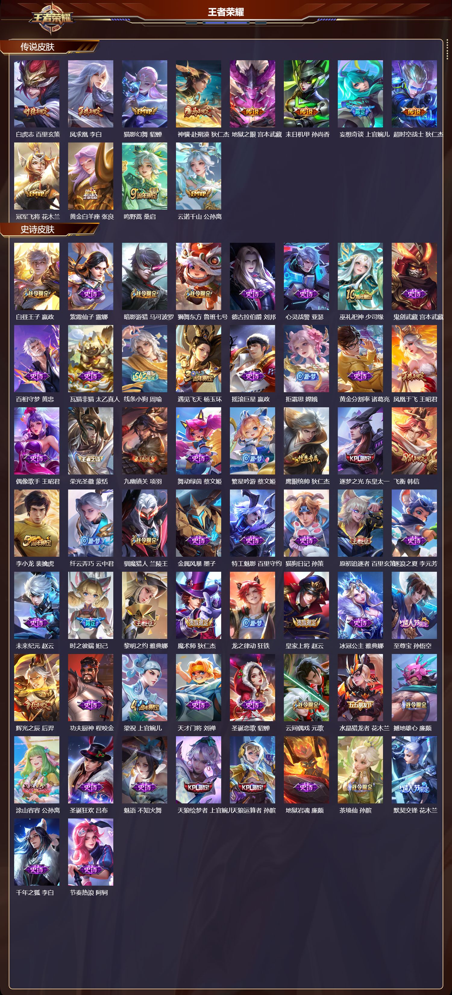 【72,史诗皮肤】白昼王子,嬴政,紫霞仙子,露娜,暗影游猎,马可波罗,狮舞东方,鲁班七号,德古拉伯爵,刘邦,心灵战警,亚瑟,巫礼祀神,少司缘,鬼剑武藏,宫本武藏,百相守梦,黄忠,瓦猫非猫,太乙真人,线条小狗,周瑜,遇见飞天,杨玉环,摇滚巨星,嬴政,拒霜思,嫦娥,黄金分割率,诸葛亮,凤凰于飞,王昭君,偶像歌手,王昭君,荣光圣徽,蒙恬,九幽镇关,项羽,舞动绿茵,蔡文姬,繁星吟游,蔡文姬,鹰眼统帅,狄仁杰,逐梦之光,东皇太一,飞衡,韩信,李小龙,裴擒虎,纤云弄巧,云中君,驯魔猎人,兰陵王,金属风暴,墨子,特工魅影,百里守约,猫狗日记,孙策,原初追逐者,百里玄策,逐浪之夏,李元芳,未来纪元,赵云,时之彼端,妲己,黎明之约,雅典娜,魔术师,狄仁杰,龙之律动,狂铁,皇家上将,赵云,冰冠公主,雅典娜,至尊宝,孙悟空,辉光之辰,后羿,功夫厨神,程咬金,梁祝,上官婉儿,天才门将,刘禅,圣诞恋歌,貂蝉,云间偶戏,元歌,水晶猎龙者,花木兰,撼地雄心,廉颇,涂山容容,公孙离,圣诞狂欢,吕布,魅语,不知火舞,天狼绘梦者,上官婉儿,天狼运算者,孙膑,地狱岩魂,廉颇,茶境仙,孙膑,默契交锋,花木兰,千年之狐,李白,节奏热浪,阿轲,青春决赛季,花木兰,曙光守护者,铠,心灵骇客,安琪拉,箭羽风息,伽罗,乱世虎臣,张飞,百相守梦,周瑜,缤纷独角兽,小乔,线条小狗,小乔,蓝屏警告,典韦,水果甜心,孙尚香,狂想玩偶喵,蒙犽,化蝶舞,阿轲,幽灵船长,曹操,暗隐猎兽者,兰陵王,