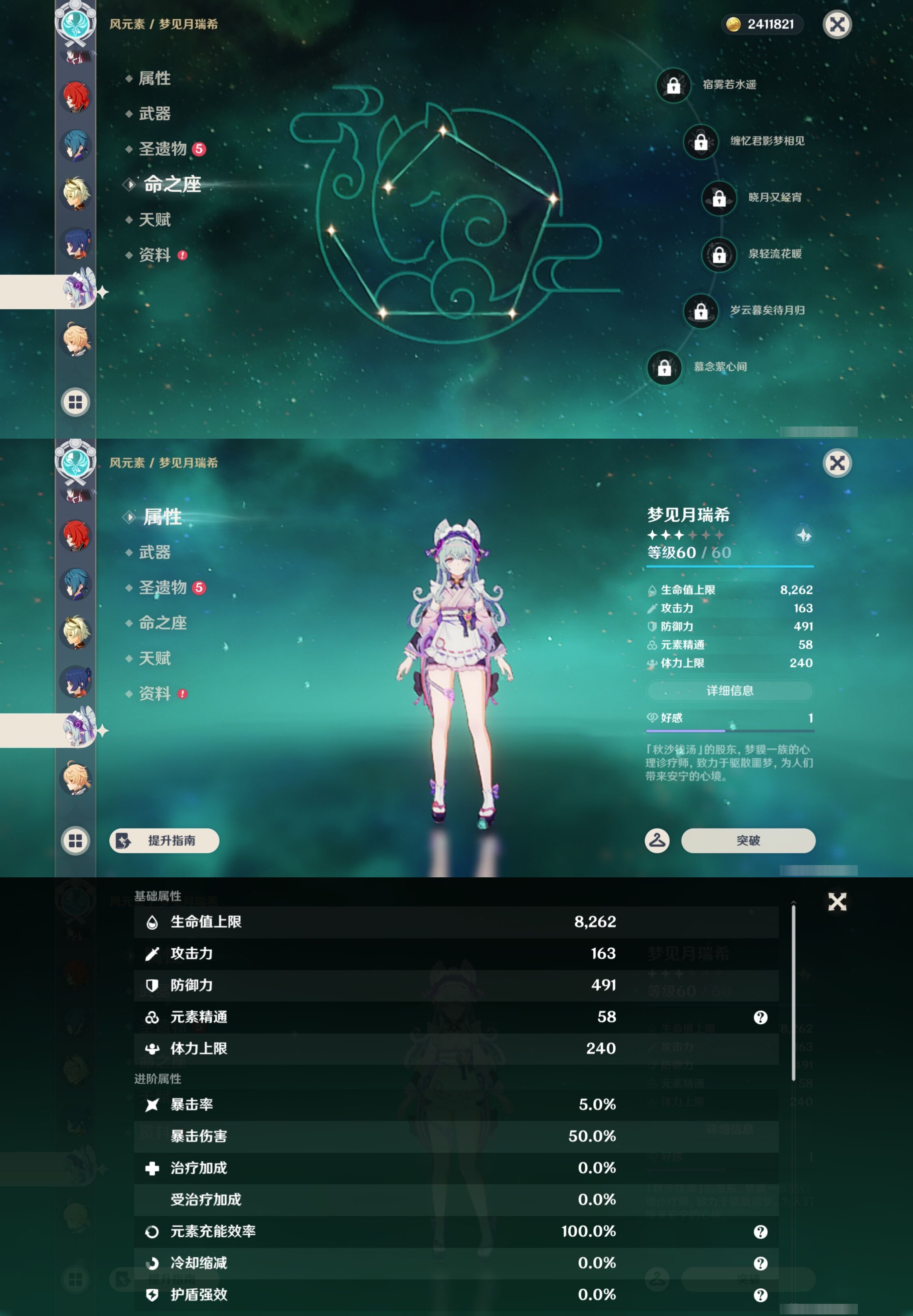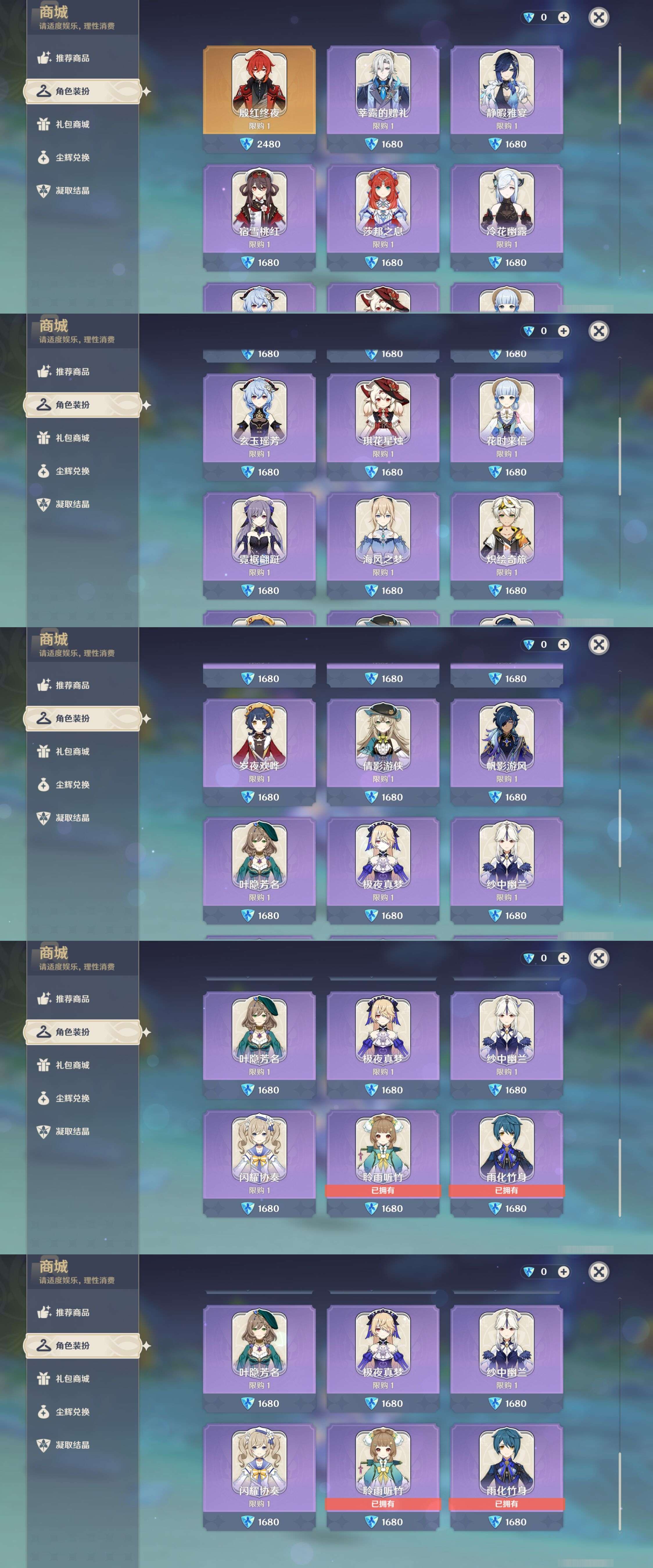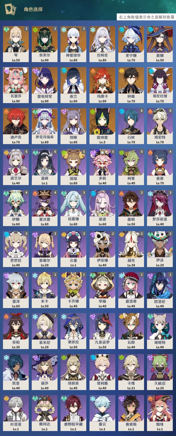 【16个五星角色】,2命琴,1命奈芙尔,1命神里绫华,0命丝柯克,0命芙宁娜,0命莫娜,0命瓦雷莎,0命雷电将军,0命夜兰,0命玛薇卡,0命钟离,0命哥伦比娅,0命迪卢克,0命梦见月瑞希,0命刻晴,0命提纳里,