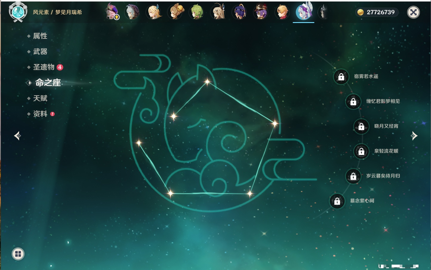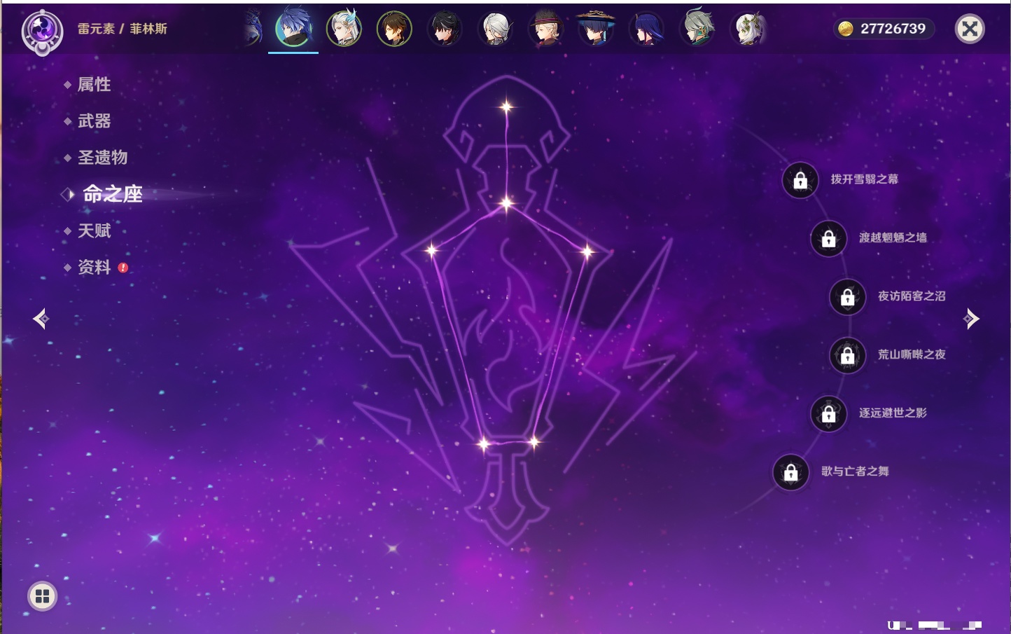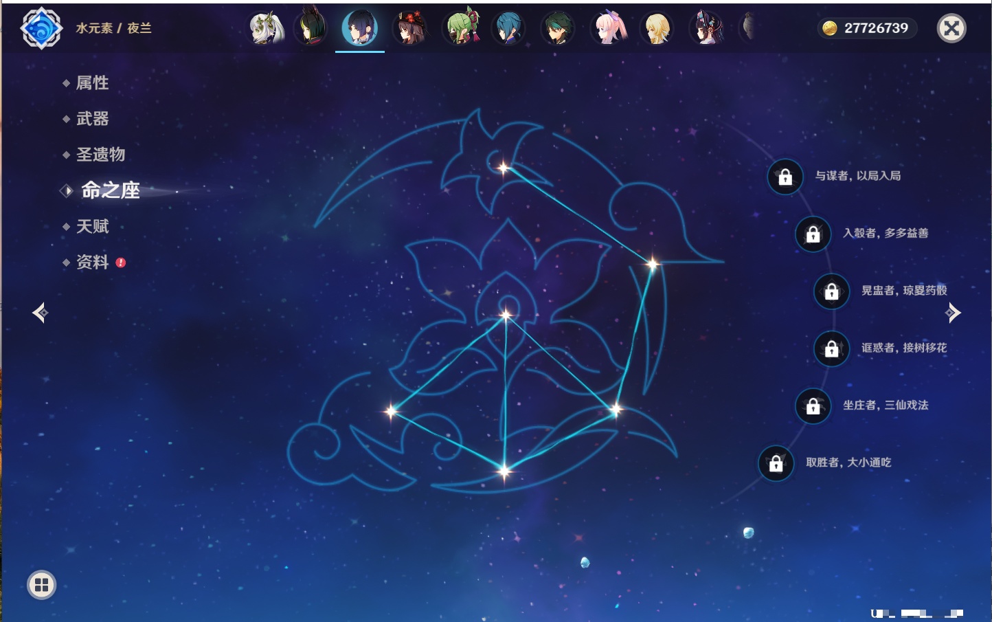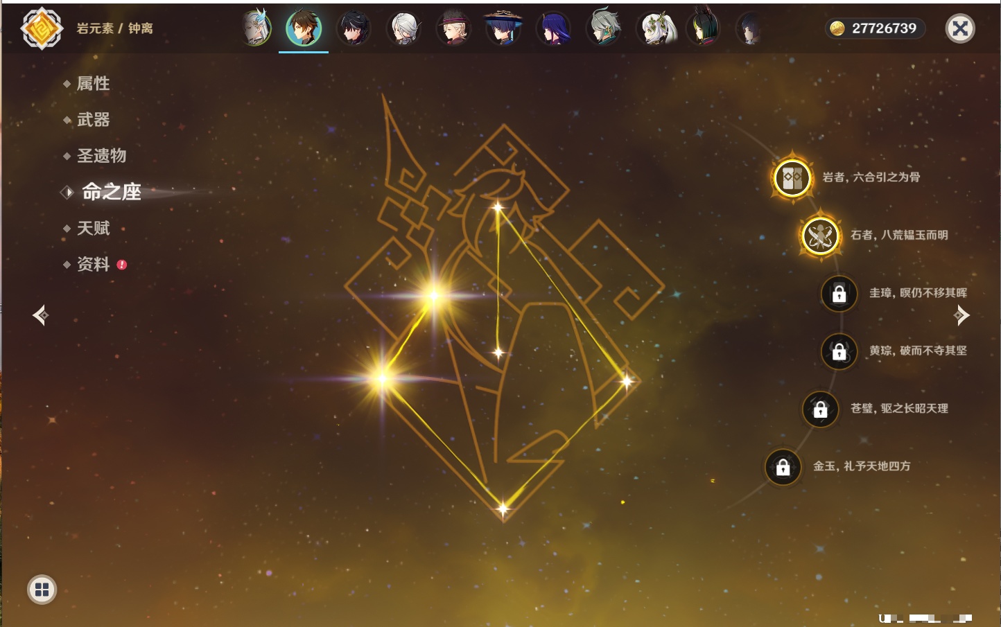 【24个五星角色】,2命钟离,2命七七,1命刻晴,1命莫娜,1命迪卢克,0命阿蕾奇诺,0命芙宁娜,0命莱欧斯利,0命那维莱特,0命林尼,0命迪希雅,0命艾尔海森,0命流浪者,0命纳西妲,0命提纳里,0命夜兰,0命八重神子,0命雷电将军,0命胡桃,0命魈,0命珊瑚宫心海,0命琴,0命梦见月瑞希,0命菲林斯,