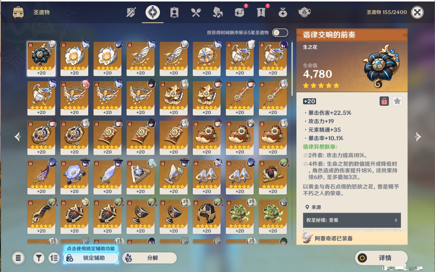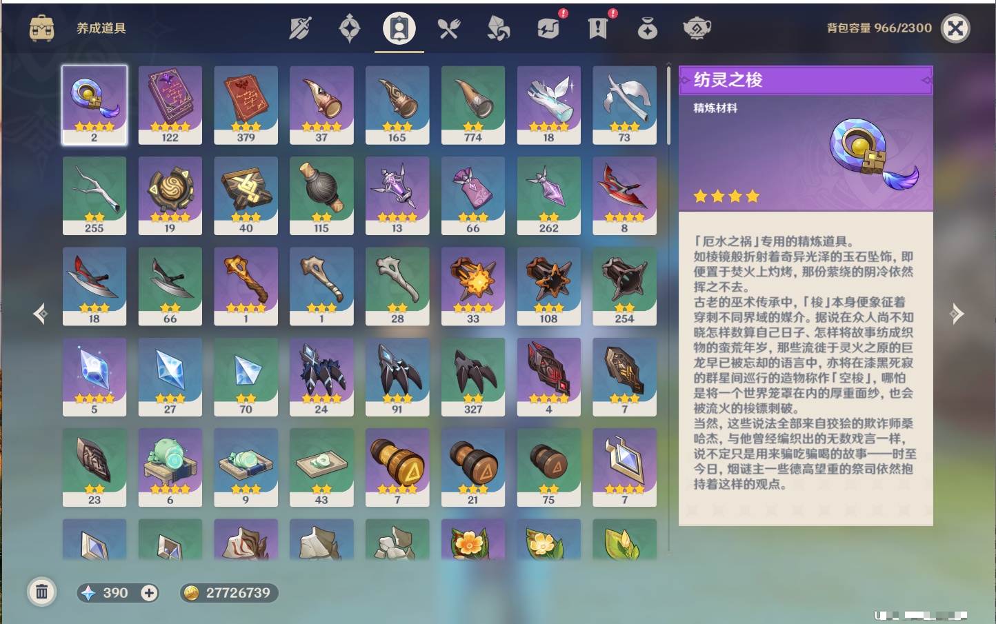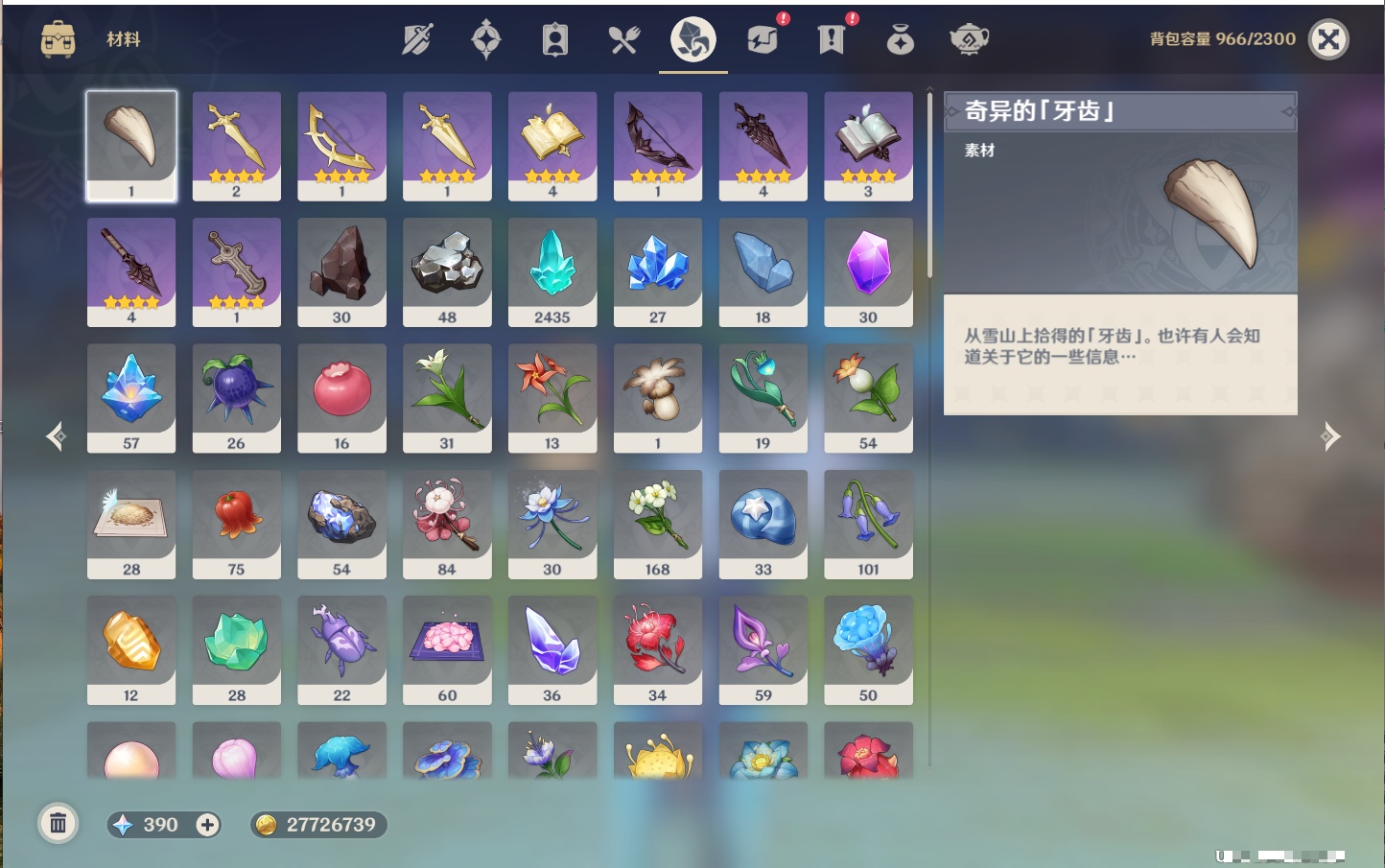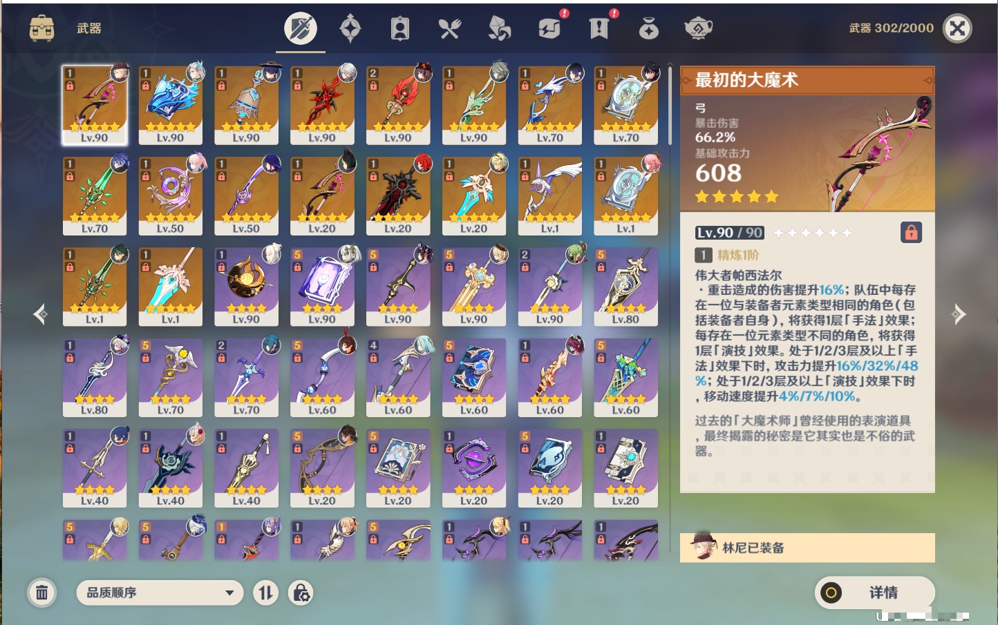 【18个五星武器】,精2护摩之杖,精1最初的大魔术,精1万世流涌大典,精1图莱杜拉的回忆,精1赤月之形,精1裁叶萃光,精1若水,精1四风原典,精1和璞鸢,精1不灭月华,精1薙草之稻光,精1狼的末路,精1天空之刃,精1阿莫斯之弓,精1天空之傲,