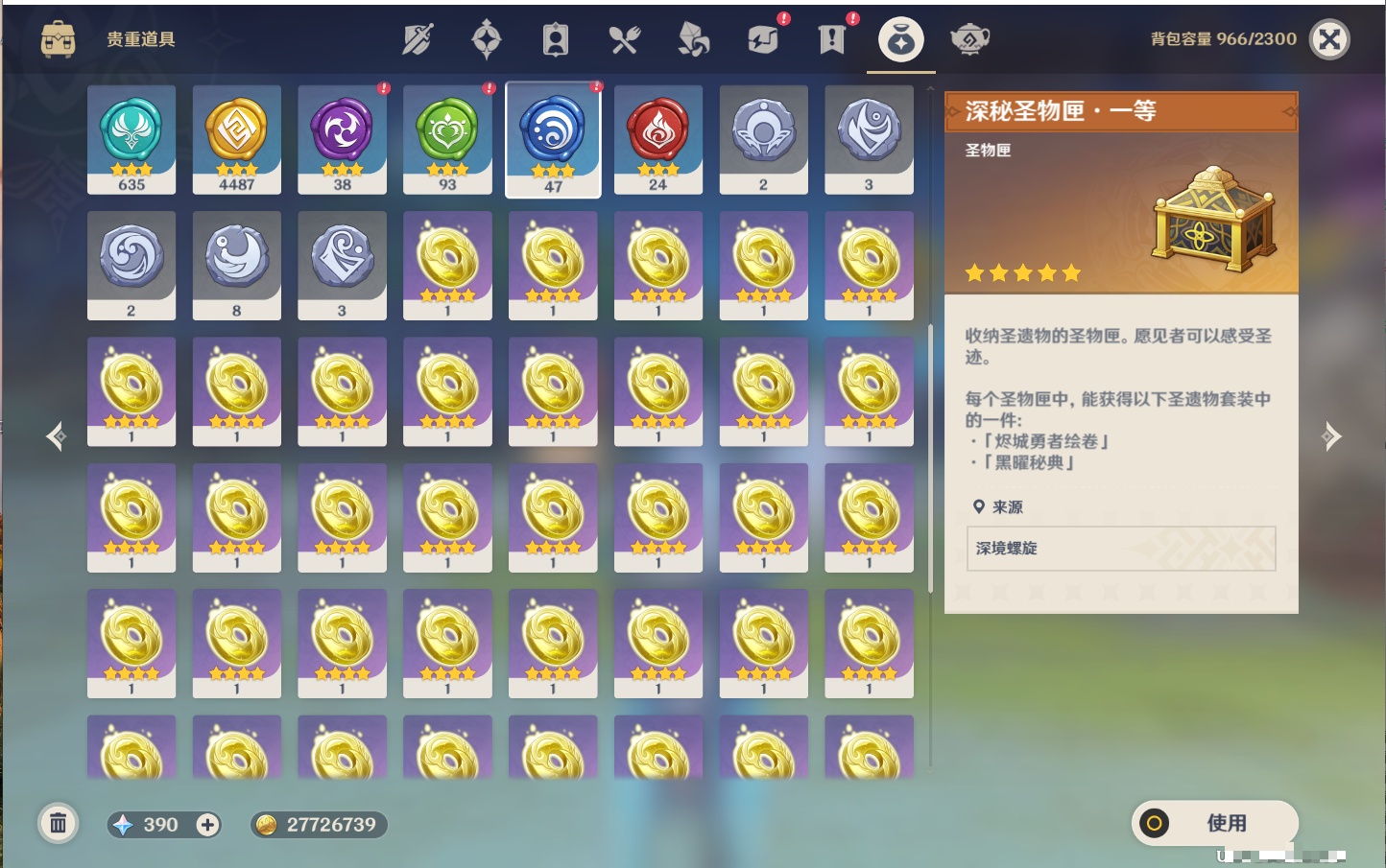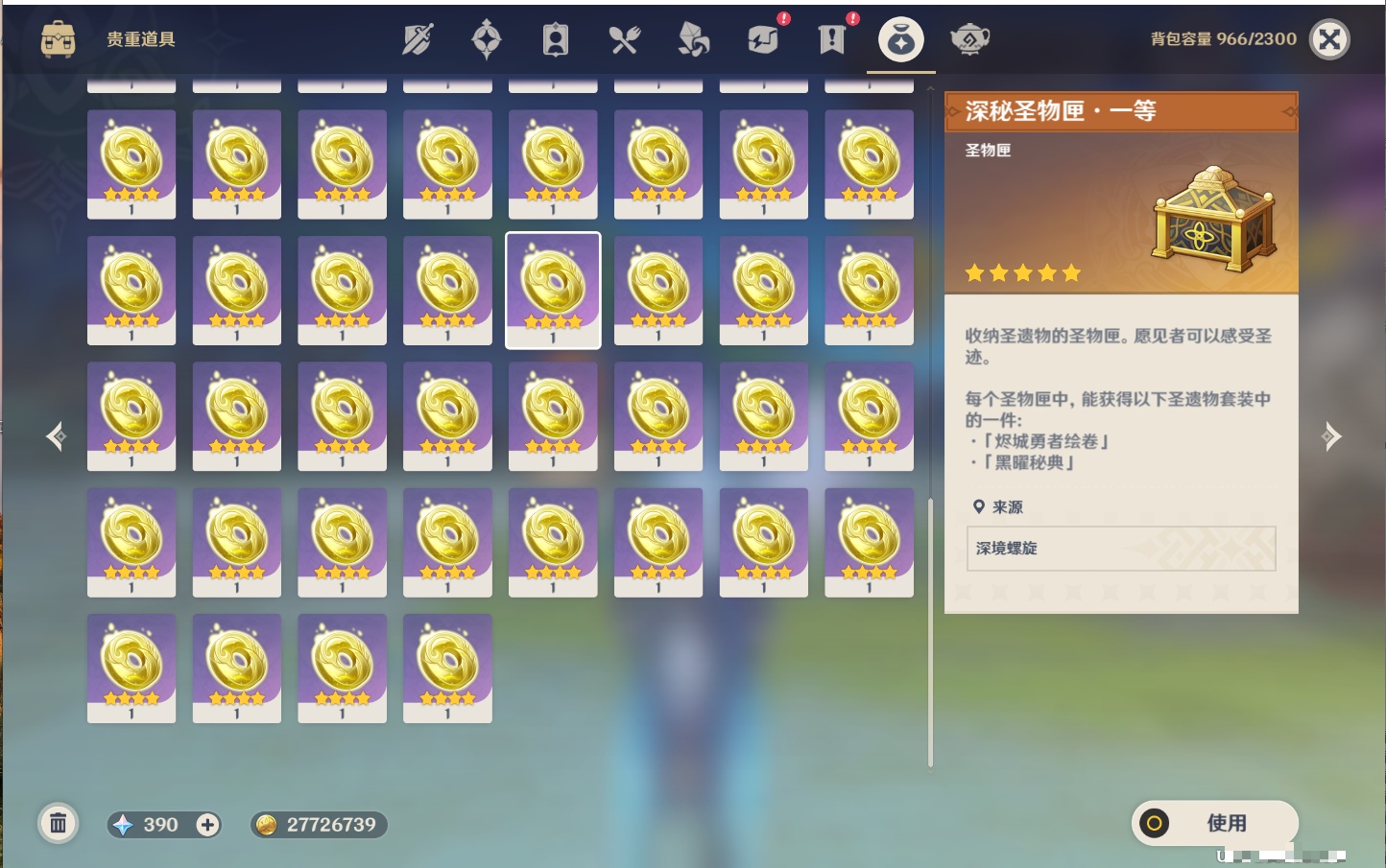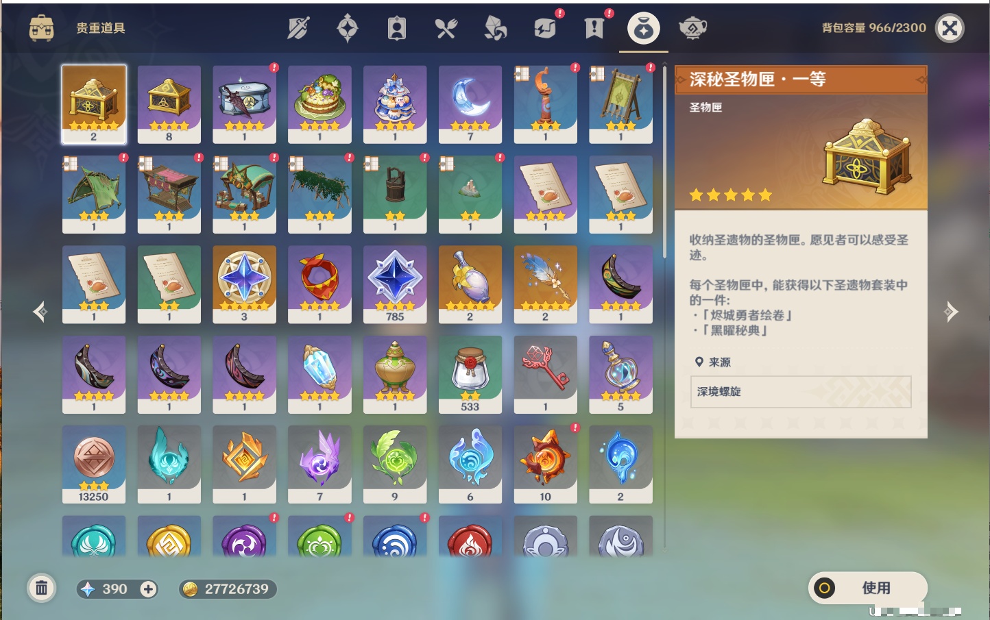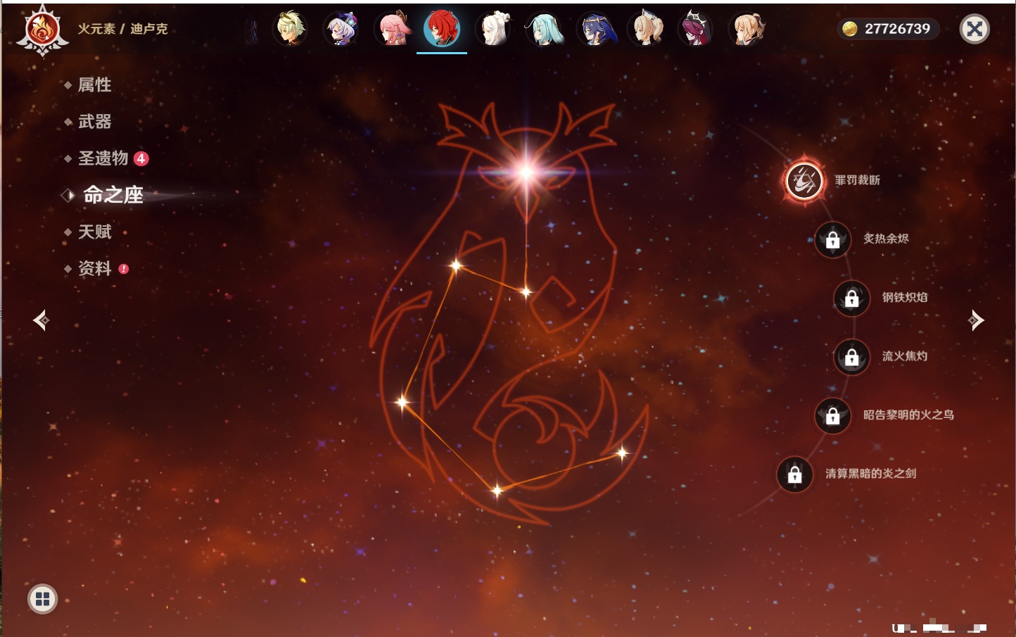 【18个五星武器】,精2护摩之杖,精1最初的大魔术,精1万世流涌大典,精1图莱杜拉的回忆,精1赤月之形,精1裁叶萃光,精1若水,精1四风原典,精1和璞鸢,精1不灭月华,精1薙草之稻光,精1狼的末路,精1天空之刃,精1阿莫斯之弓,精1天空之傲,