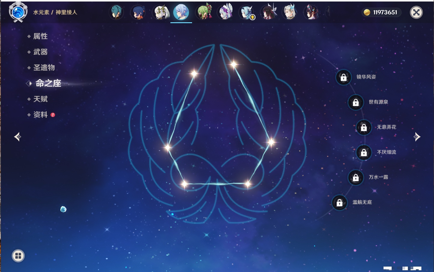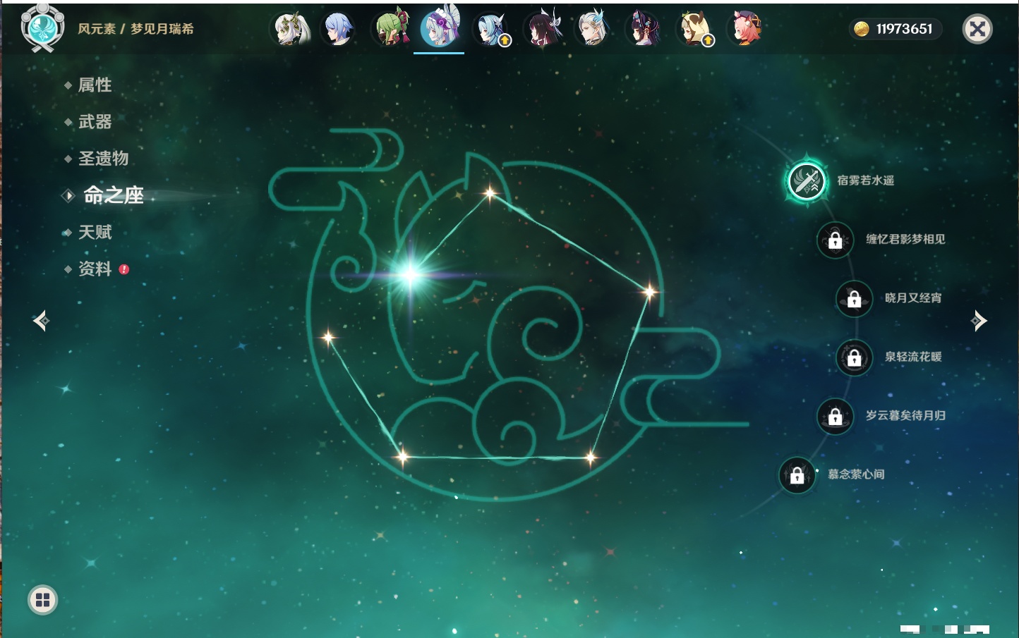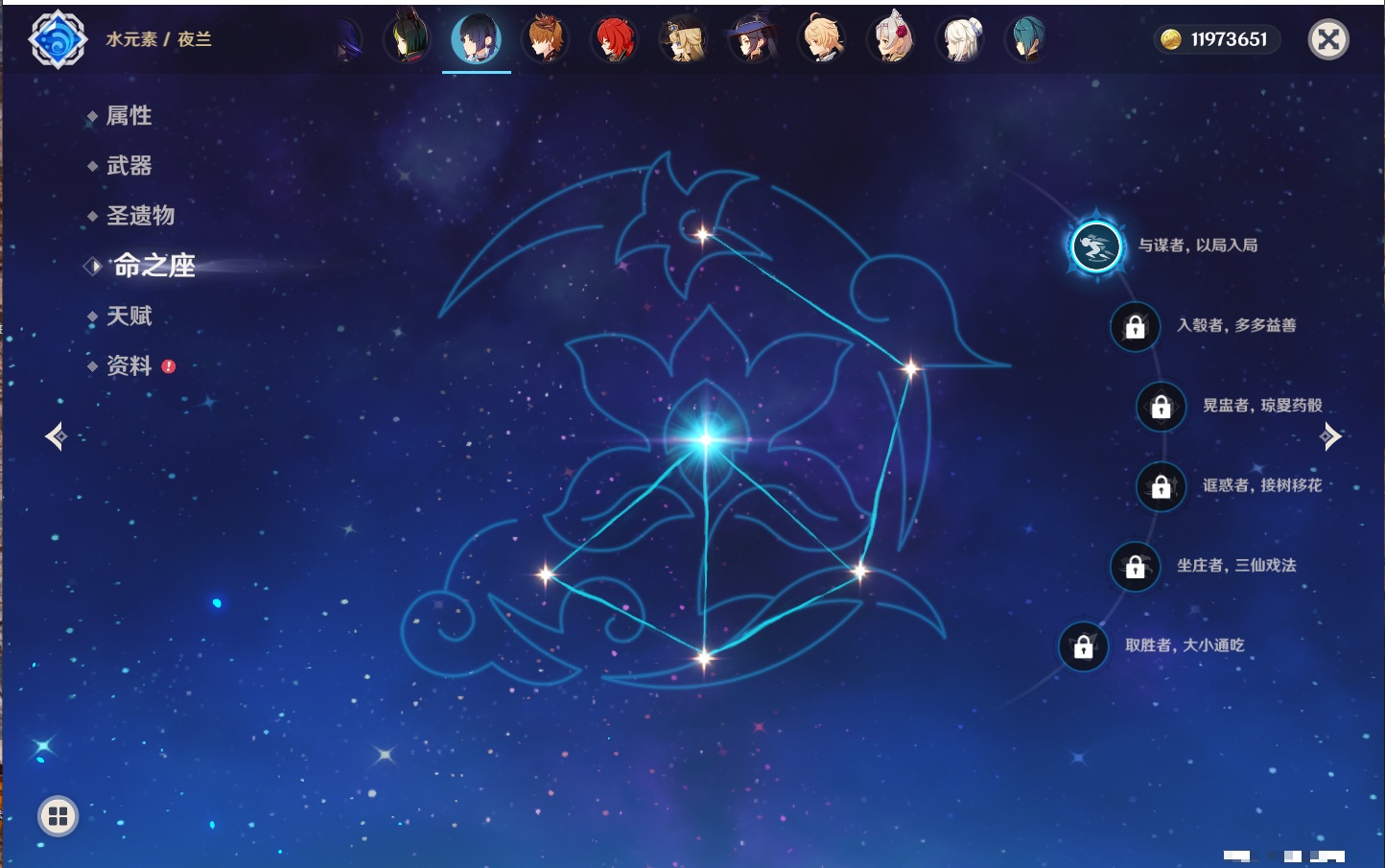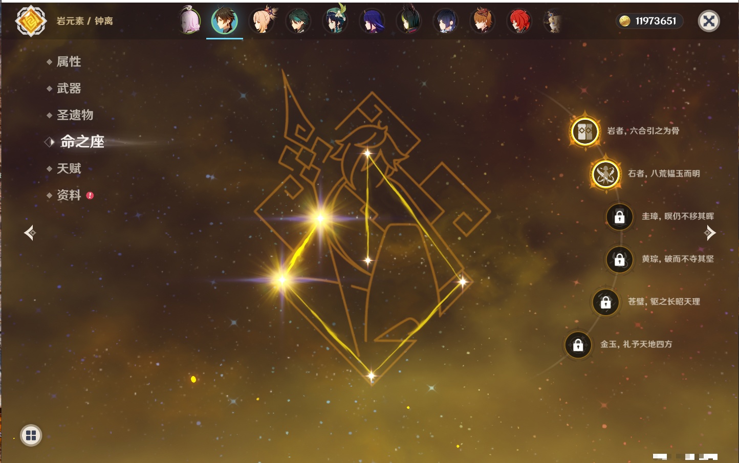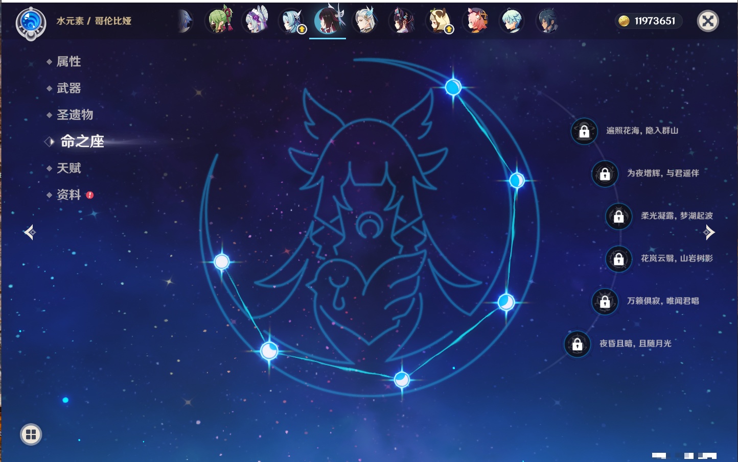 【22个五星角色】,2命钟离,2命七七,1命赛诺,1命夜兰,1命莫娜,1命迪卢克,1命梦见月瑞希,0命那维莱特,0命纳西妲,0命提纳里,0命神里绫人,0命优菈,0命雷电将军,0命魈,0命宵宫,0命温迪,0命达达利亚,0命刻晴,0命琴,0命菲林斯,0命娜维娅,0命哥伦比娅,