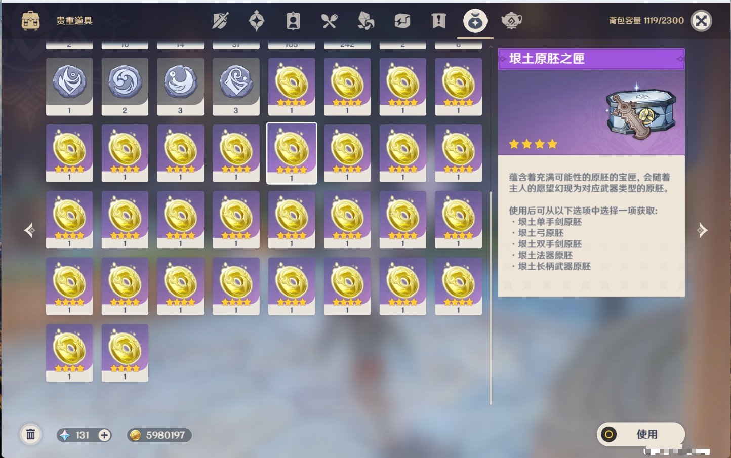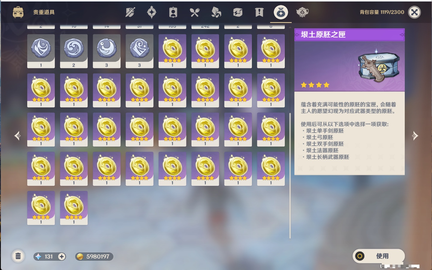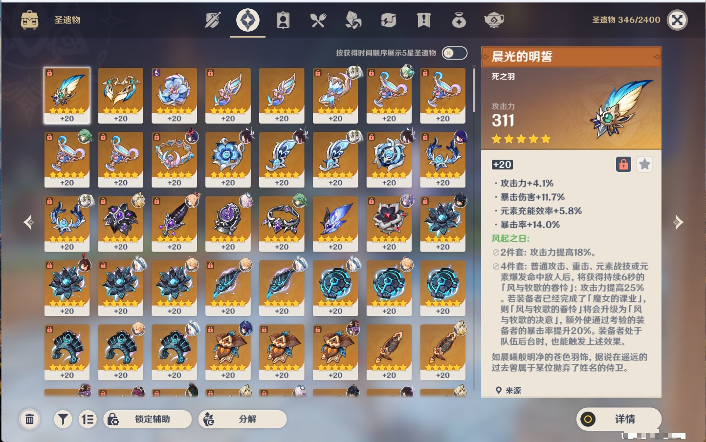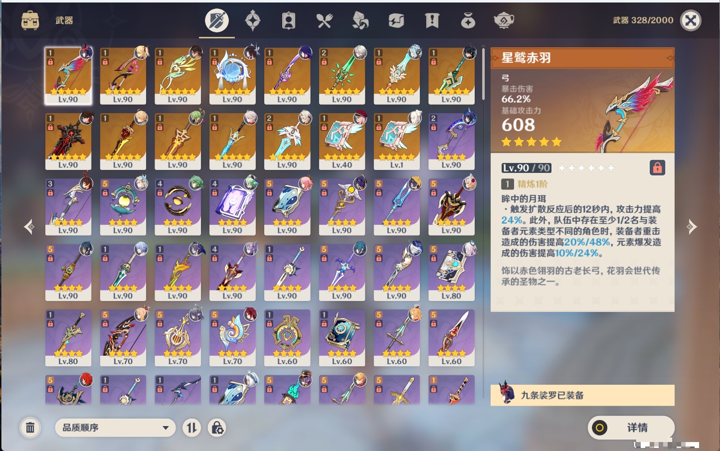【15个五星武器】,精2和璞鸢,精2天空之刃,精1星鹫赤羽,精1最初的大魔术,精1猎人之径,精1帷间夜曲,精1薙草之稻光,精1天空之脊,精1山王长牙,精1狼的末路,精1有乐御簾切,精1圣显之钥,精1苍古自由之誓,精1天空之卷,