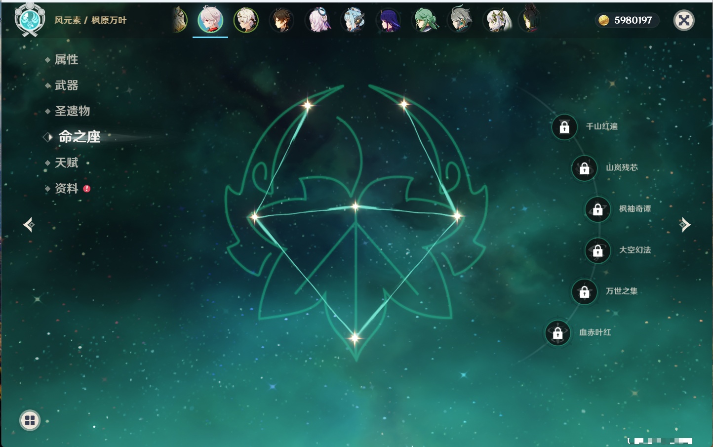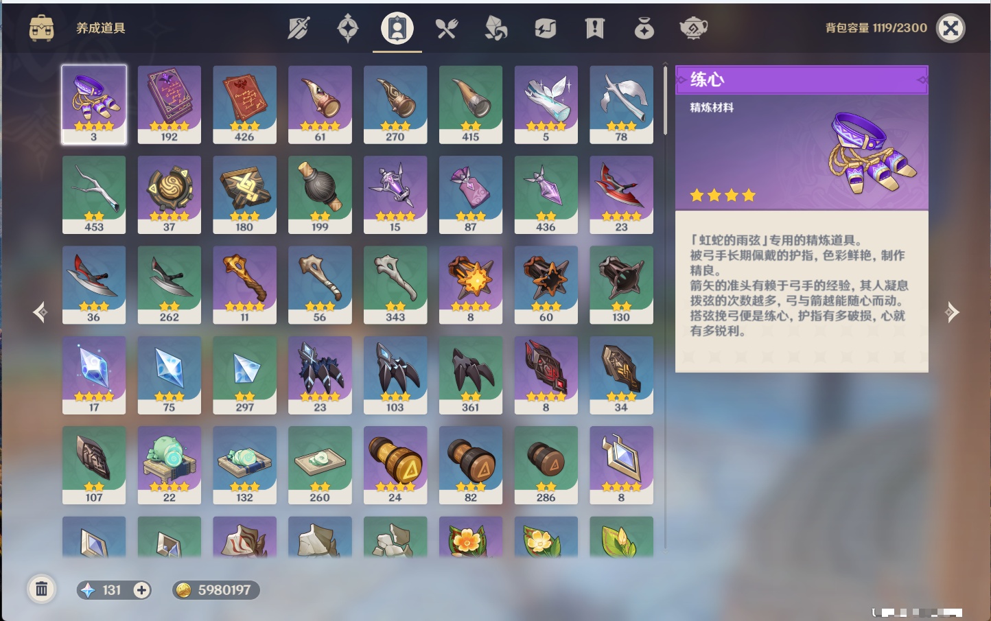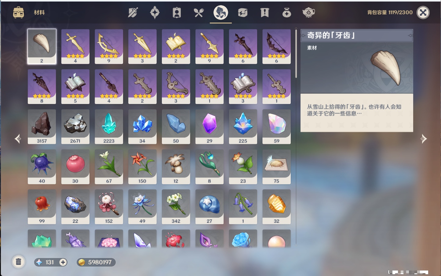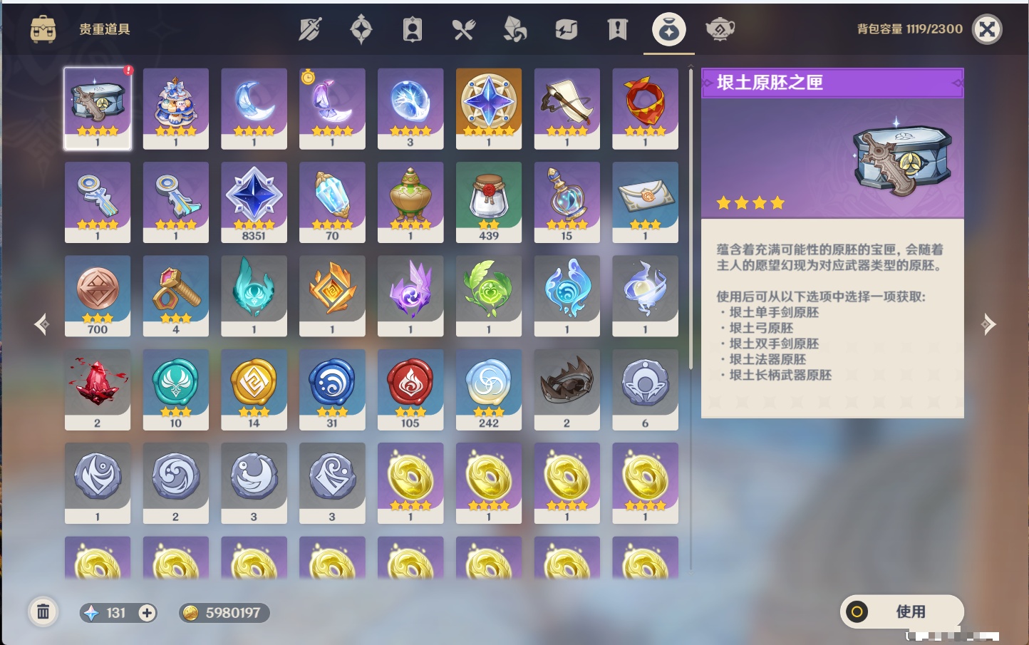 【15个五星武器】,精2和璞鸢,精2天空之刃,精1星鹫赤羽,精1最初的大魔术,精1猎人之径,精1帷间夜曲,精1薙草之稻光,精1天空之脊,精1山王长牙,精1狼的末路,精1有乐御簾切,精1圣显之钥,精1苍古自由之誓,精1天空之卷,