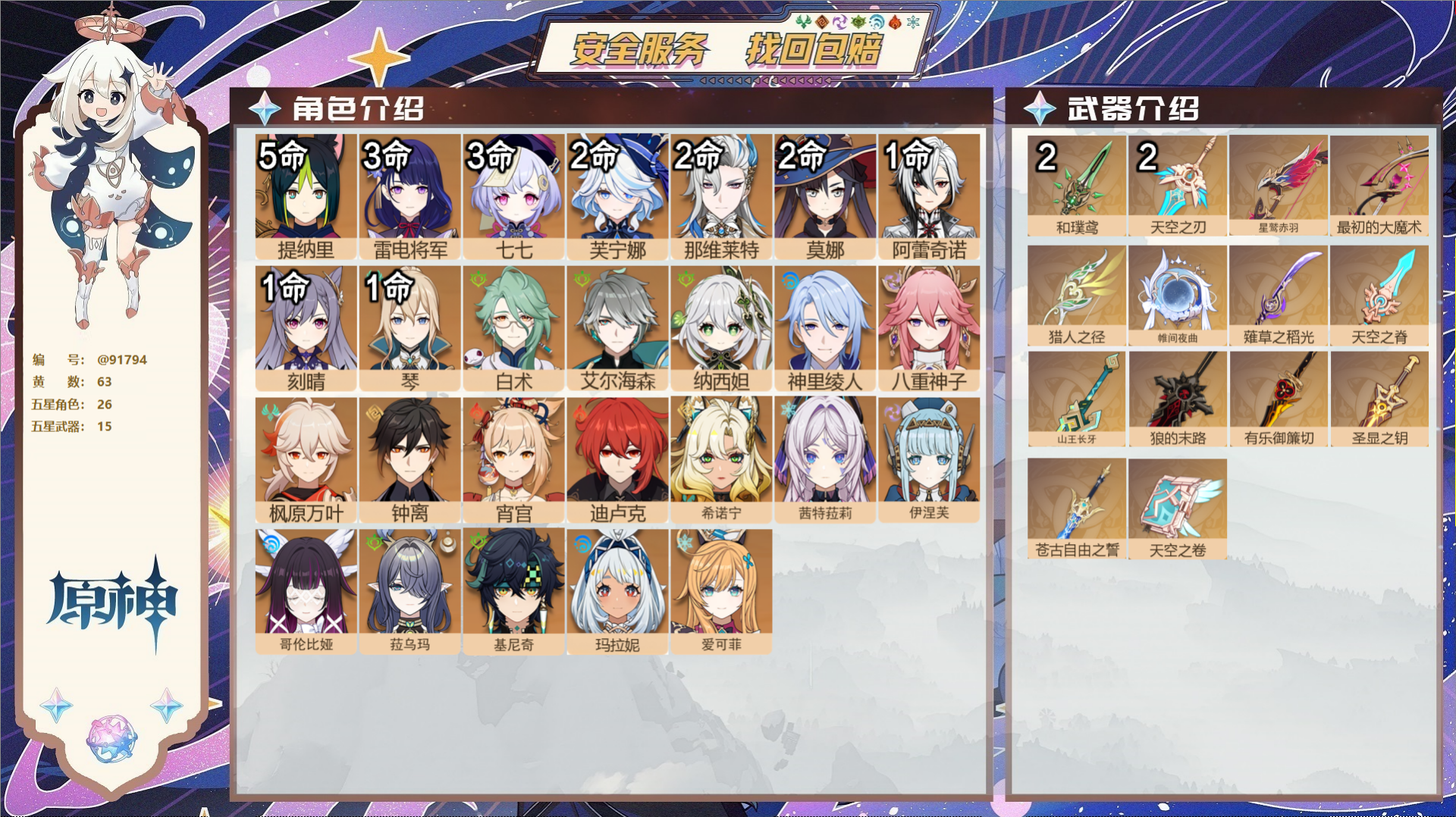 PX_2522166-,送未实名邮箱,,冒险等级60级,男主,63黄,26个五星角色,15个五星武器,纠缠之源0--原石131--圣遗物346--【时装】,聆雨听竹,炽绘奇旅,岁夜欢哗,倩影游侠,