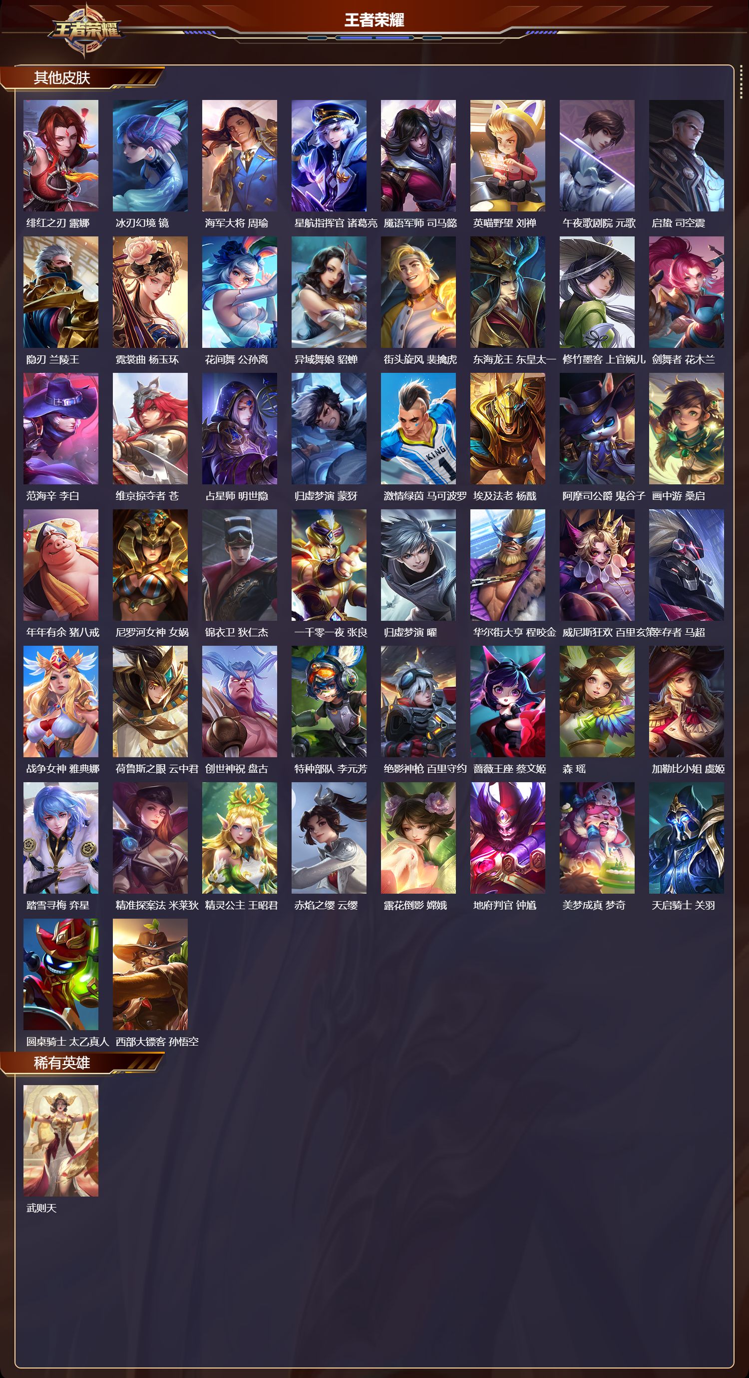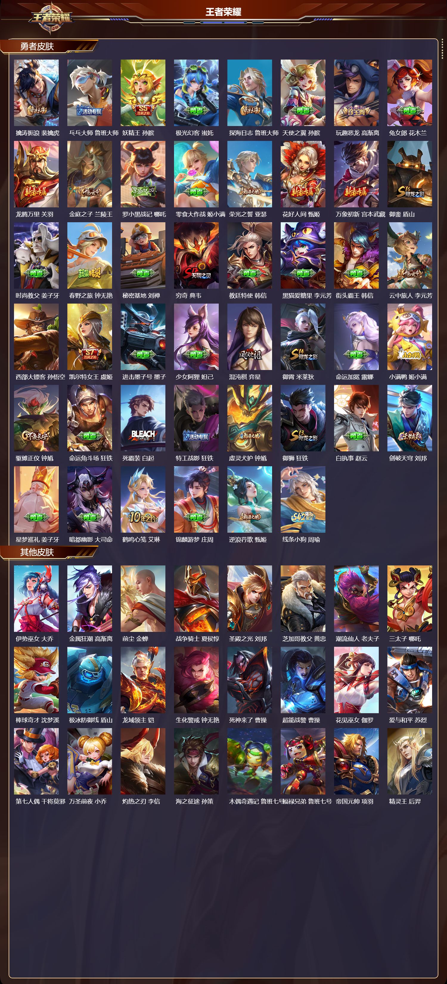 【74,其他皮肤】伊势巫女,大乔,金属狂潮,高渐离,前尘,金蝉,战争骑士,夏侯惇,圣殿之光,刘邦,芝加哥教父,黄忠,潮流仙人,老夫子,三太子,哪吒,棒球奇才,沈梦溪,极冰防御线,盾山,龙域领主,铠,生化警戒,钟无艳,死神来了,曹操,超能战警,曹操,花见巫女,伽罗,爱与和平,苏烈,第七人偶,干将莫邪,万圣前夜,小乔,灼热之刃,李信,海之征途,孙策,木偶奇遇记,鲁班七号,福禄兄弟,鲁班七号,帝国元帅,项羽,精灵王,后羿,绯红之刃,露娜,冰刃幻境,镜,海军大将,周瑜,星航指挥官,诸葛亮,魇语军师,司马懿,英喵野望,刘禅,午夜歌剧院,元歌,启蛰,司空震,隐刃,兰陵王,霓裳曲,杨玉环,花间舞,公孙离,异域舞娘,貂蝉,街头旋风,裴擒虎,东海龙王,东皇太一,修竹墨客,上官婉儿,剑舞者,花木兰,范海辛,李白,维京掠夺者,苍,占星师,明世隐,归虚梦演,蒙犽,激情绿茵,马可波罗,埃及法老,杨戬,阿摩司公爵,鬼谷子,画中游,桑启,年年有余,猪八戒,尼罗河女神,女娲,锦衣卫,狄仁杰,一千零一夜,张良,归虚梦演,曜,华尔街大亨,程咬金,威尼斯狂欢,百里玄策,幸存者,马超,战争女神,雅典娜,荷鲁斯之眼,云中君,创世神祝,盘古,特种部队,李元芳,绝影神枪,百里守约,蔷薇王座,蔡文姬,森,瑶,加勒比小姐,虞姬,踏雪寻梅,弈星,精准探案法,米莱狄,精灵公主,王昭君,赤焰之缨,云缨,露花倒影,嫦娥,地府判官,钟馗,美梦成真,梦奇,天启骑士,关羽,圆桌骑士,太乙真人,西部大镖客,孙悟空,