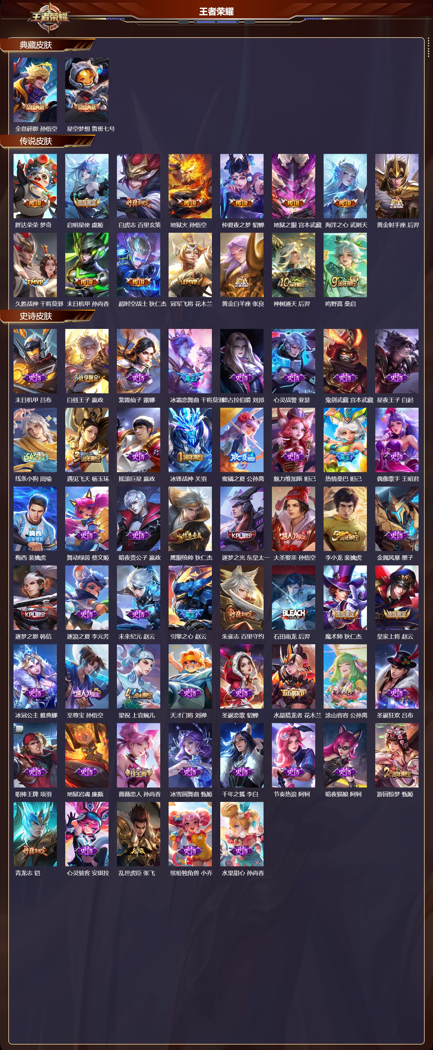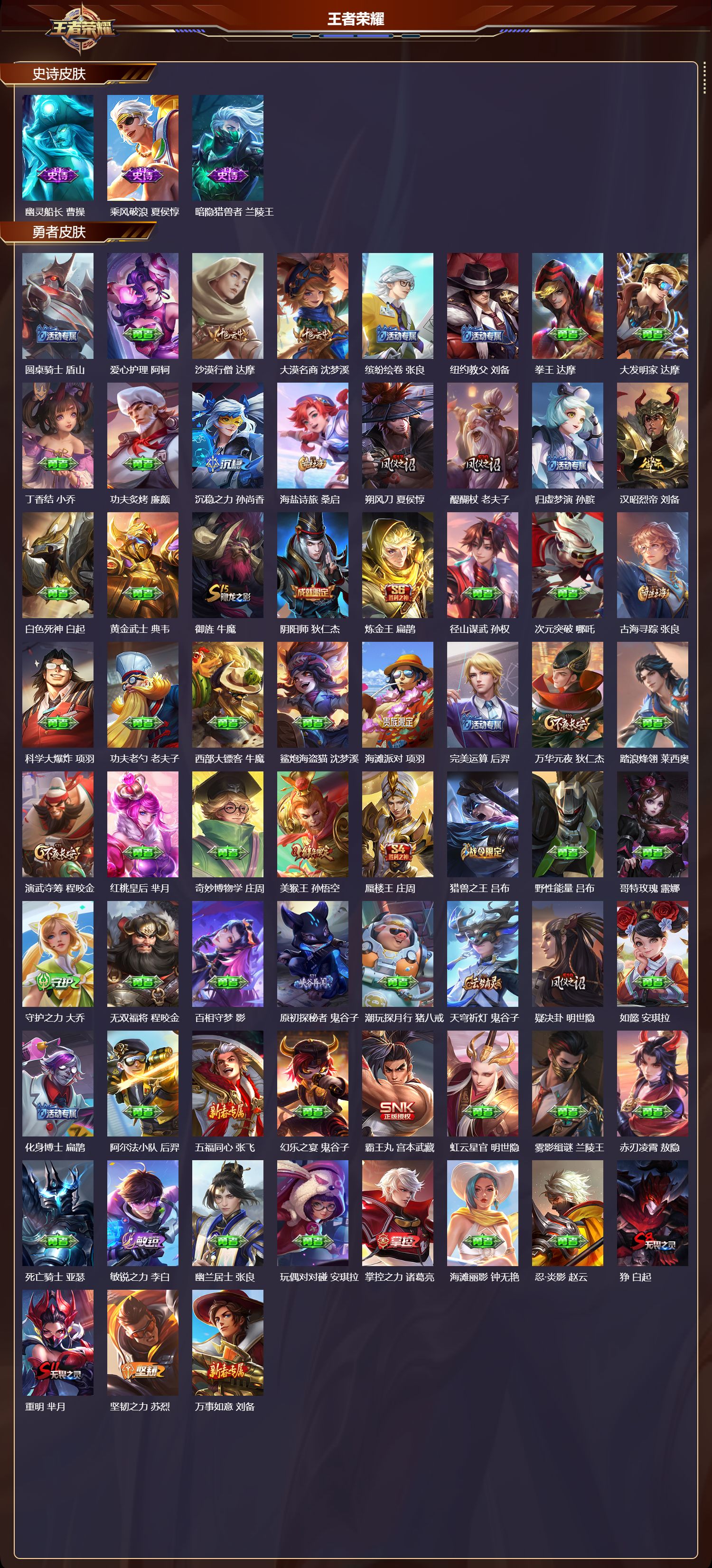 【56,史诗皮肤】末日机甲,吕布,白昼王子,嬴政,紫霞仙子,露娜,冰霜恋舞曲,干将莫邪,德古拉伯爵,刘邦,心灵战警,亚瑟,鬼剑武藏,宫本武藏,星夜王子,白起,线条小狗,周瑜,遇见飞天,杨玉环,摇滚巨星,嬴政,冰锋战神,关羽,蜜橘之夏,公孙离,魅力维加斯,妲己,热情桑巴,妲己,偶像歌手,王昭君,梅西,裴擒虎,舞动绿茵,蔡文姬,暗夜贵公子,嬴政,鹰眼统帅,狄仁杰,逐梦之光,东皇太一,大圣娶亲,孙悟空,李小龙,裴擒虎,金属风暴,墨子,逐梦之影,韩信,逐浪之夏,李元芳,未来纪元,赵云,引擎之心,赵云,朱雀志,百里守约,石田雨龙,后羿,魔术师,狄仁杰,皇家上将,赵云,冰冠公主,雅典娜,至尊宝,孙悟空,梁祝,上官婉儿,天才门将,刘禅,圣诞恋歌,貂蝉,水晶猎龙者,花木兰,涂山容容,公孙离,圣诞狂欢,吕布,职棒王牌,项羽,地狱岩魂,廉颇,蔷薇恋人,孙尚香,冰雪圆舞曲,甄姬,千年之狐,李白,节奏热浪,阿轲,暗夜猫娘,阿轲,游园惊梦,甄姬,青龙志,铠,心灵骇客,安琪拉,乱世虎臣,张飞,缤纷独角兽,小乔,水果甜心,孙尚香,幽灵船长,曹操,乘风破浪,夏侯惇,暗隐猎兽者,兰陵王,