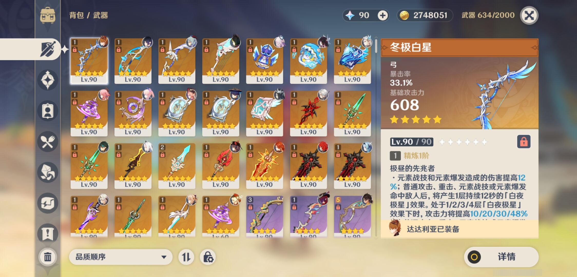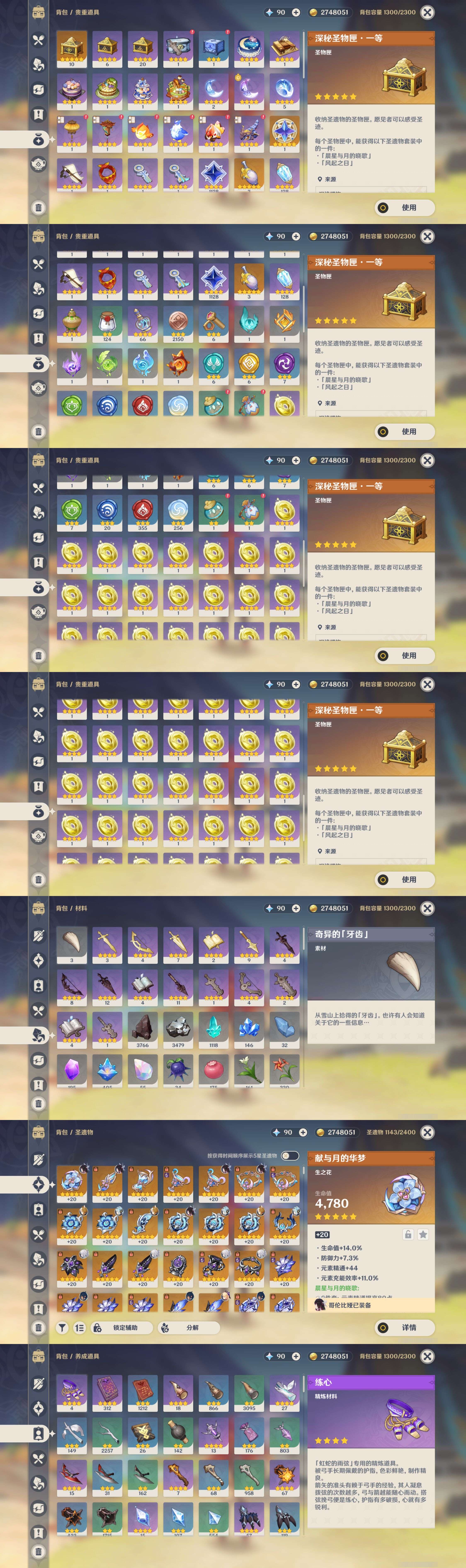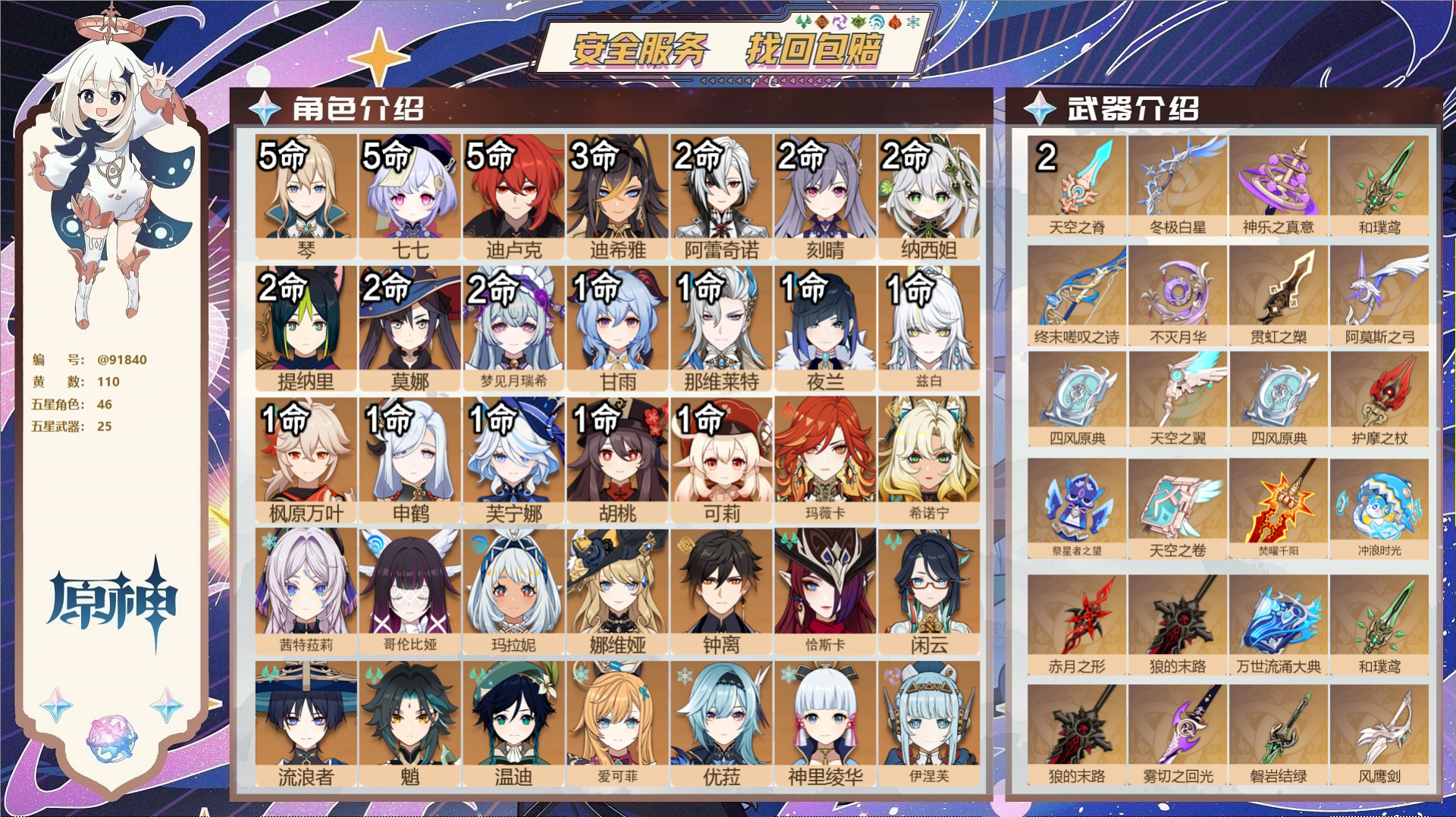 【25个五星武器】,精2天空之脊,精1冬极白星,精1神乐之真意,精1和璞鸢,精1终末嗟叹之诗,精1不灭月华,精1贯虹之槊,精1阿莫斯之弓,精1四风原典,精1天空之翼,精1四风原典,精1护摩之杖,精1祭星者之望,精1天空之卷,精1焚曜千阳,精1冲浪时光,精1赤月之形,精1狼的末路,精1万世流涌大典,精1和璞鸢,精1狼的末路,精1雾切之回光,精1磐岩结绿,精1风鹰剑,精1神乐之真意,10套,
