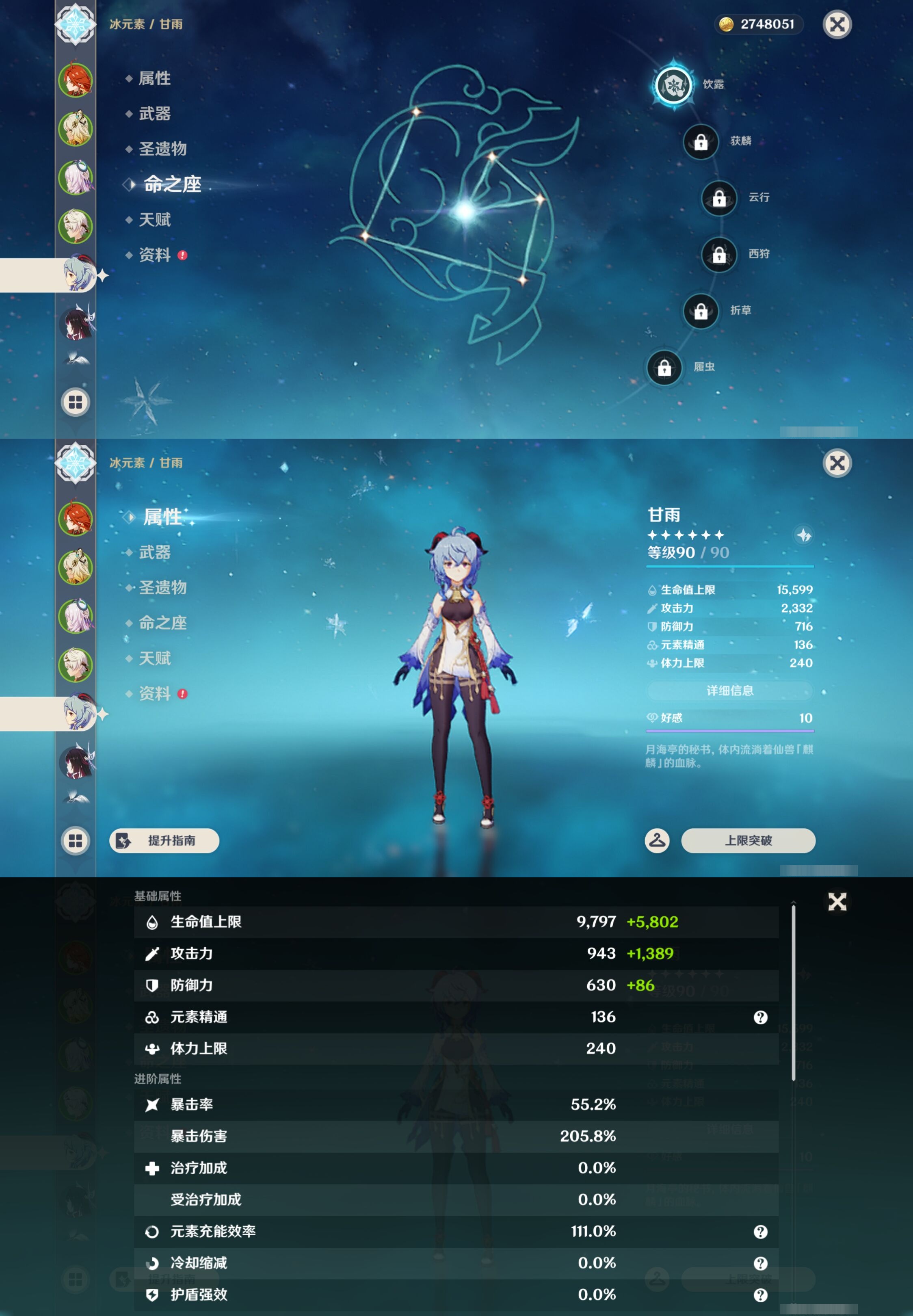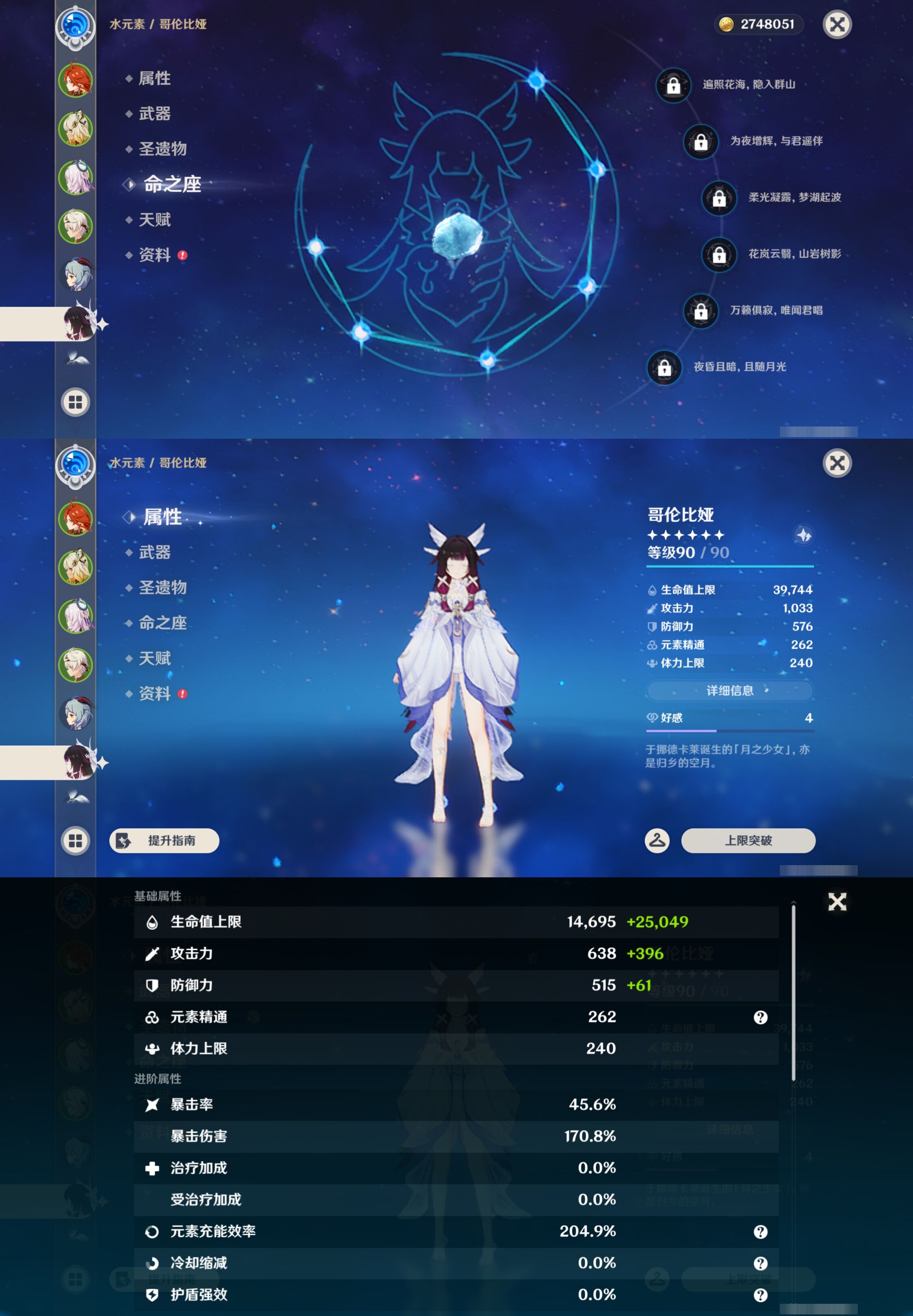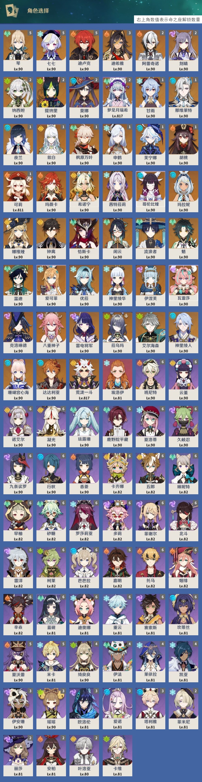 【46个五星角色】,5命琴,5命七七,5命迪卢克,3命迪希雅,2命阿蕾奇诺,2命刻晴,2命纳西妲,2命提纳里,2命莫娜,2命梦见月瑞希,1命甘雨,1命那维莱特,1命夜兰,1命兹白,1命枫原万叶,1命申鹤,1命芙宁娜,1命胡桃,1命可莉,0命玛薇卡,0命希诺宁,0命茜特菈莉,0命哥伦比娅,0命玛拉妮,0命娜维娅,0命钟离,0命恰斯卡,0命闲云,0命流浪者,0命魈,0命温迪,0命爱可菲,0命优菈,0命神里绫华,0命伊涅芙,0命瓦雷莎,0命克洛琳德,0命八重神子,0命雷电将军,0命菈乌玛,0命艾尔海森,0命神里绫人,0命珊瑚宫心海,0命达达利亚,0命荒泷一斗,0命埃洛伊,