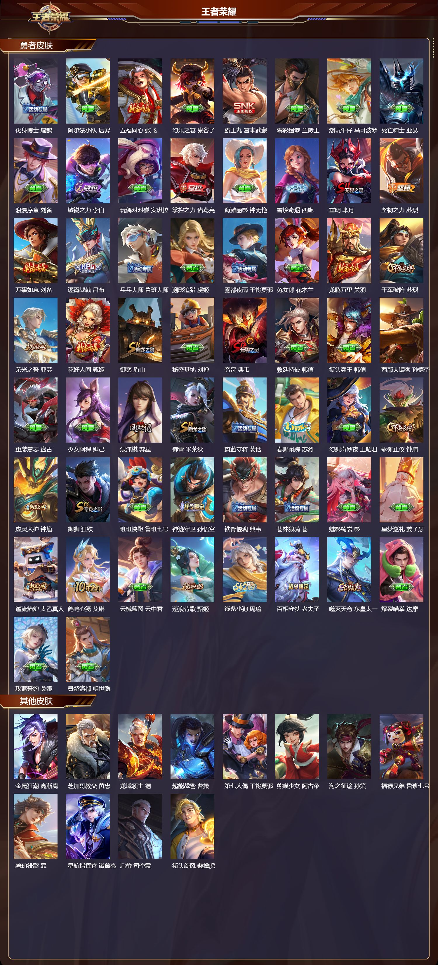 【33,其他皮肤】金属狂潮,高渐离,芝加哥教父,黄忠,龙域领主,铠,超能战警,曹操,第七人偶,干将莫邪,熊喵少女,阿古朵,海之征途,孙策,福禄兄弟,鲁班七号,碧珀绯影,暃,星航指挥官,诸葛亮,启蛰,司空震,街头旋风,裴擒虎,归虚梦演,鲁班大师,维京掠夺者,苍,占星师,明世隐,归虚梦演,蒙犽,激情绿茵,马可波罗,埃及法老,杨戬,阿摩司公爵,鬼谷子,年年有余,猪八戒,尼罗河女神,女娲,一千零一夜,张良,归虚梦演,曜,幸存者,马超,创世神祝,盘古,特种部队,李元芳,绝影神枪,百里守约,蔷薇王座,蔡文姬,孤猎,澜,加勒比小姐,虞姬,地府判官,钟馗,天启骑士,关羽,西部大镖客,孙悟空,