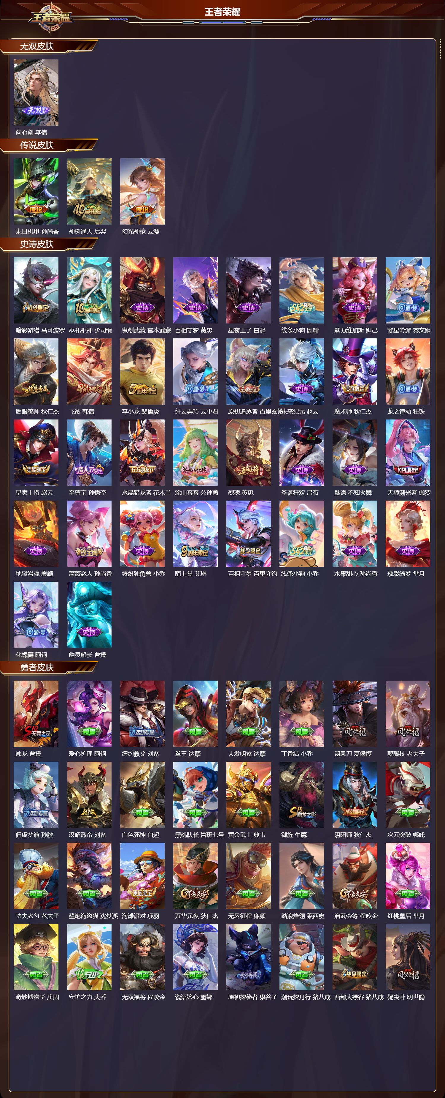 【90,勇者皮肤】烛龙,曹操,爱心护理,阿轲,纽约教父,刘备,拳王,达摩,大发明家,达摩,丁香结,小乔,朔风刀,夏侯惇,醍醐杖,老夫子,归虚梦演,孙膑,汉昭烈帝,刘备,白色死神,白起,黑桃队长,鲁班七号,黄金武士,典韦,御旌,牛魔,阴阳师,狄仁杰,次元突破,哪吒,功夫老勺,老夫子,鲨炮海盗猫,沈梦溪,海滩派对,项羽,万华元夜,狄仁杰,无尽征程,廉颇,踏浪烽翎,莱西奥,演武夺筹,程咬金,红桃皇后,芈月,奇妙博物学,庄周,守护之力,大乔,无双福将,程咬金,瓷语鉴心,露娜,原初探秘者,鬼谷子,潮玩探月行,猪八戒,西部大镖客,猪八戒,疑决卦,明世隐,化身博士,扁鹊,阿尔法小队,后羿,五福同心,张飞,幻乐之宴,鬼谷子,霸王丸,宫本武藏,雾影缉谜,兰陵王,潮玩牛仔,马可波罗,死亡骑士,亚瑟,浪漫序章,刘备,敏锐之力,李白,玩偶对对碰,安琪拉,掌控之力,诸葛亮,海滩丽影,钟无艳,雪境奇遇,西施,重明,芈月,坚韧之力,苏烈,万事如意,刘备,逐霄战戟,吕布,乓乓大师,鲁班大师,溯影追猎,虞姬,雾都夜雨,干将莫邪,兔女郎,花木兰,龙腾万里,关羽,千军破阵,苏烈,荣光之誓,亚瑟,花好人间,甄姬,御銮,盾山,秘密基地,刘禅,穷奇,典韦,教廷特使,韩信,街头霸王,韩信,西部大镖客,孙悟空,重装意志,盘古,少女阿狸,妲己,混沌棋,弈星,御霄,米莱狄,蔚蓝守将,蒙恬,春野闲踪,苏烈,幻想奇妙夜,王昭君,驱傩正仪,钟馗,虚灵犬护,钟馗,御狮,狂铁,班班快跑,鲁班七号,神迹守卫,孙悟空,铁骨偃魂,典韦,苍林狼骑,苍,魅影绮裳,影,星梦巡礼,姜子牙,谧流熔炉,太乙真人,鹤鸣心笺,艾琳,云械蓝图,云中君,逆浪荇歌,甄姬,线条小狗,周瑜,百相守梦,老夫子,噬灭天穹,东皇太一,爆裂喵拳,达摩,玫蓝誓约,戈娅,景韶洛都,明世隐,