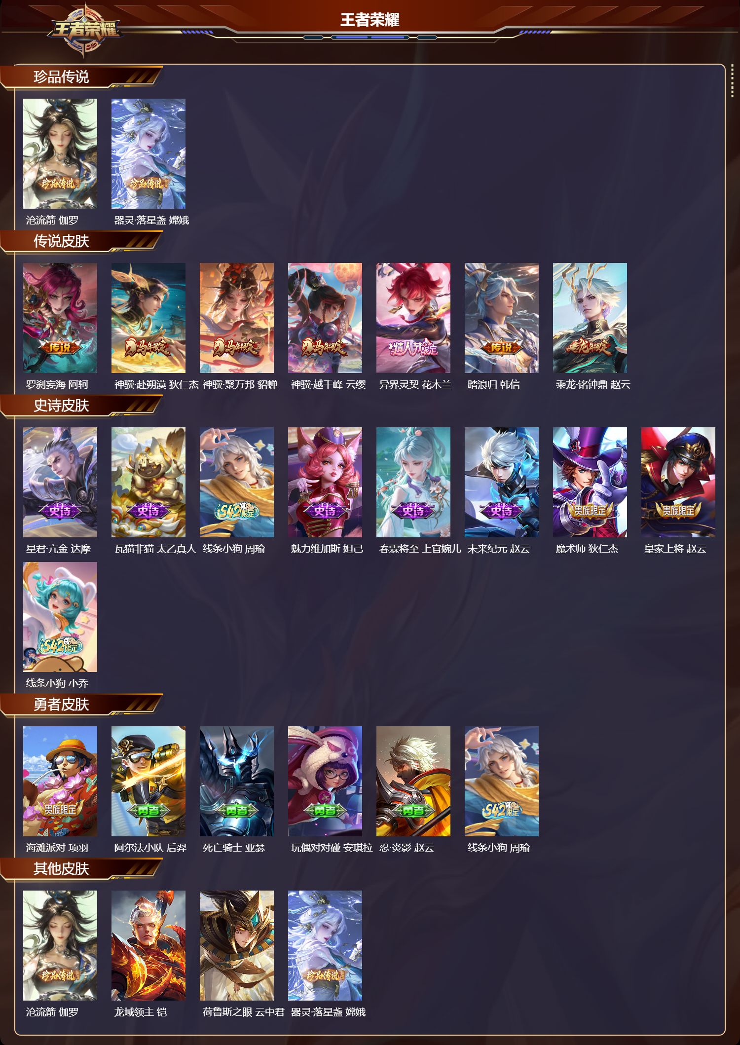 【7,传说皮肤】罗刹妄海,阿轲,神骥·赴朔漠,狄仁杰,神骥·聚万邦,貂蝉,神骥·越千峰,云缨,异界灵契,花木兰,踏浪归,韩信,乘龙·铭钟鼎,赵云,