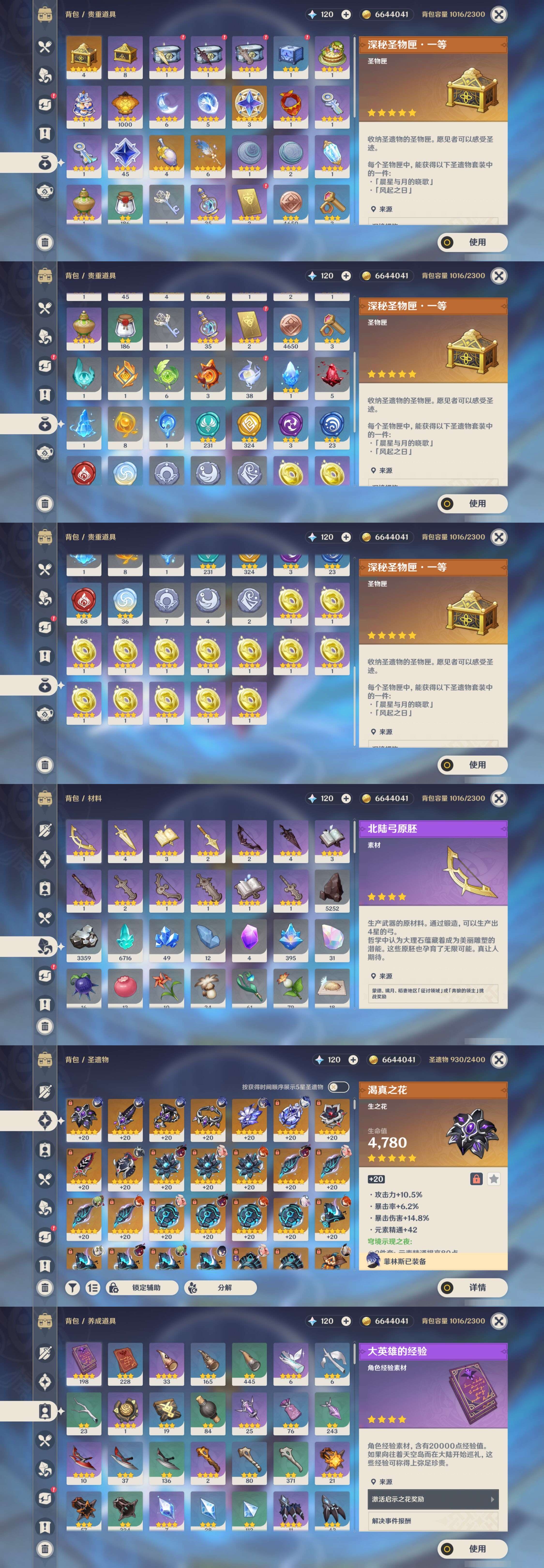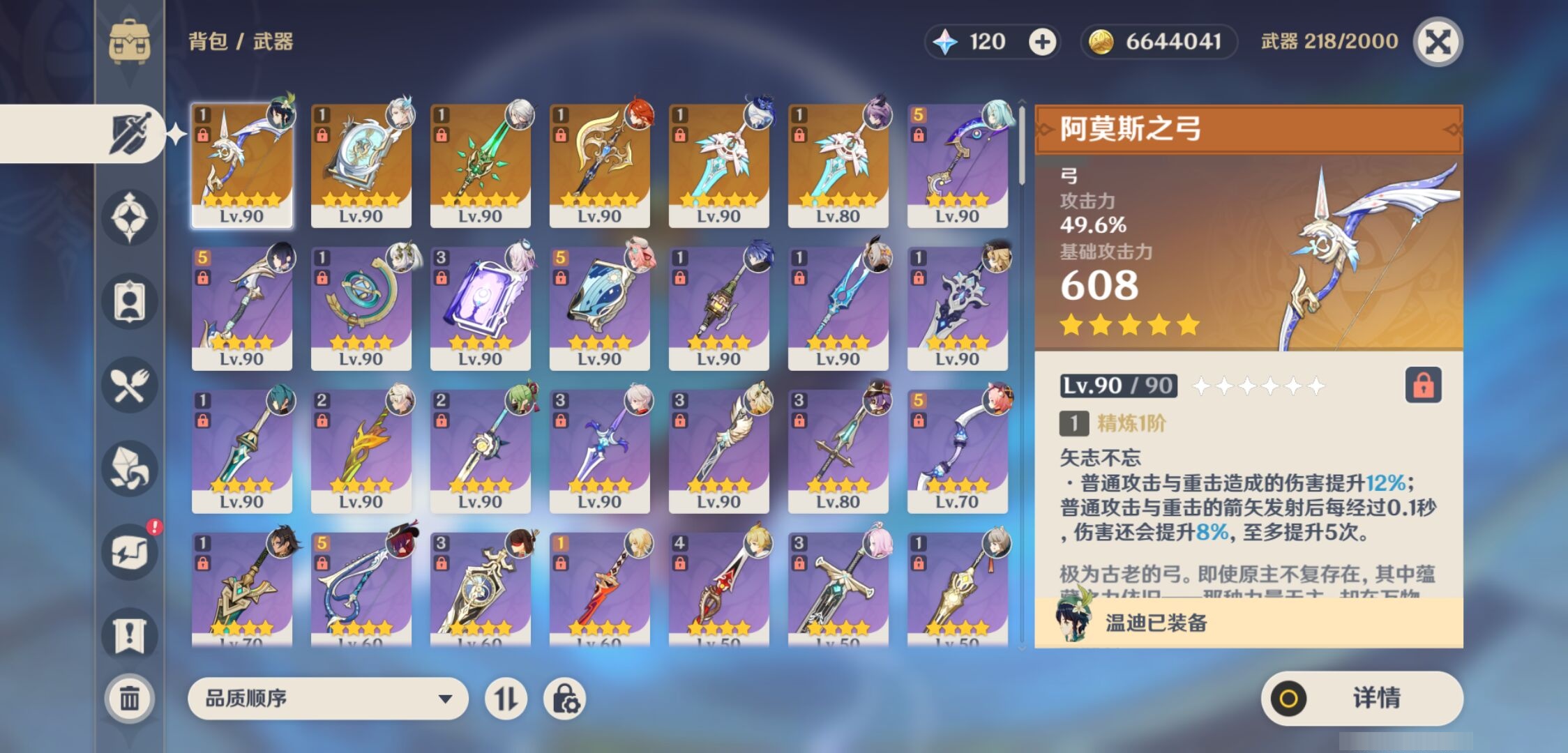 【6个五星武器】,精1阿莫斯之弓,精1四风原典,精1和璞鸢,精1裁断,精1天空之刃,精1天空之刃,3套,