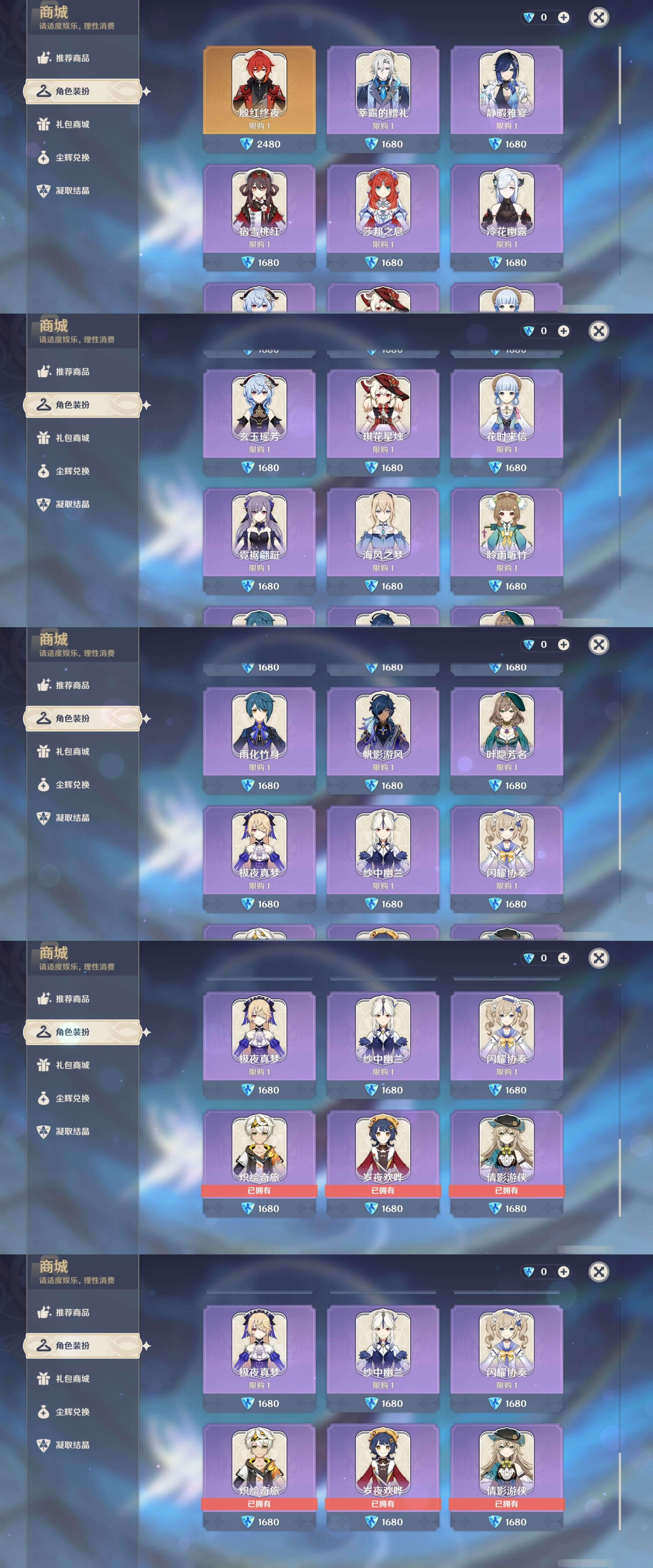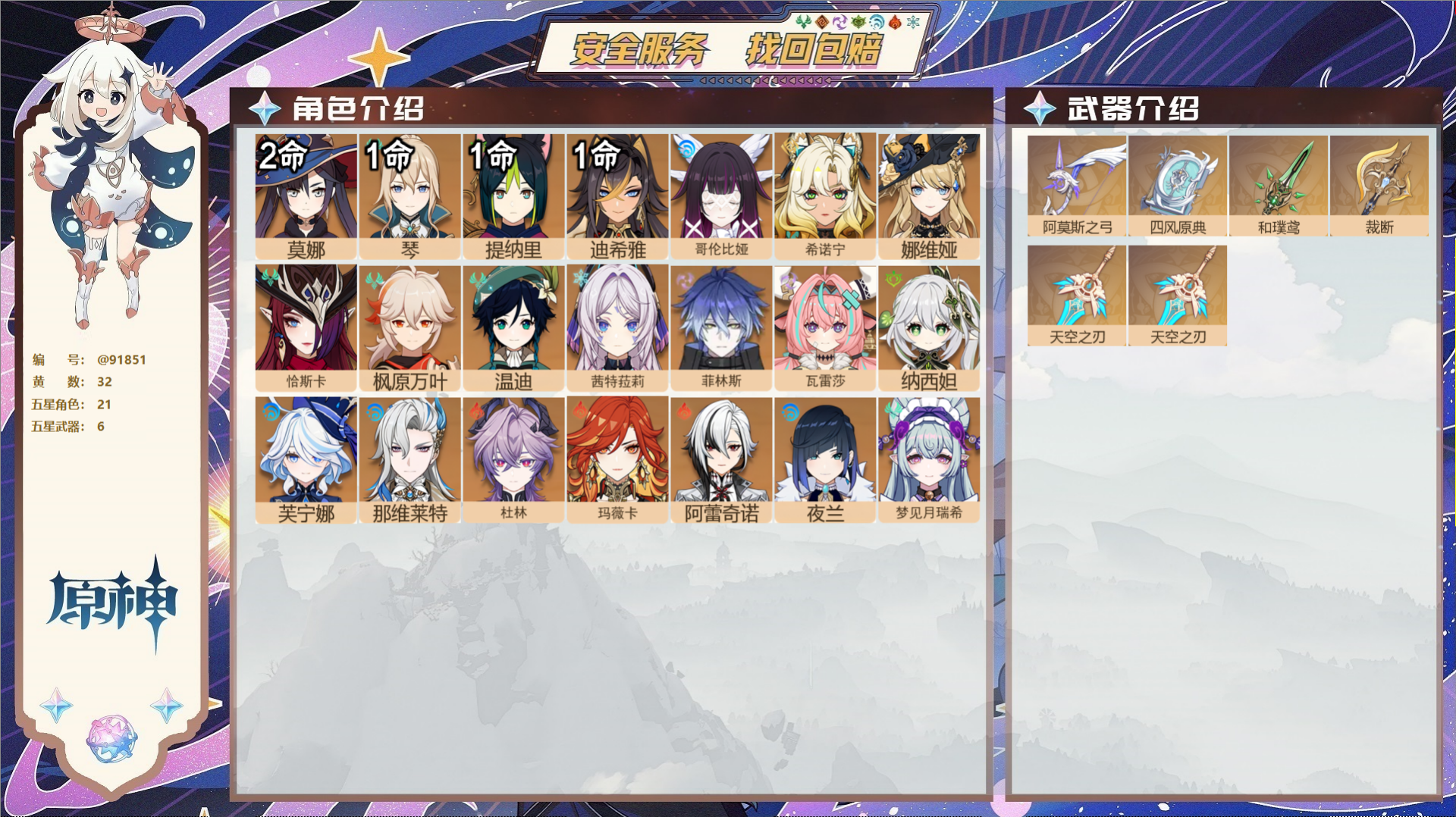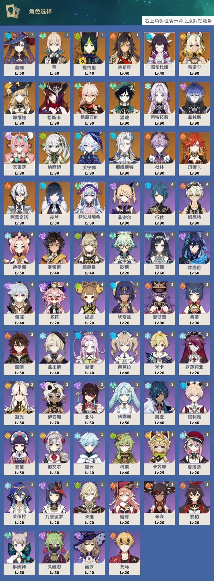【21个五星角色】,2命莫娜,1命琴,1命提纳里,1命迪希雅,0命哥伦比娅,0命希诺宁,0命娜维娅,0命恰斯卡,0命枫原万叶,0命温迪,0命茜特菈莉,0命菲林斯,0命瓦雷莎,0命纳西妲,0命芙宁娜,0命那维莱特,0命杜林,0命玛薇卡,0命阿蕾奇诺,0命夜兰,0命梦见月瑞希,