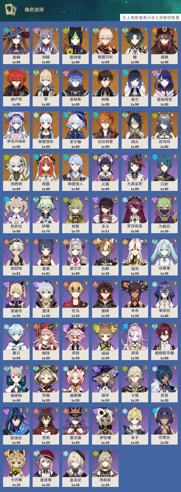 【21个五星角色】,5命莫娜,3命刻晴,2命提纳里,1命枫原万叶,1命魈,1命胡桃,1命迪卢克,1命琴,0命菲林斯,0命钟离,0命夜兰,0命雷电将军,0命梦见月瑞希,0命神里绫华,0命芙宁娜,0命达达利亚,0命闲云,0命菈乌玛,0命纳西妲,0命妮露,0命神里绫人,