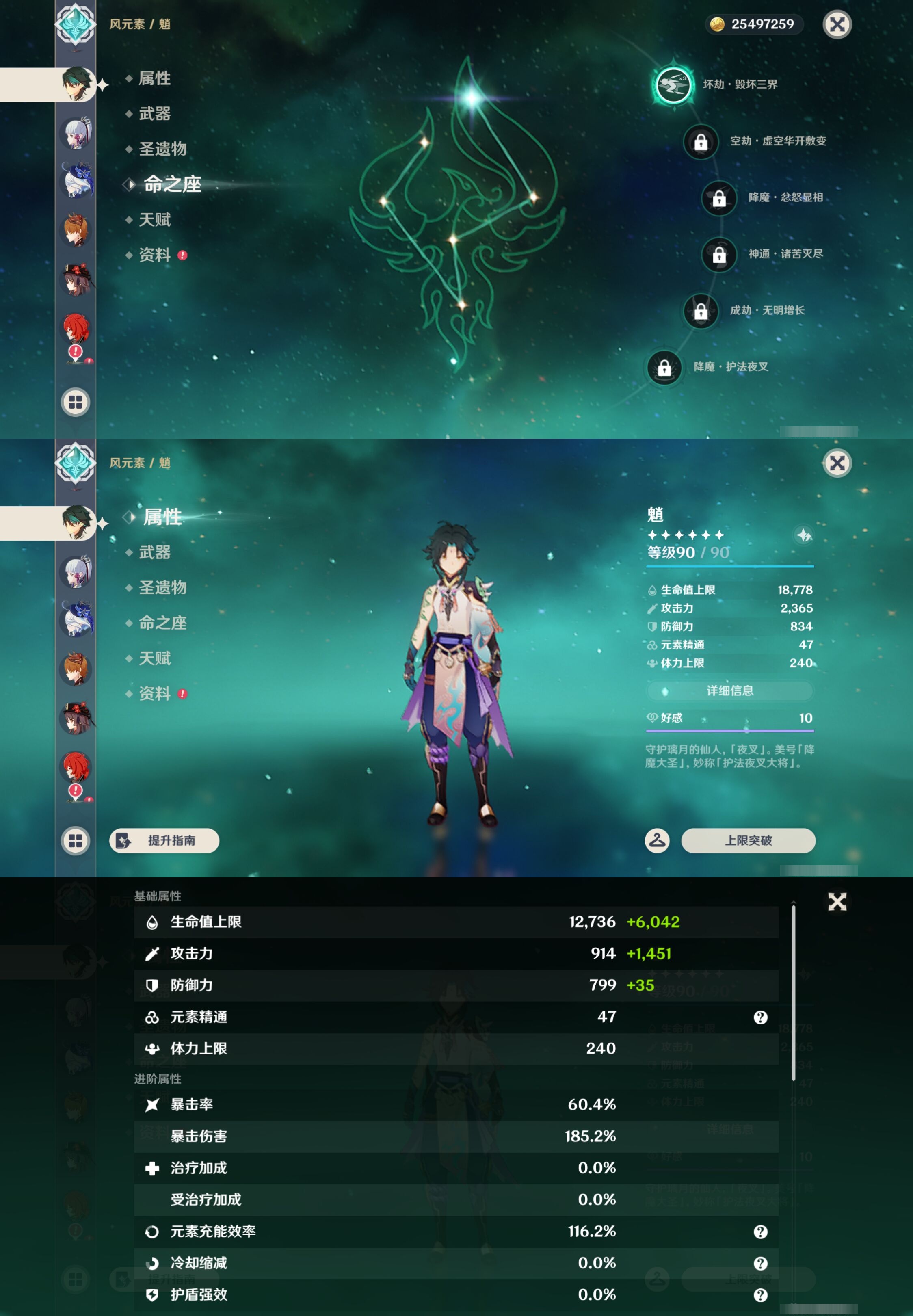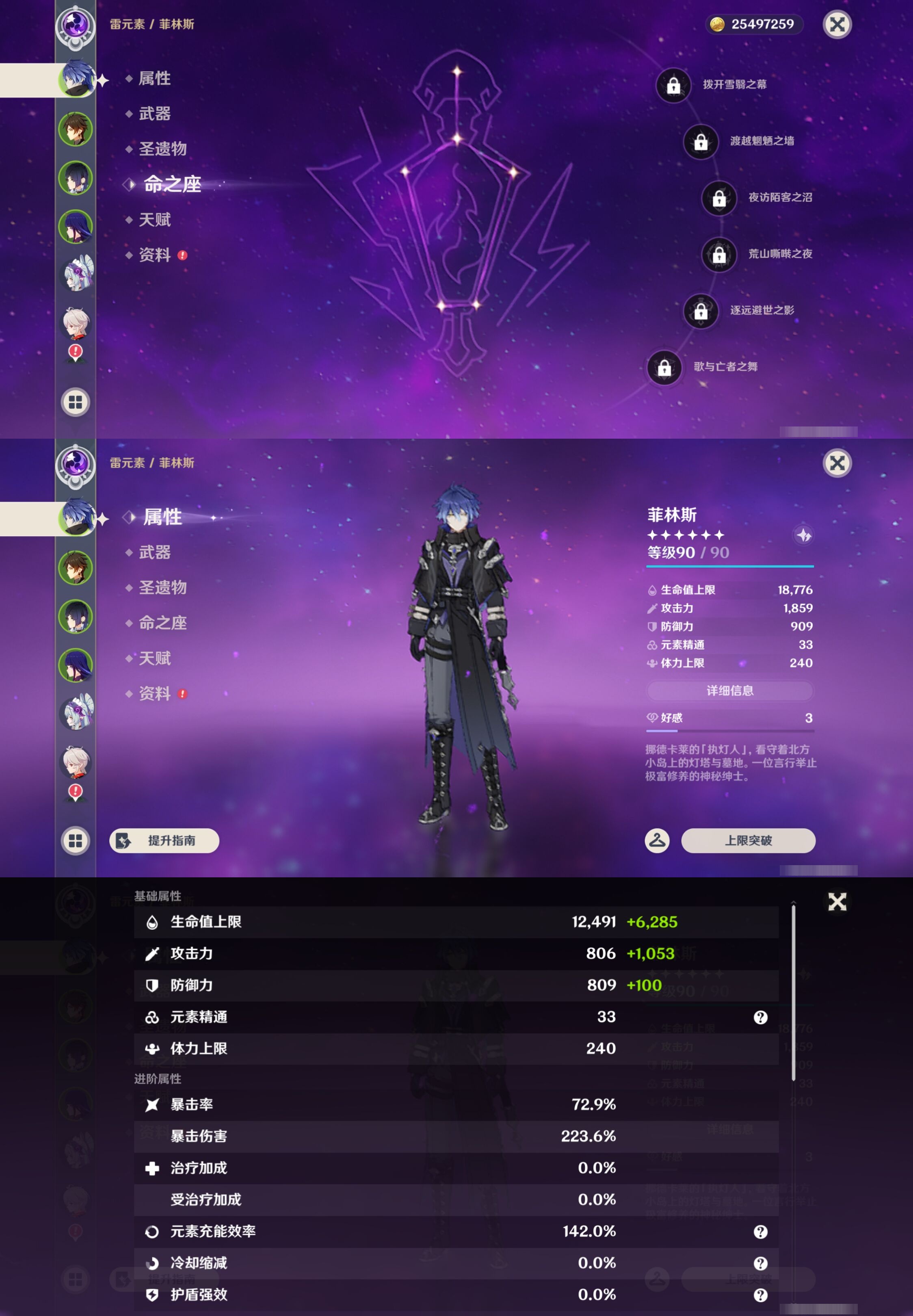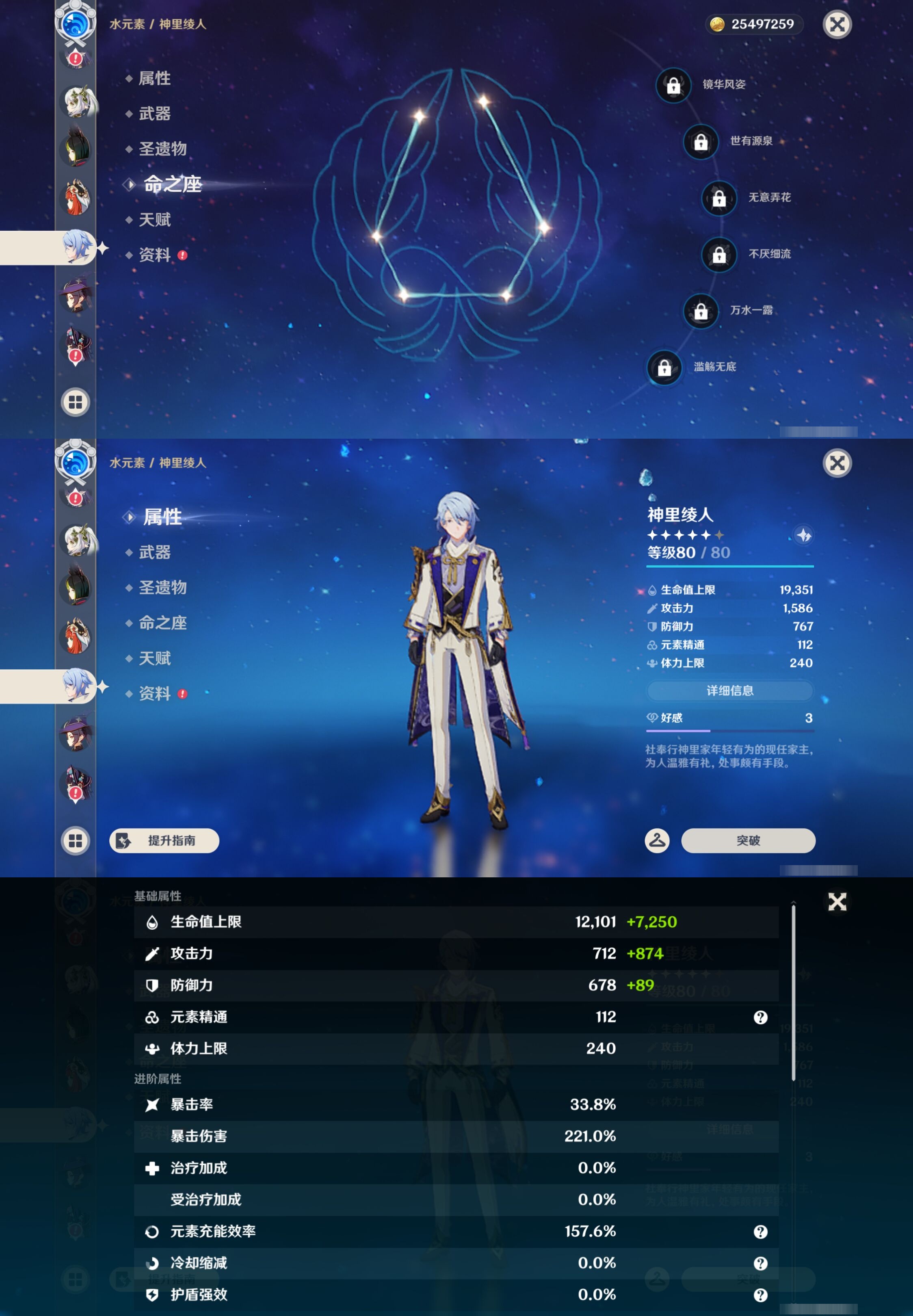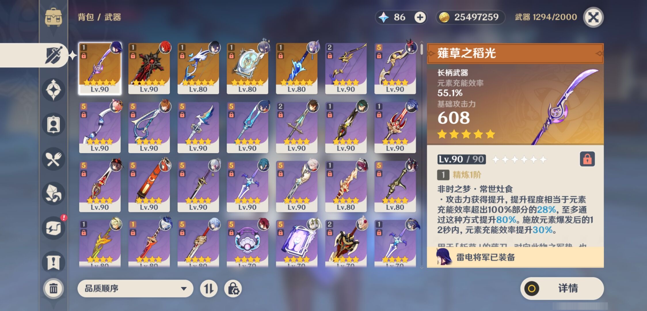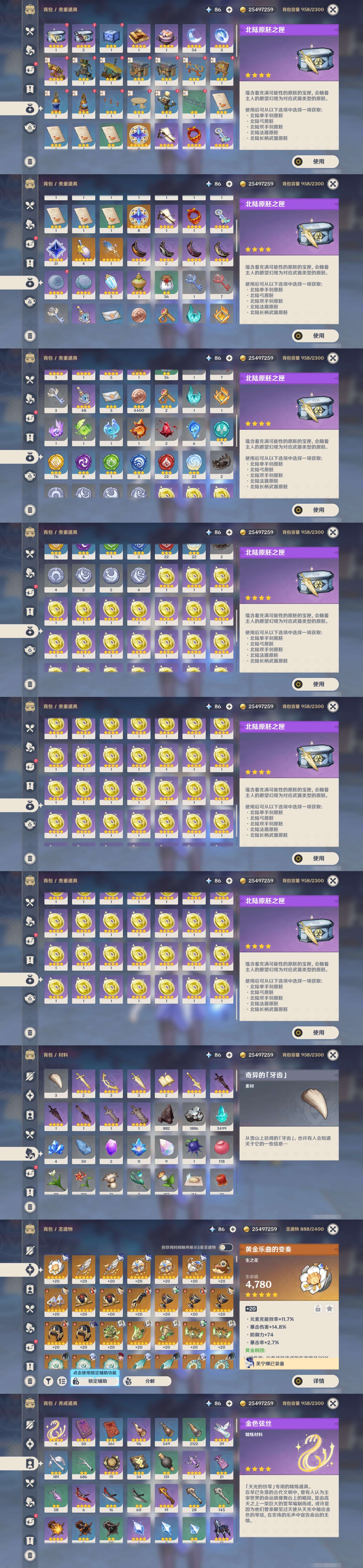 【5个五星武器】,精1薙草之稻光,精1狼的末路,精1若水,精1四风原典,精1波乱月白经津,四星角色:5命班尼特,4套,