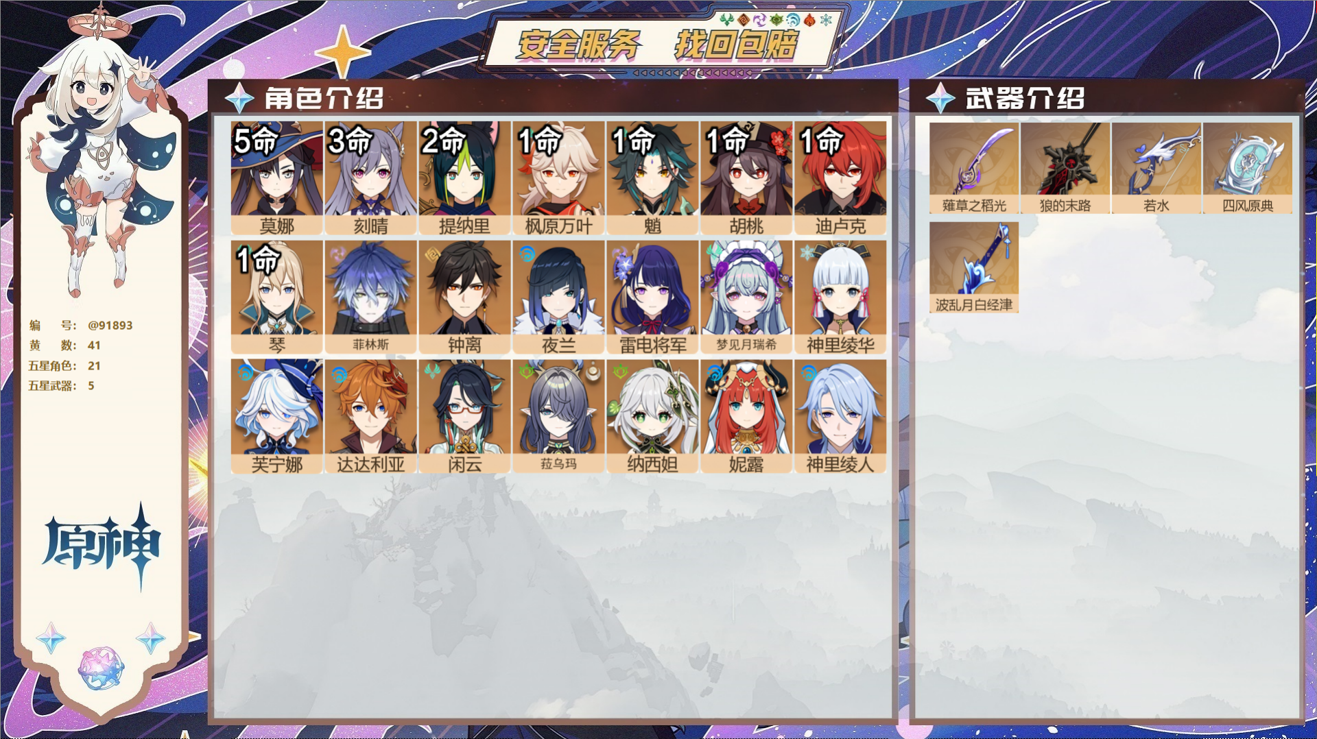 PX_2525926-,未绑定邮箱,,冒险等级60级,女主,41黄,21个五星角色,5个五星武器,纠缠之源0--原石86--圣遗物888--【时装】,叶隐芳名,纱中幽兰,雨化竹身,极夜真梦,