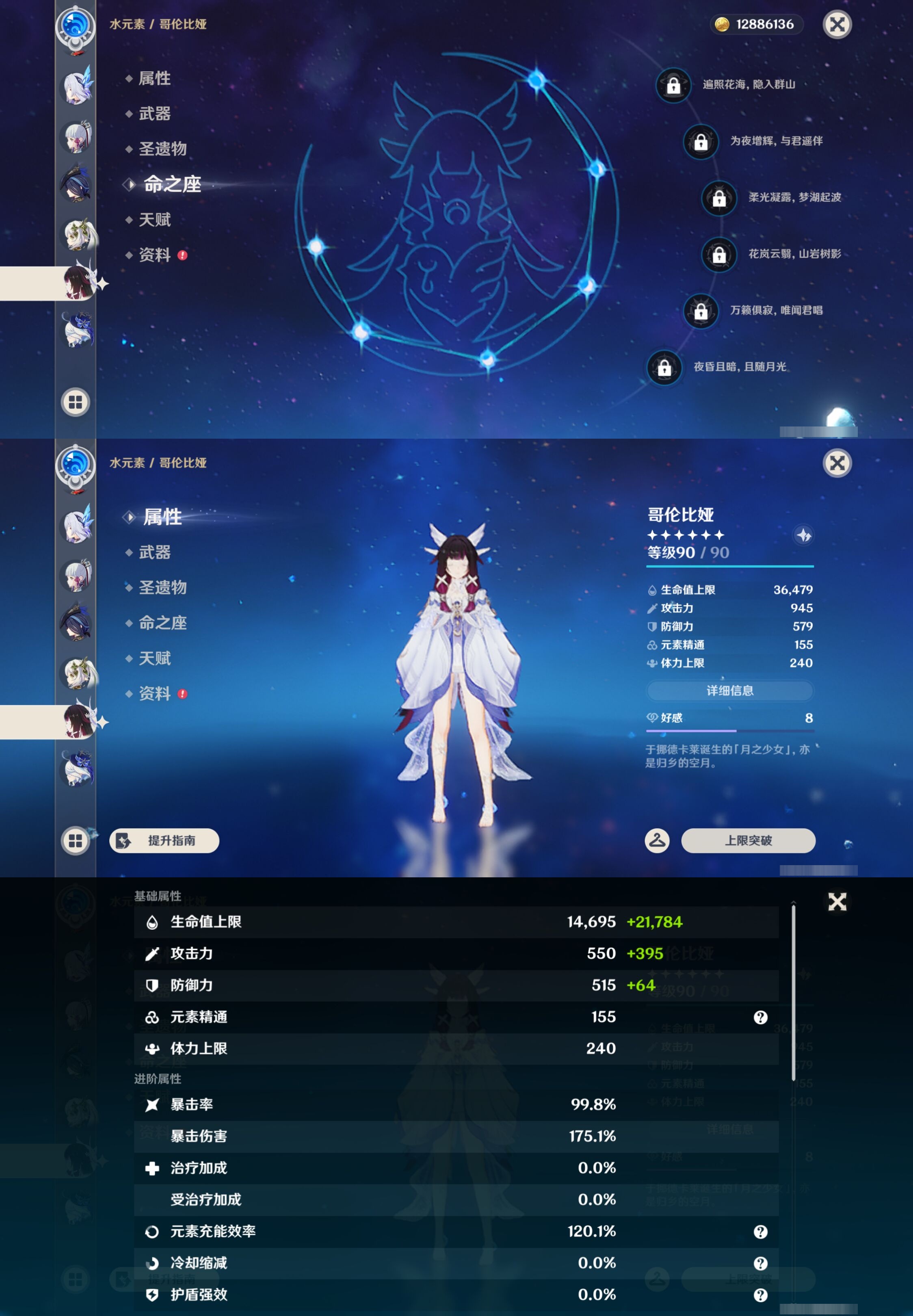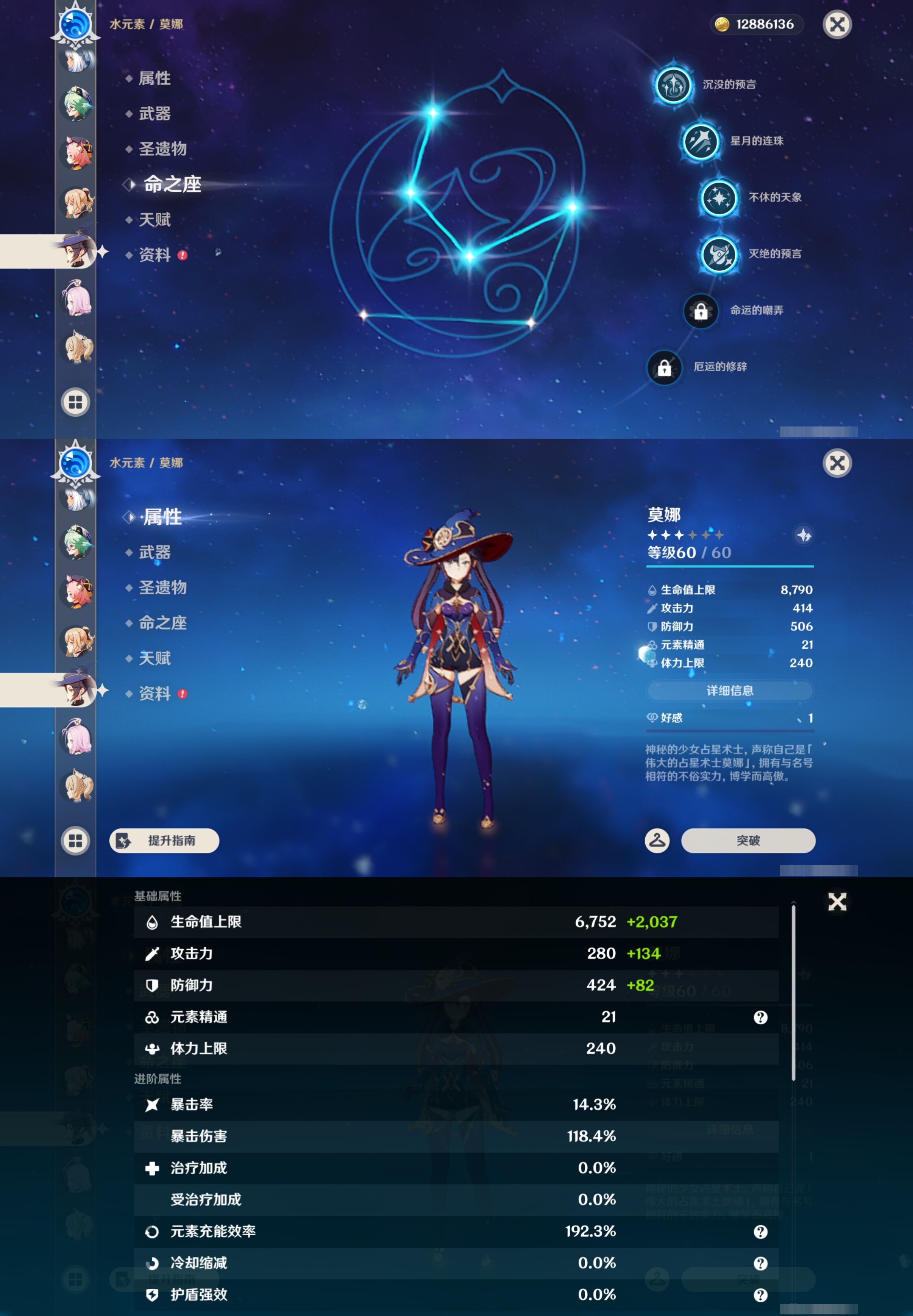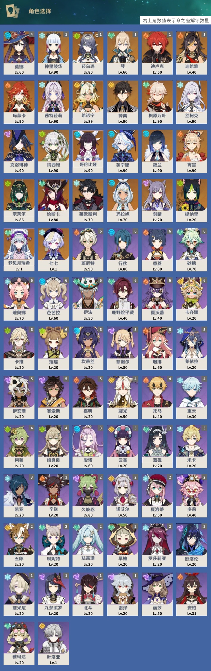 【26个五星角色】,4命莫娜,1命神里绫华,1命菈乌玛,1命琴,1命迪卢克,1命迪希雅,0命玛薇卡,0命茜特菈莉,0命希诺宁,0命钟离,0命枫原万叶,0命丝柯克,0命克洛琳德,0命纳西妲,0命哥伦比娅,0命芙宁娜,0命夜兰,0命宵宫,0命奈芙尔,0命恰斯卡,0命莱欧斯利,0命玛拉妮,0命刻晴,0命提纳里,0命梦见月瑞希,0命七七,