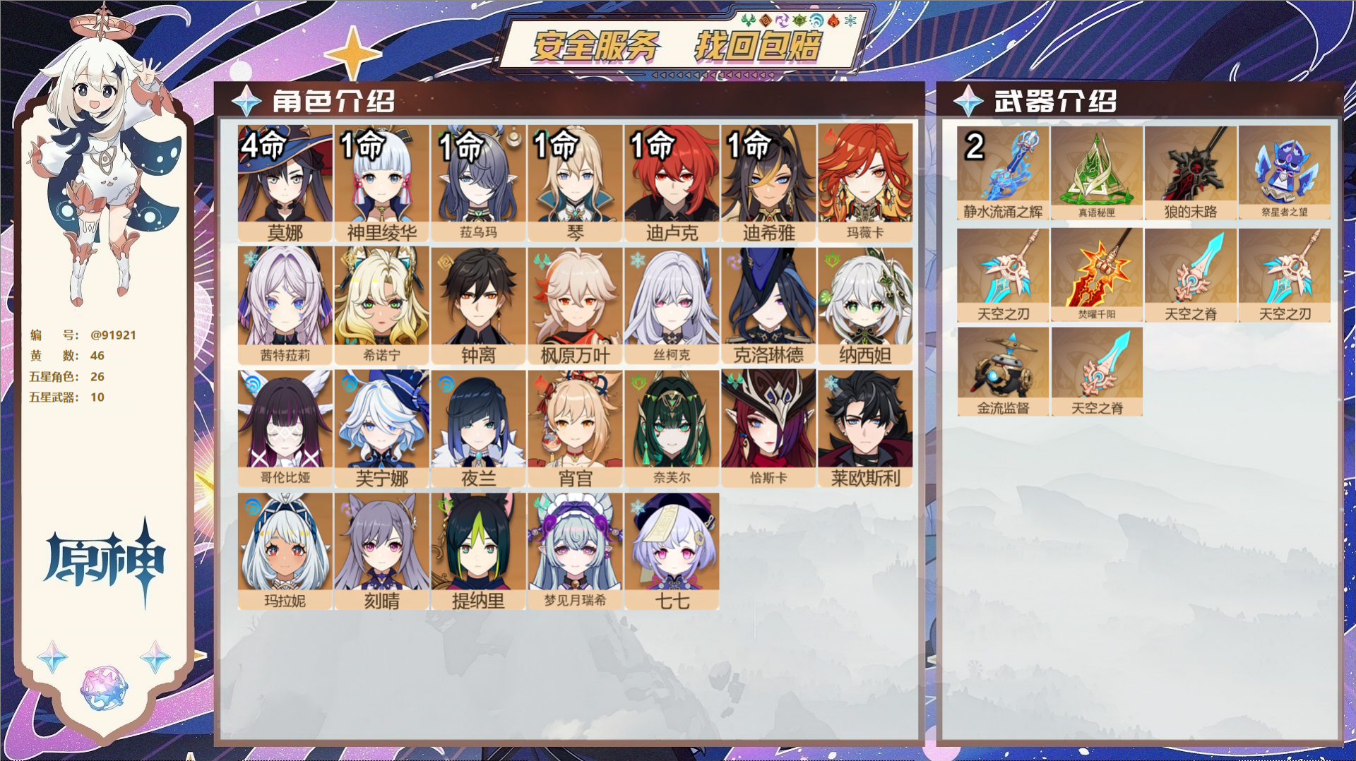 PX_2525941-,邮箱不出售,,冒险等级60级,女主,46黄,26个五星角色,10个五星武器,纠缠之源0--原石303--圣遗物968--【时装】,玲雨听竹,叶隐芳名,雨化竹身,帆影游风,倩影游侠,岁夜欢哗,