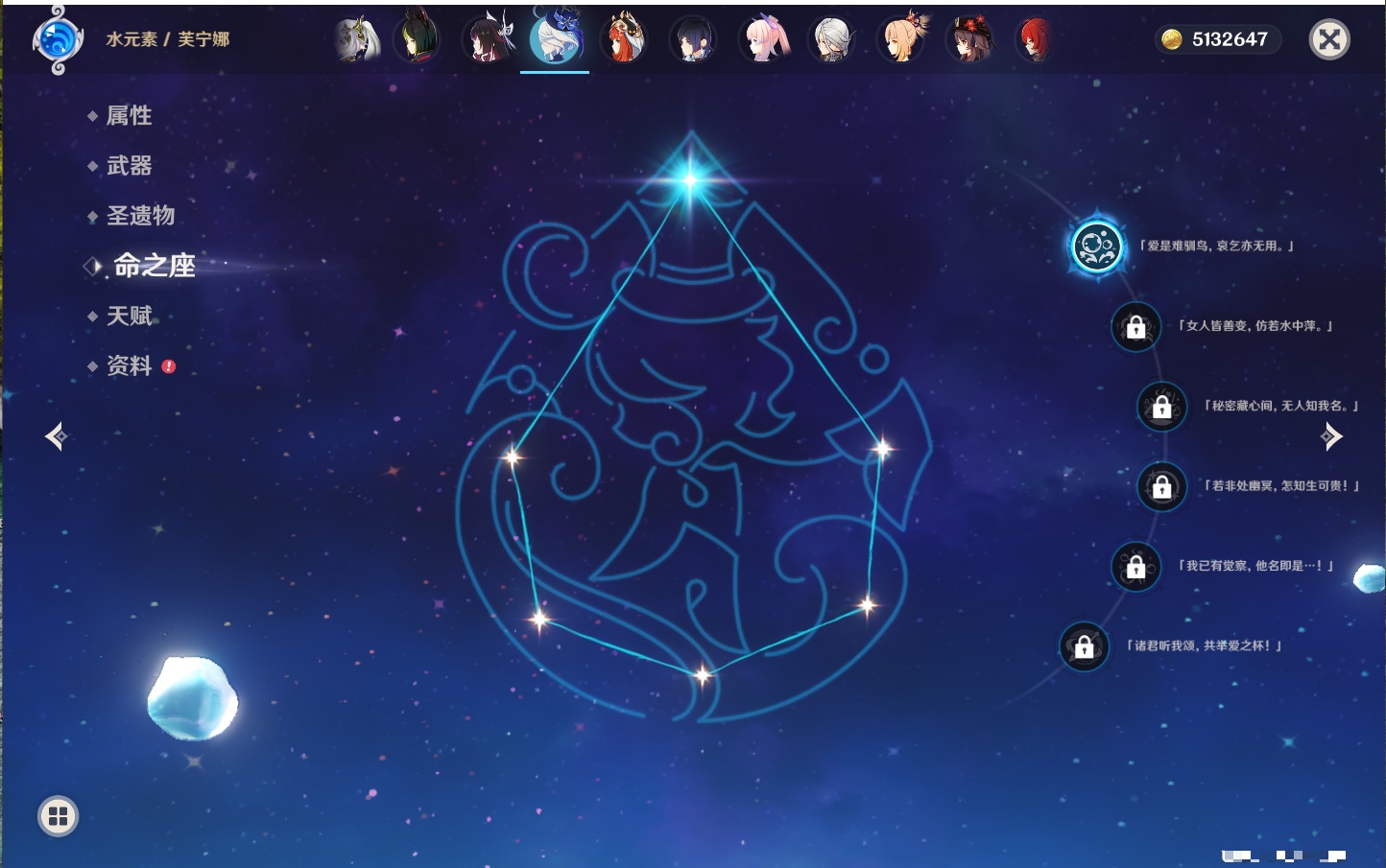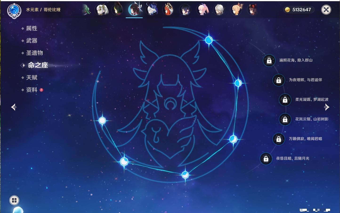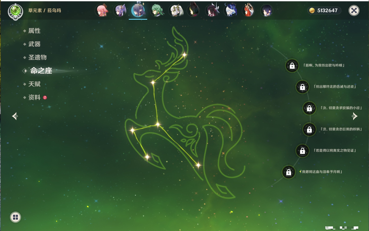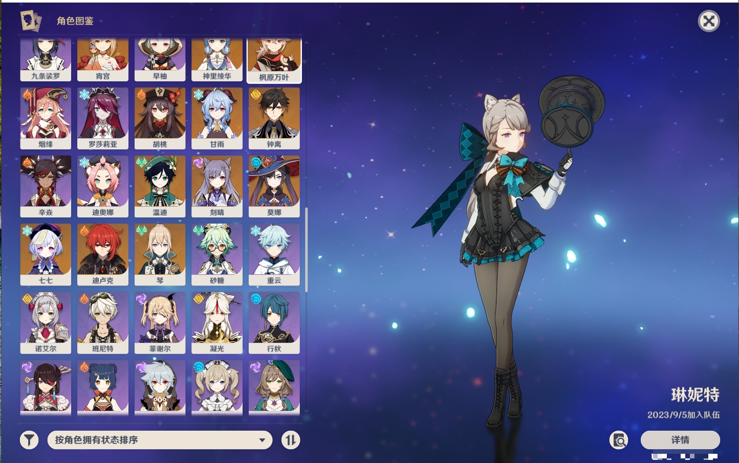 【33个五星角色】,满命提纳里,2命那维莱特,2命甘雨,2命刻晴,2命琴,2命迪卢克,1命芙宁娜,1命夜兰,1命枫原万叶,1命胡桃,1命菲林斯,0命克洛琳德,0命阿蕾奇诺,0命闲云,0命白术,0命流浪者,0命纳西妲,0命妮露,0命八重神子,0命申鹤,0命雷电将军,0命神里绫华,0命钟离,0命宵宫,0命温迪,0命珊瑚宫心海,0命七七,0命莫娜,0命希诺宁,0命梦见月瑞希,0命丝柯克,0命菈乌玛,0命哥伦比娅,
