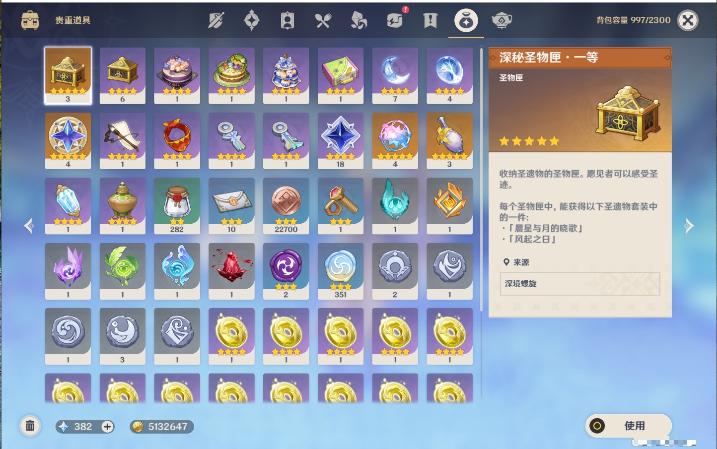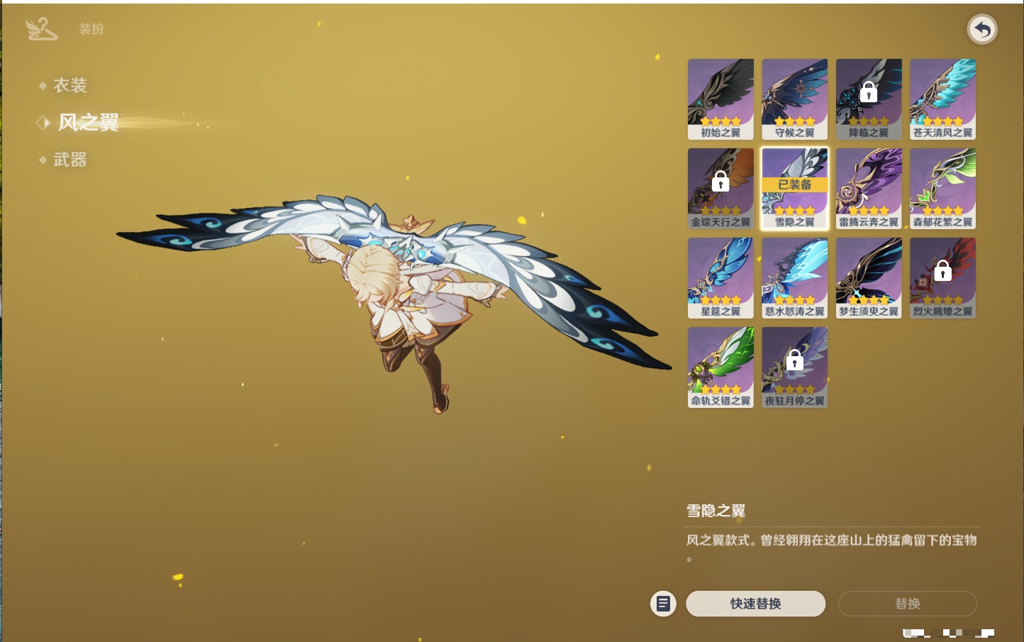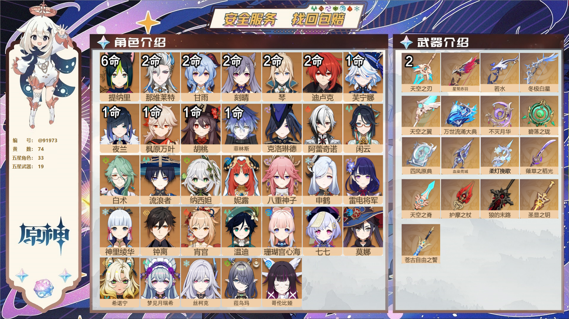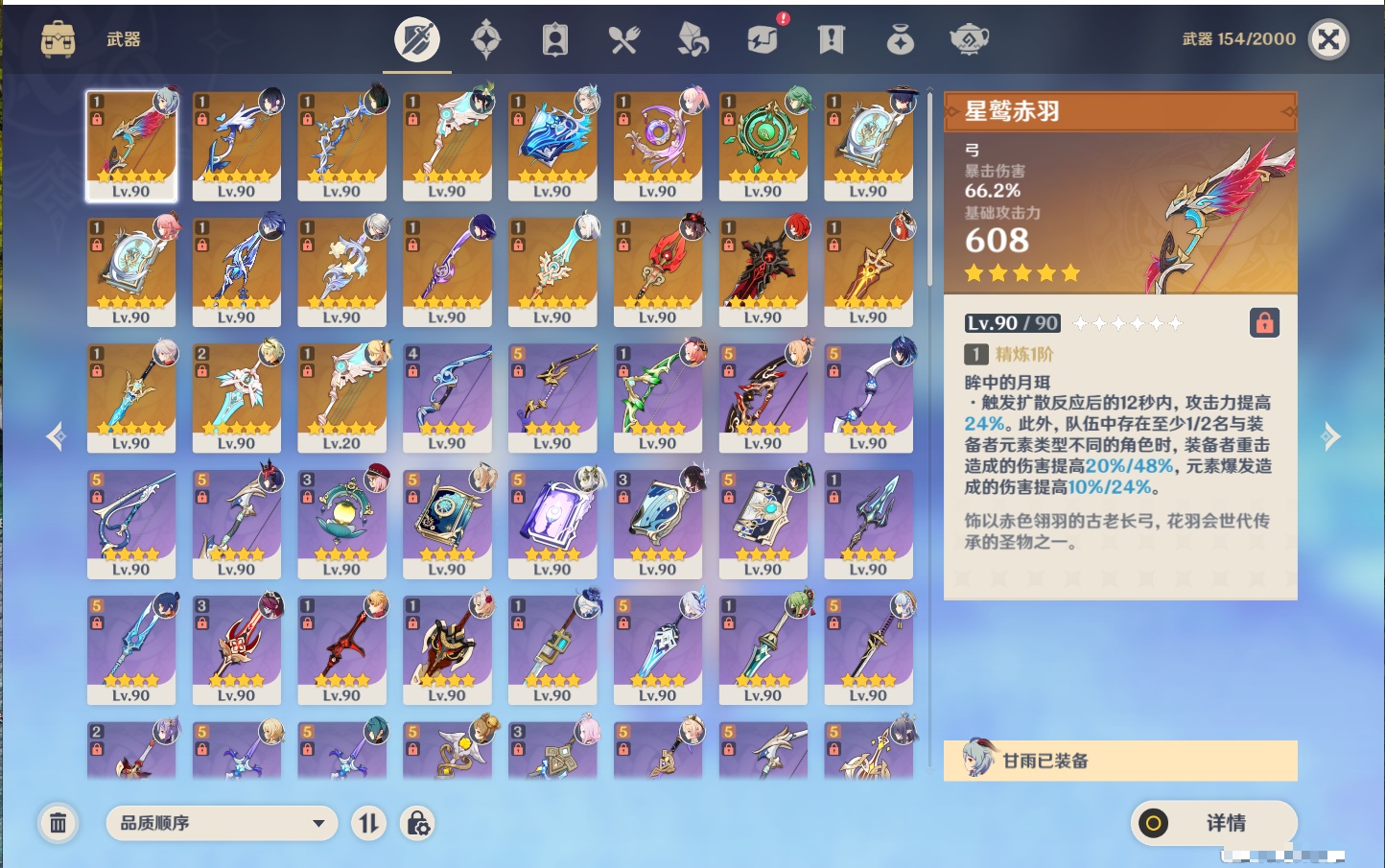 【19个五星武器】,精2天空之刃,精1星鹫赤羽,精1若水,精1冬极白星,精1天空之翼,精1万世流涌大典,精1不灭月华,精1碧落之珑,精1四风原典,精1血染荒城,精1柔灯挽歌,精1薙草之稻光,精1天空之脊,精1护摩之杖,精1狼的末路,精1圣显之钥,精1苍古自由之誓,