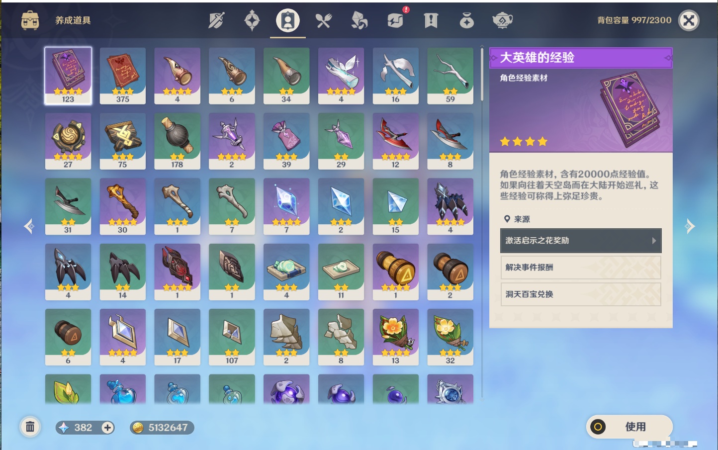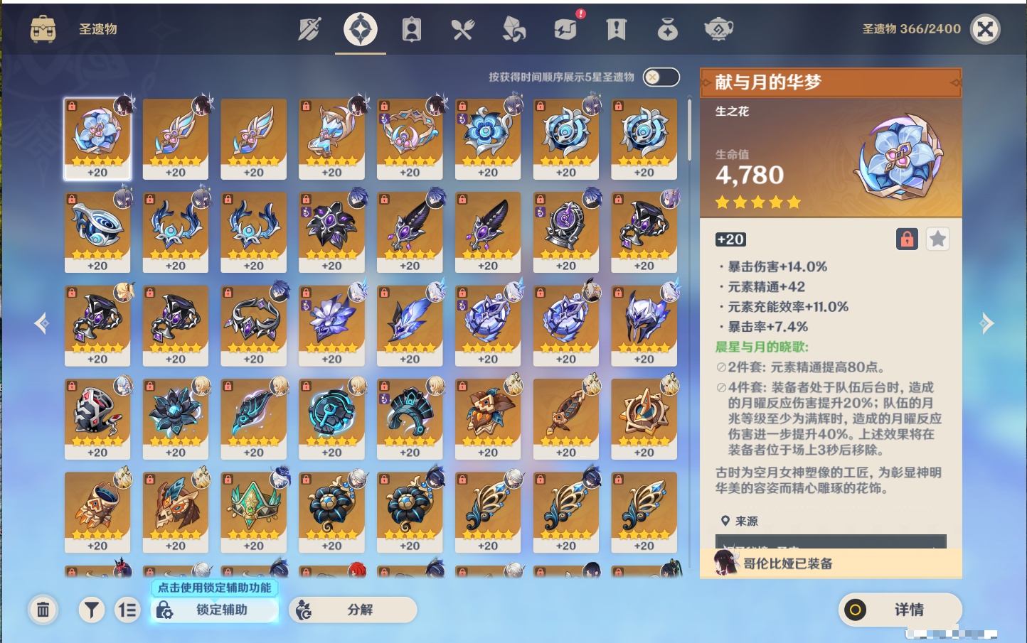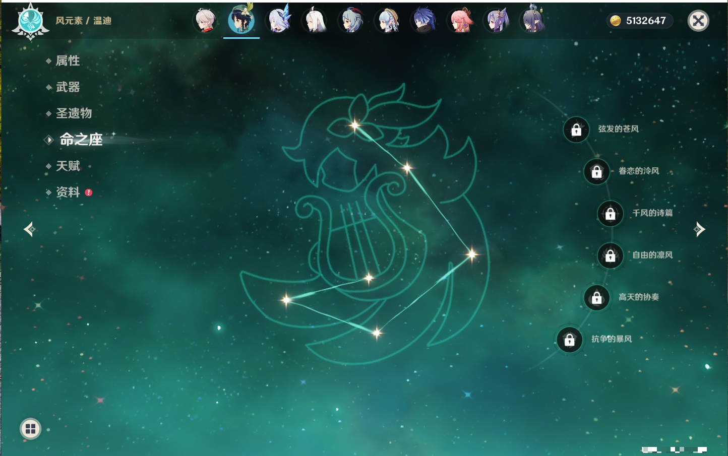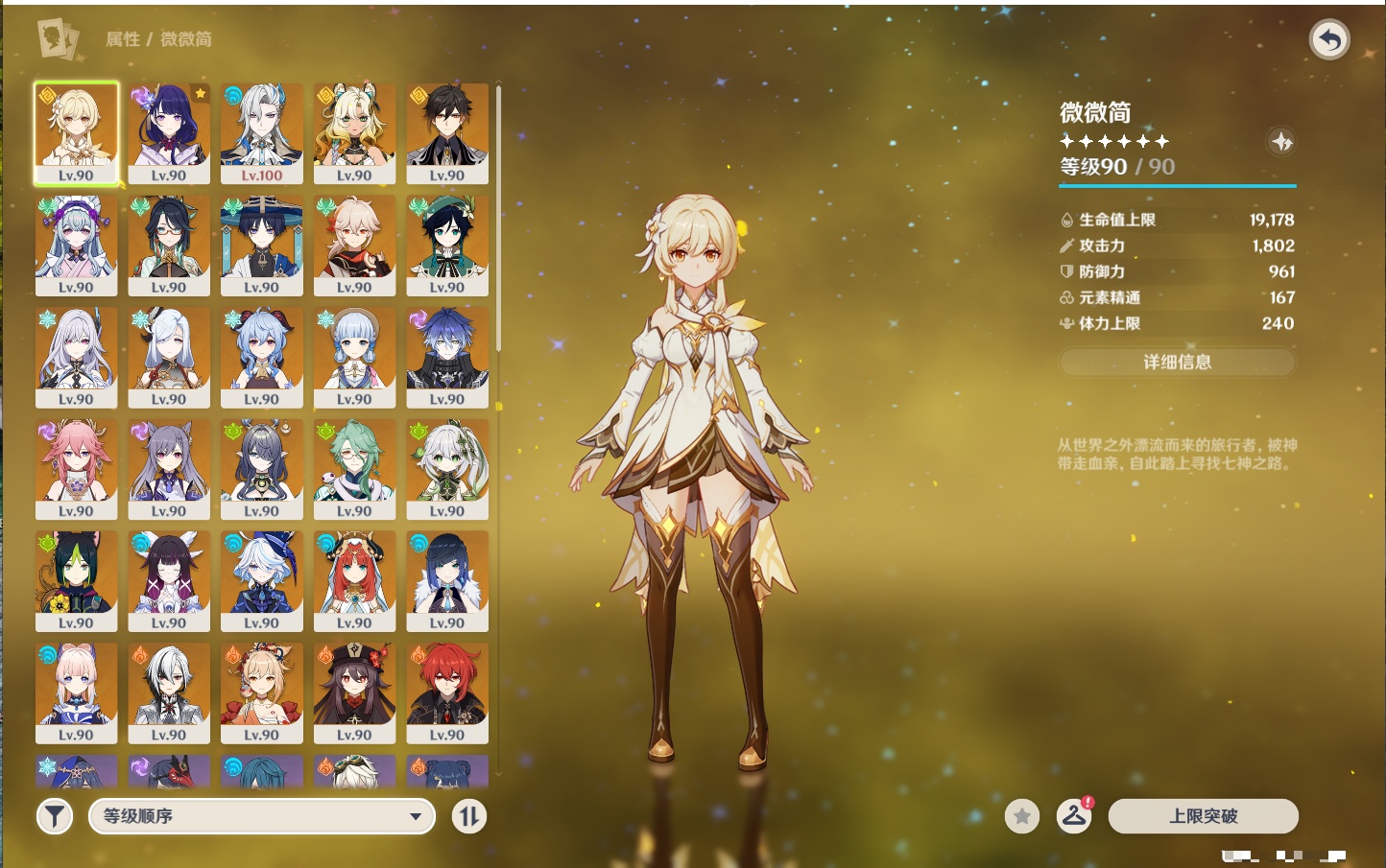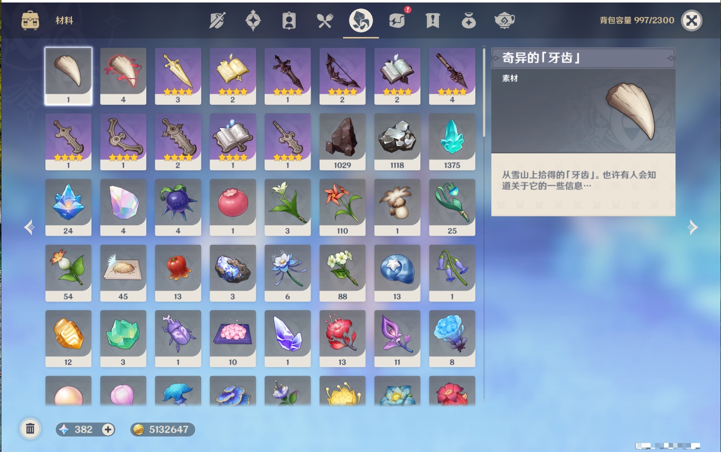 【19个五星武器】,精2天空之刃,精1星鹫赤羽,精1若水,精1冬极白星,精1天空之翼,精1万世流涌大典,精1不灭月华,精1碧落之珑,精1四风原典,精1血染荒城,精1柔灯挽歌,精1薙草之稻光,精1天空之脊,精1护摩之杖,精1狼的末路,精1圣显之钥,精1苍古自由之誓,