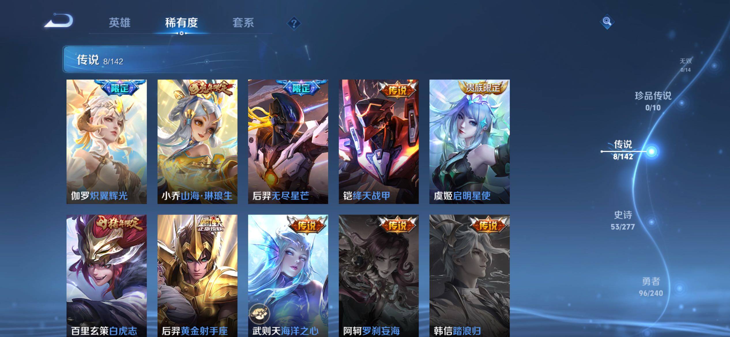 【传说皮肤】:伽罗炽翼辉光,小乔山海琳琅生,后羿无尽星芒,铠绛天战甲,虞姬启明星使,百里玄策白虎志,后羿黄金射手座,武则天海洋之心