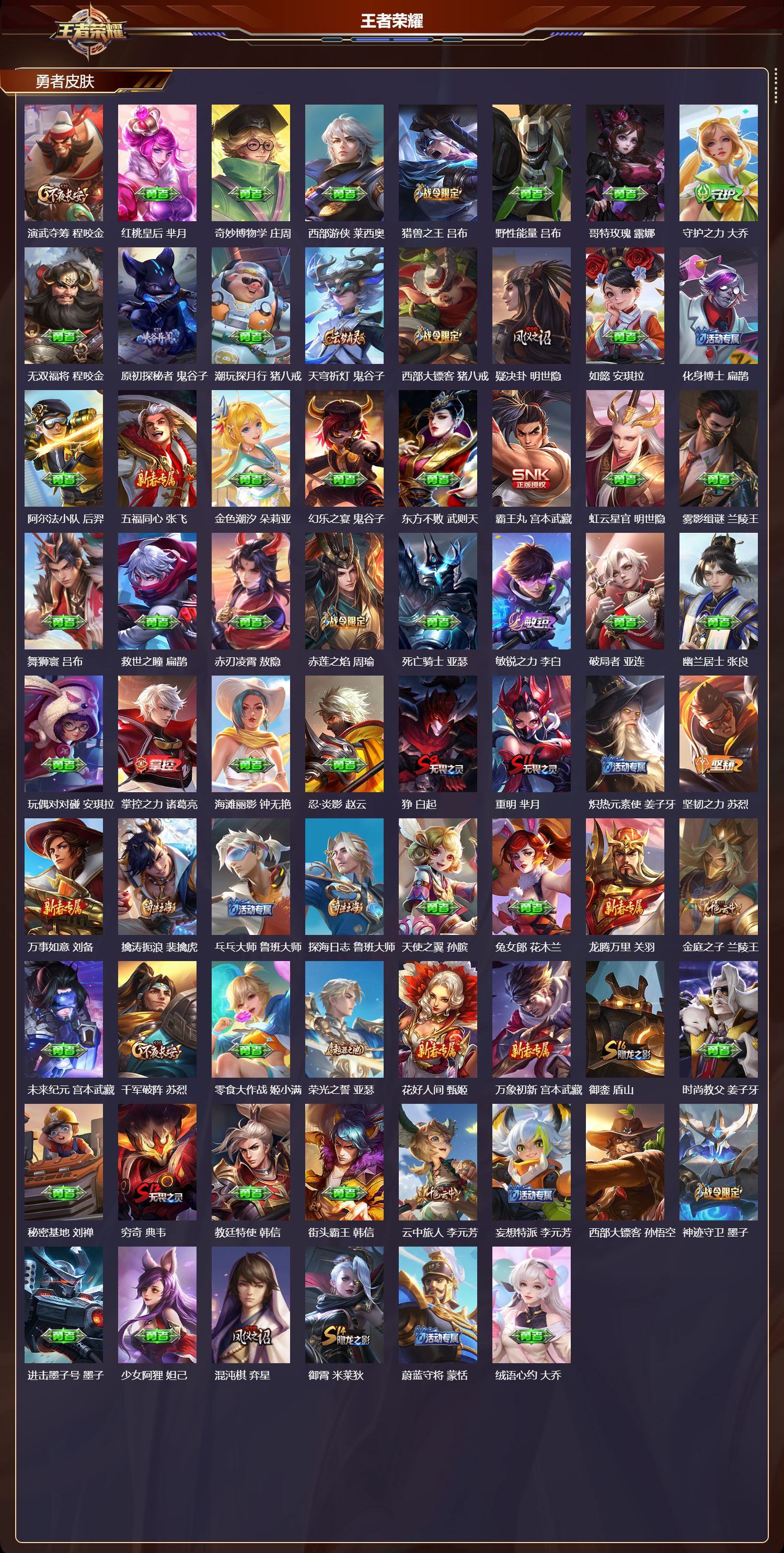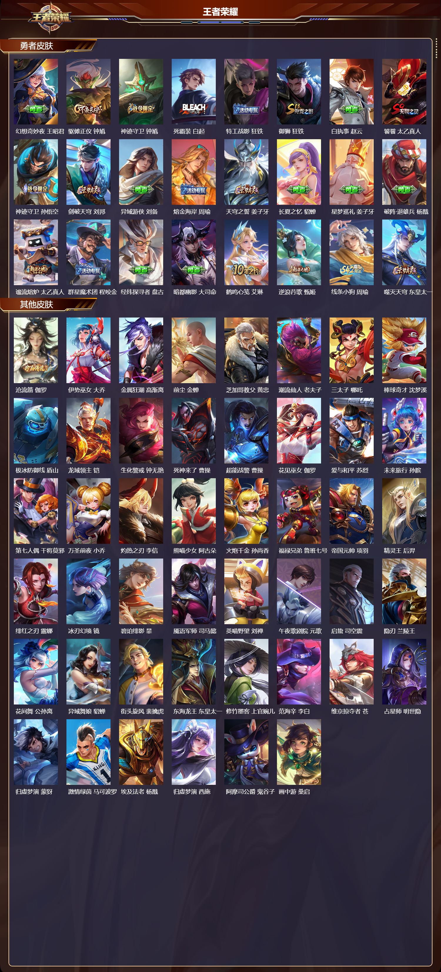 【133,勇者皮肤】时空谍影,海诺,圆桌骑士,盾山,烛龙,曹操,爱心护理,阿轲,太极少年,赵怀真,星际陆战队,达摩,沙漠行僧,达摩,大漠名商,沈梦溪,缤纷绘卷,张良,纽约教父,刘备,拳王,达摩,大发明家,达摩,龙舞盛年,沈梦溪,丁香结,小乔,功夫炙烤,廉颇,铁甲之心,典韦,沉稳之力,孙尚香,海盐诗旅,桑启,幻泉雾影,海月,朔风刀,夏侯惇,醍醐杖,老夫子,朔望之晖,女娲,归虚梦演,孙膑,汉昭烈帝,刘备,热血海滩,哪吒,白色死神,白起,黑桃队长,鲁班七号,黄金武士,典韦,御旌,牛魔,阴阳师,狄仁杰,致命风华,阿轲,次元突破,哪吒,古海寻踪,张良,科学大爆炸,项羽,功夫老勺,老夫子,西部大镖客,牛魔,鲨炮海盗猫,沈梦溪,海滩派对,项羽,万华元夜,狄仁杰,演武夺筹,程咬金,红桃皇后,芈月,奇妙博物学,庄周,西部游侠,莱西奥,猎兽之王,吕布,野性能量,吕布,哥特玫瑰,露娜,守护之力,大乔,无双福将,程咬金,原初探秘者,鬼谷子,潮玩探月行,猪八戒,天穹祈灯,鬼谷子,西部大镖客,猪八戒,疑决卦,明世隐,如懿,安琪拉,化身博士,扁鹊,阿尔法小队,后羿,五福同心,张飞,金色潮汐,朵莉亚,幻乐之宴,鬼谷子,东方不败,武则天,霸王丸,宫本武藏,虹云星官,明世隐,雾影缉谜,兰陵王,舞狮寰,吕布,救世之瞳,扁鹊,赤刃凌霄,敖隐,赤莲之焰,周瑜,死亡骑士,亚瑟,敏锐之力,李白,破局者,亚连,幽兰居士,张良,玩偶对对碰,安琪拉,掌控之力,诸葛亮,海滩丽影,钟无艳,忍·炎影,赵云,狰,白起,重明,芈月,炽热元素使,姜子牙,坚韧之力,苏烈,万事如意,刘备,擒涛扼浪,裴擒虎,乓乓大师,鲁班大师,探海日志,鲁班大师,天使之翼,孙膑,兔女郎,花木兰,龙腾万里,关羽,金庭之子,兰陵王,未来纪元,宫本武藏,千军破阵,苏烈,零食大作战,姬小满,荣光之誓,亚瑟,花好人间,甄姬,万象初新,宫本武藏,御銮,盾山,时尚教父,姜子牙,秘密基地,刘禅,穷奇,典韦,教廷特使,韩信,街头霸王,韩信,云中旅人,李元芳,妄想特派,李元芳,西部大镖客,孙悟空,神迹守卫,墨子,进击墨子号,墨子,少女阿狸,妲己,混沌棋,弈星,御霄,米莱狄,蔚蓝守将,蒙恬,绒语心约,大乔,幻想奇妙夜,王昭君,驱傩正仪,钟馗,神迹守卫,钟馗,死霸装,白起,特工战影,狂铁,御狮,狂铁,白执事,赵云,饕餮,太乙真人,神迹守卫,孙悟空,剑破天穹,刘邦,异域游侠,刘备,熔金海岸,周瑜,天穹之誓,姜子牙,长夏之忆,貂蝉,星梦巡礼,姜子牙,破阵·退雄兵,杨戬,谧流熔炉,太乙真人,群星魔术团,程咬金,经纬探寻者,盘古,暗都幽影,大司命,鹤鸣心笺,艾琳,逆浪荇歌,甄姬,线条小狗,周瑜,噬灭天穹,东皇太一,