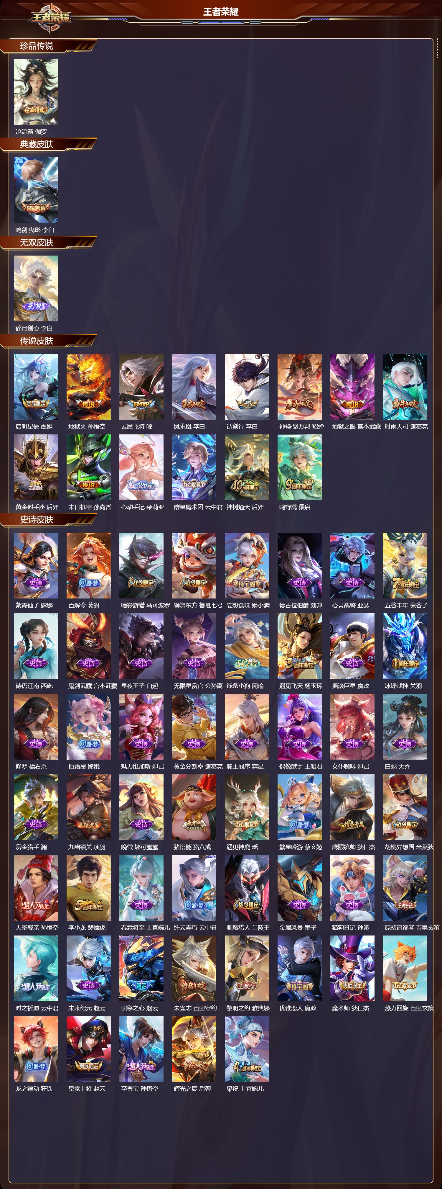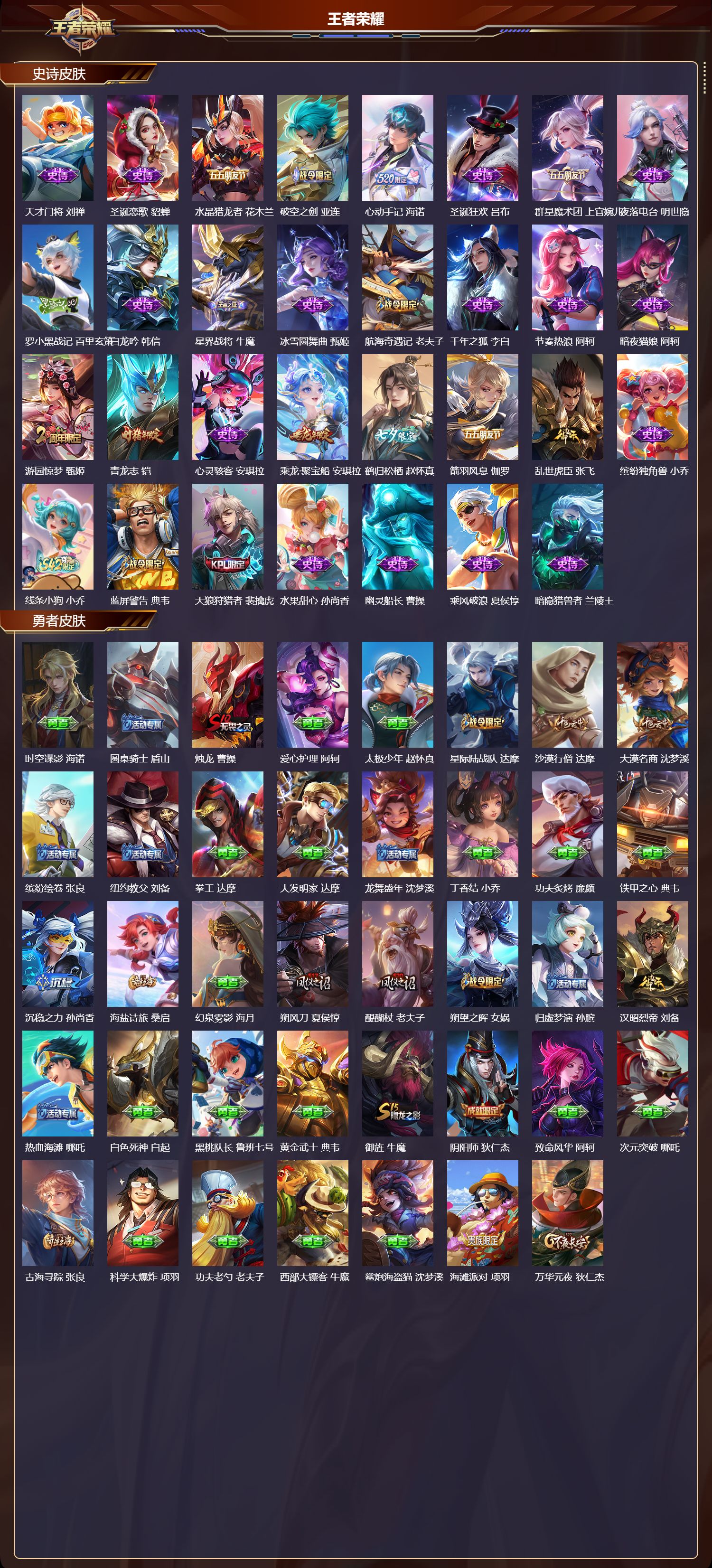 【84,史诗皮肤】紫霞仙子,露娜,百解令,蒙犽,暗影游猎,马可波罗,狮舞东方,鲁班七号,妄想食味,姬小满,德古拉伯爵,刘邦,心灵战警,亚瑟,五谷丰年,鬼谷子,诗语江南,西施,鬼剑武藏,宫本武藏,星夜王子,白起,无限星赏官,公孙离,线条小狗,周瑜,遇见飞天,杨玉环,摇滚巨星,嬴政,冰锋战神,关羽,修罗,橘右京,拒霜思,嫦娥,魅力维加斯,妲己,黄金分割率,诸葛亮,滕王阁序,弈星,偶像歌手,王昭君,女仆咖啡,妲己,白蛇,大乔,赏金猎手,澜,九幽镇关,项羽,晚萤,娜可露露,猪悟能,猪八戒,遇见神鹿,瑶,繁星吟游,蔡文姬,鹰眼统帅,狄仁杰,胡桃异想国,米莱狄,大圣娶亲,孙悟空,李小龙,裴擒虎,春霖将至,上官婉儿,纤云弄巧,云中君,驯魔猎人,兰陵王,金属风暴,墨子,猫狗日记,孙策,原初追逐者,百里玄策,时之祈愿,云中君,未来纪元,赵云,引擎之心,赵云,朱雀志,百里守约,黎明之约,雅典娜,优雅恋人,嬴政,魔术师,狄仁杰,热力回旋,百里玄策,龙之律动,狂铁,皇家上将,赵云,至尊宝,孙悟空,辉光之辰,后羿,梁祝,上官婉儿,天才门将,刘禅,圣诞恋歌,貂蝉,水晶猎龙者,花木兰,破空之剑,亚连,心动手记,海诺,圣诞狂欢,吕布,群星魔术团,上官婉儿,夜落电台,明世隐,罗小黑战记,百里玄策,白龙吟,韩信,星界战将,牛魔,冰雪圆舞曲,甄姬,航海奇遇记,老夫子,千年之狐,李白,节奏热浪,阿轲,暗夜猫娘,阿轲,游园惊梦,甄姬,青龙志,铠,心灵骇客,安琪拉,乘龙·聚宝船,安琪拉,鹤归松栖,赵怀真,箭羽风息,伽罗,乱世虎臣,张飞,缤纷独角兽,小乔,线条小狗,小乔,蓝屏警告,典韦,天狼狩猎者,裴擒虎,水果甜心,孙尚香,幽灵船长,曹操,乘风破浪,夏侯惇,暗隐猎兽者,兰陵王,