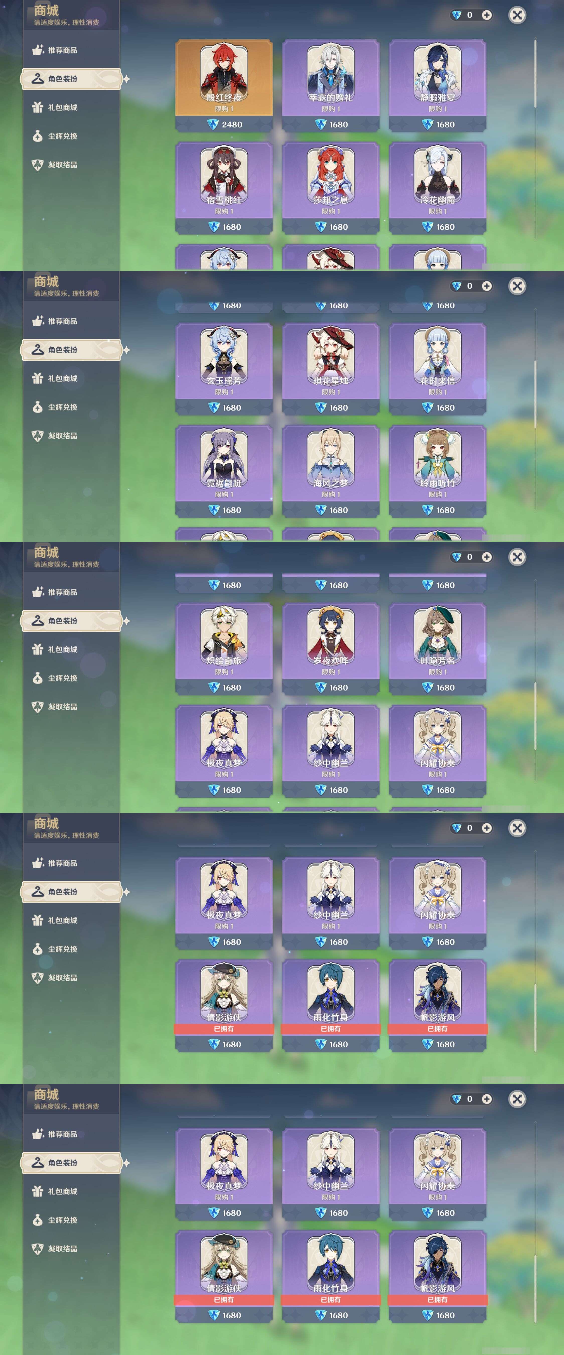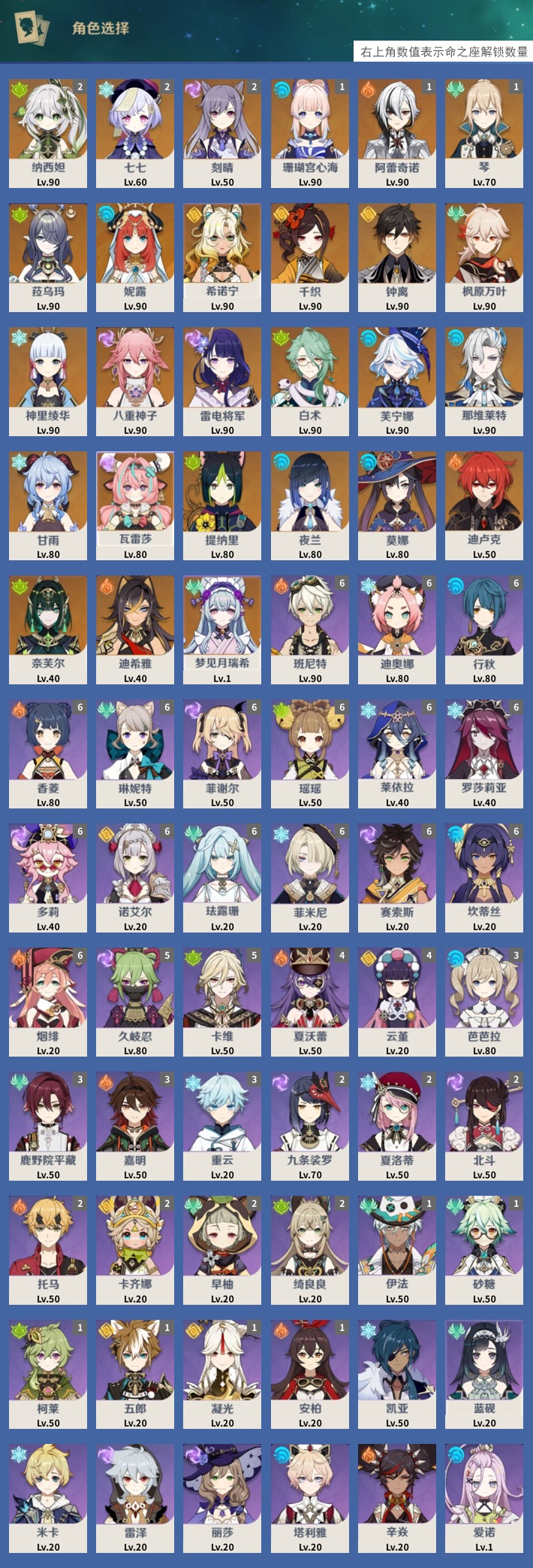 【27个五星角色】,2命纳西妲,2命七七,2命刻晴,1命珊瑚宫心海,1命阿蕾奇诺,1命琴,0命菈乌玛,0命妮露,0命希诺宁,0命千织,0命钟离,0命枫原万叶,0命神里绫华,0命八重神子,0命雷电将军,0命白术,0命芙宁娜,0命那维莱特,0命甘雨,0命瓦雷莎,0命提纳里,0命夜兰,0命莫娜,0命迪卢克,0命奈芙尔,0命迪希雅,0命梦见月瑞希,